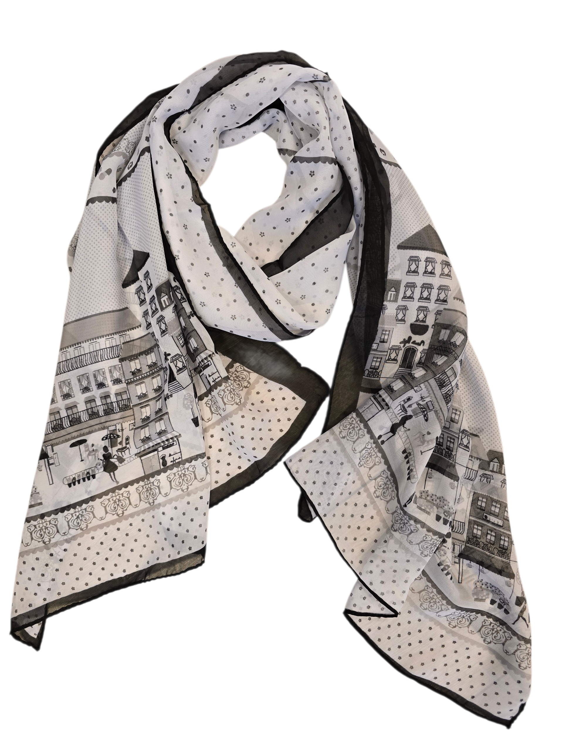 Fint tørklæde med dekorative bygninger og prikker.
