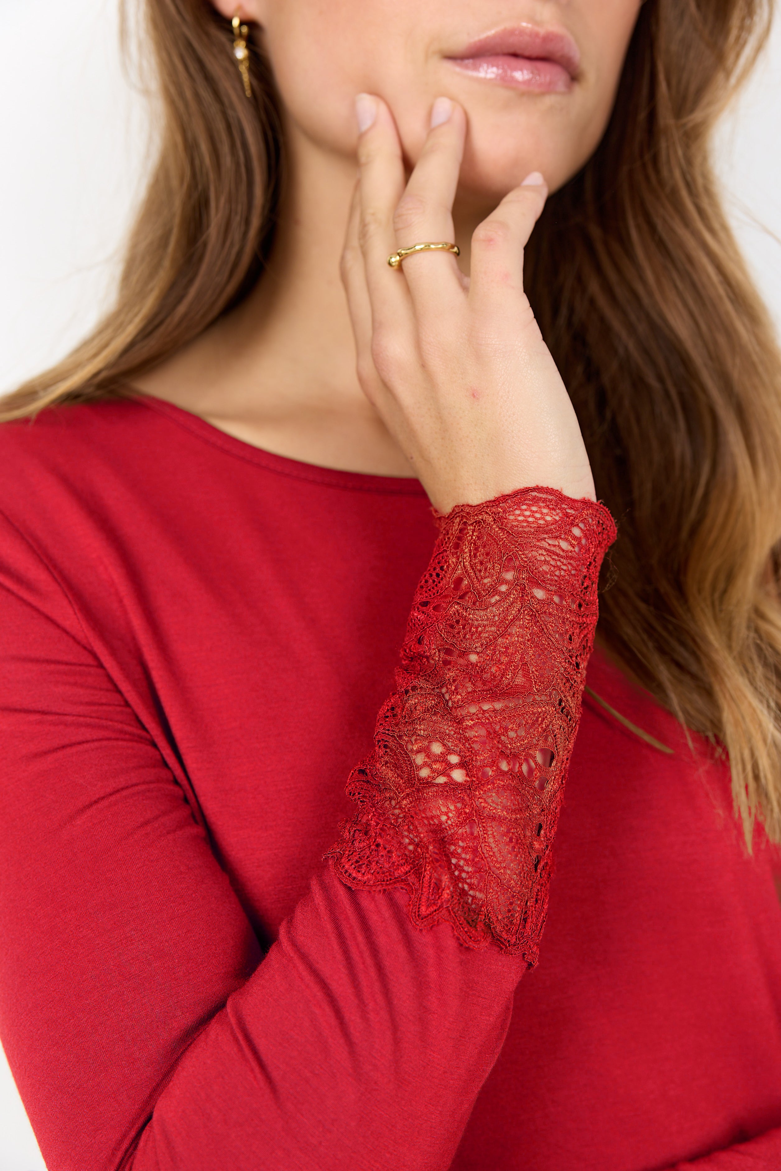Rød langærmet MARICA shirt med blonde på ærmet