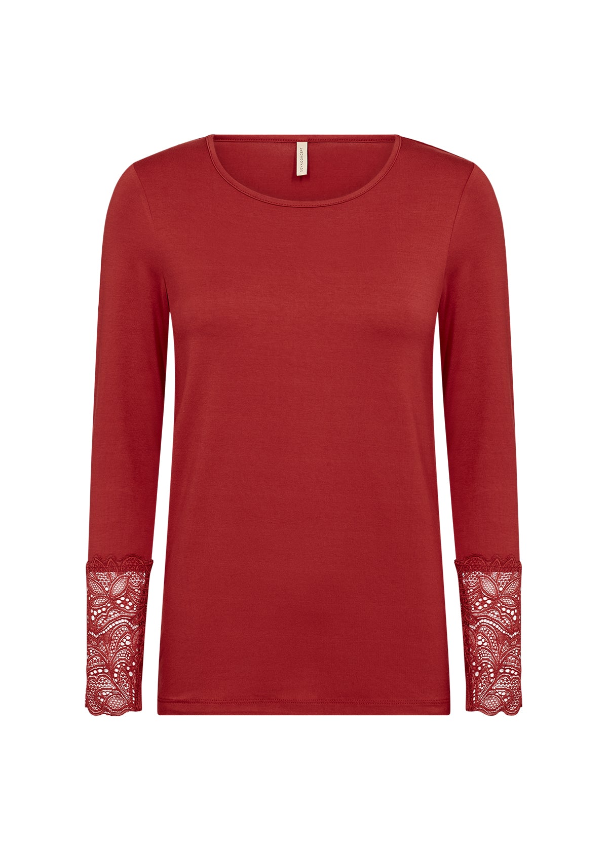 MARICA 226 fra SoyaConcept er en basis t-shirt med lange ærmer, der er fremstillet af en blanding af lyocell og elastan. T-shirten har en bådudskæring, lange ærmer med blondemanchetter og en tætsiddende pasform.