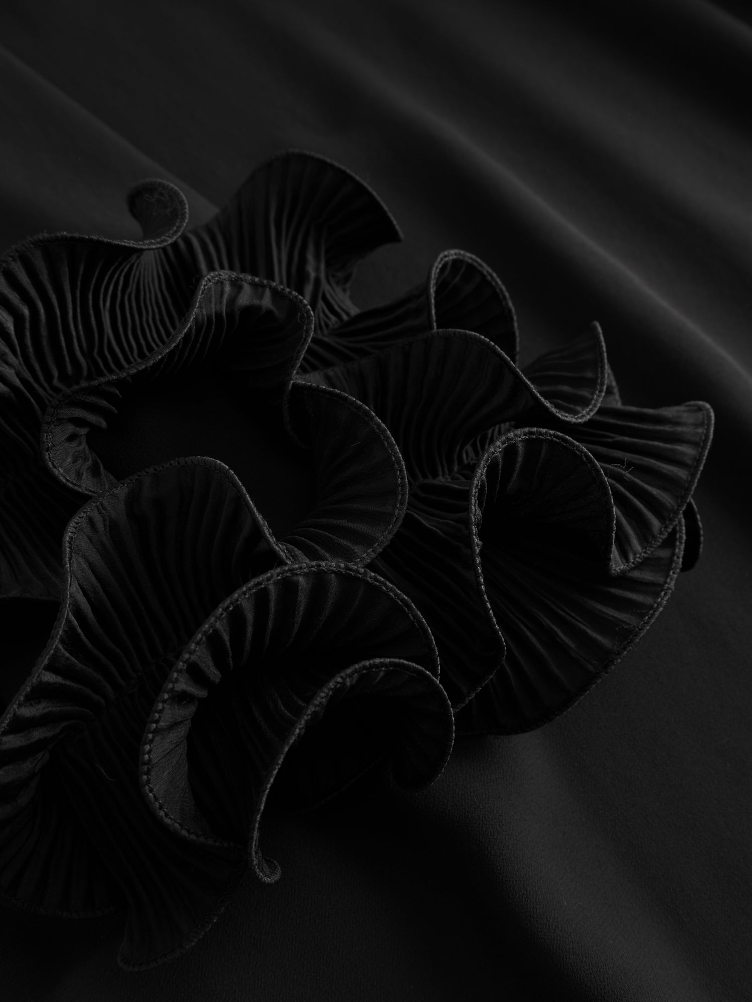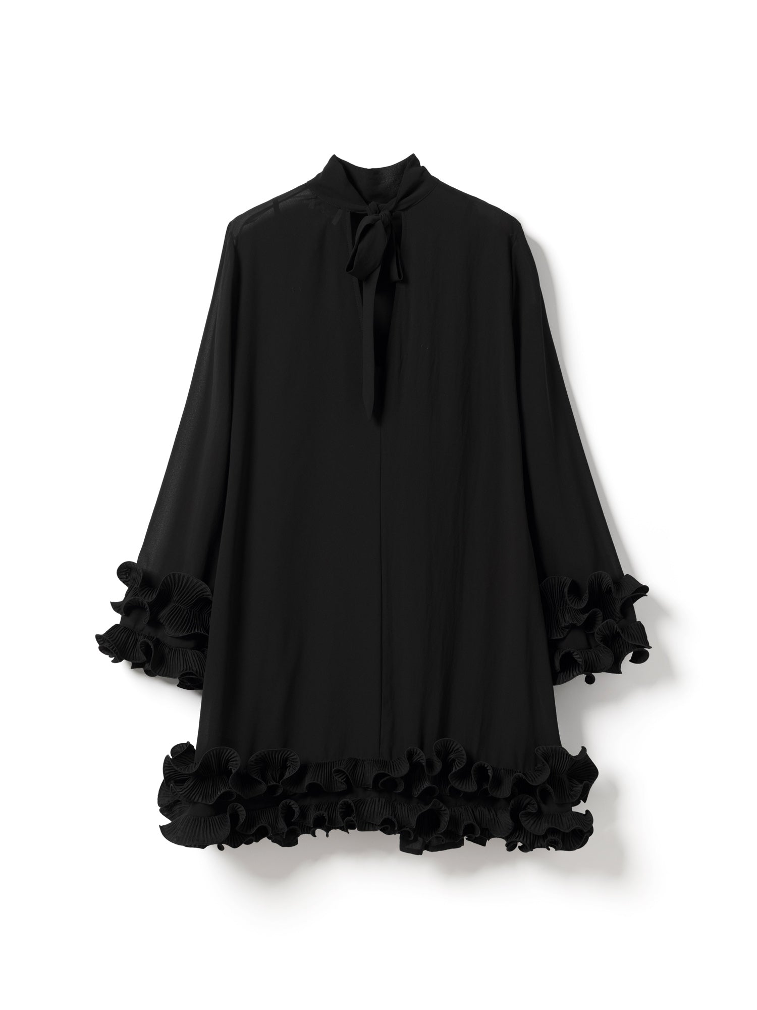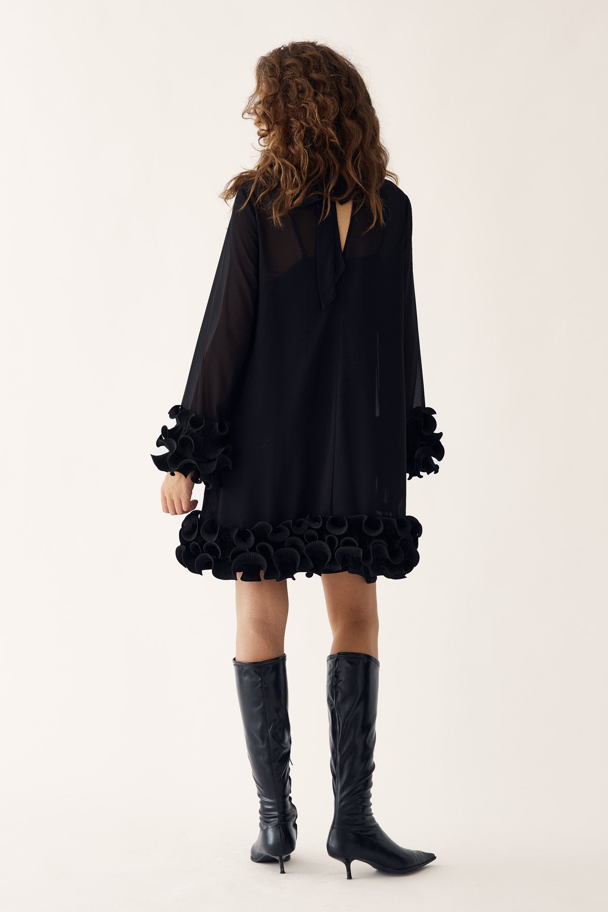LATANIA DRESS fra NOELLA er en smuk kort kjole med unik flæsedetalje for neden og ved ærmekanten. Kjolen har en løs pasform med høj rund hals, der lukkes med bindebånd i nakken. Materialet er let transparant, underkjole medfølger.