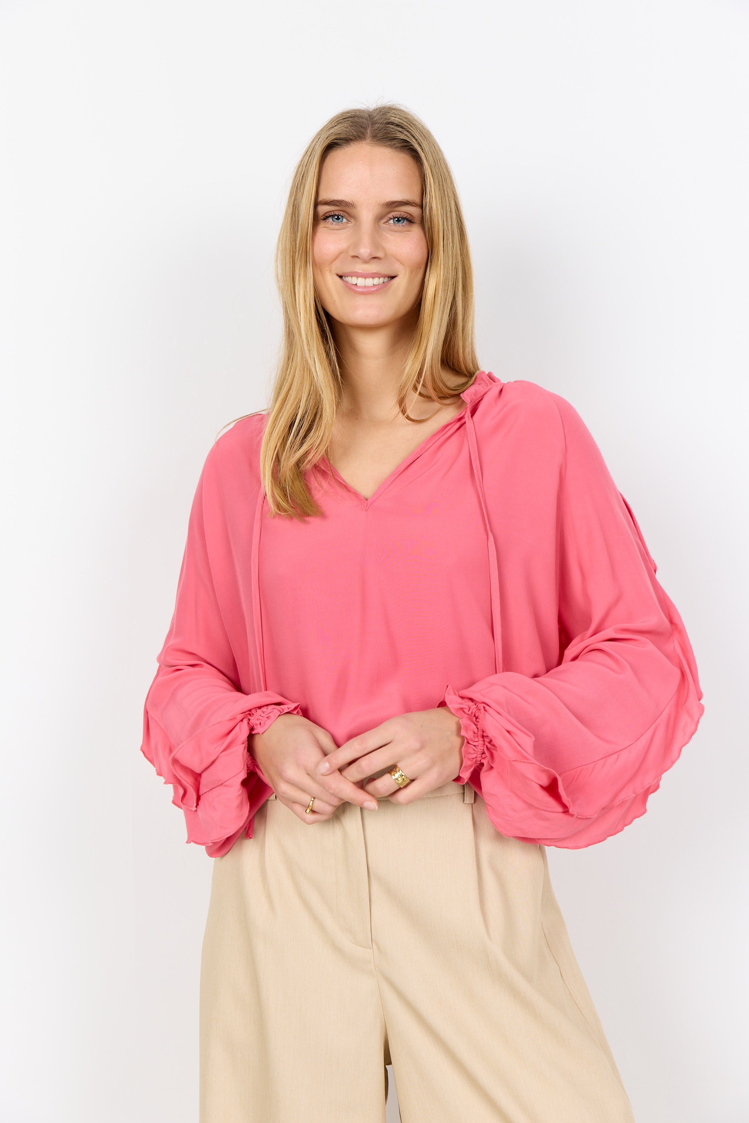 BARBEL 6 fra SOYACONCEPT er en bluse fremstillet af en blanding af 65 % LENZING™ ECOVERO™-viskose og 35 % genbrugspolyester. Denne elegante bluse har bindebånd i halsen, flæsekanter og lange ærmer med elastiske manchetter, der giver et elegant touch.