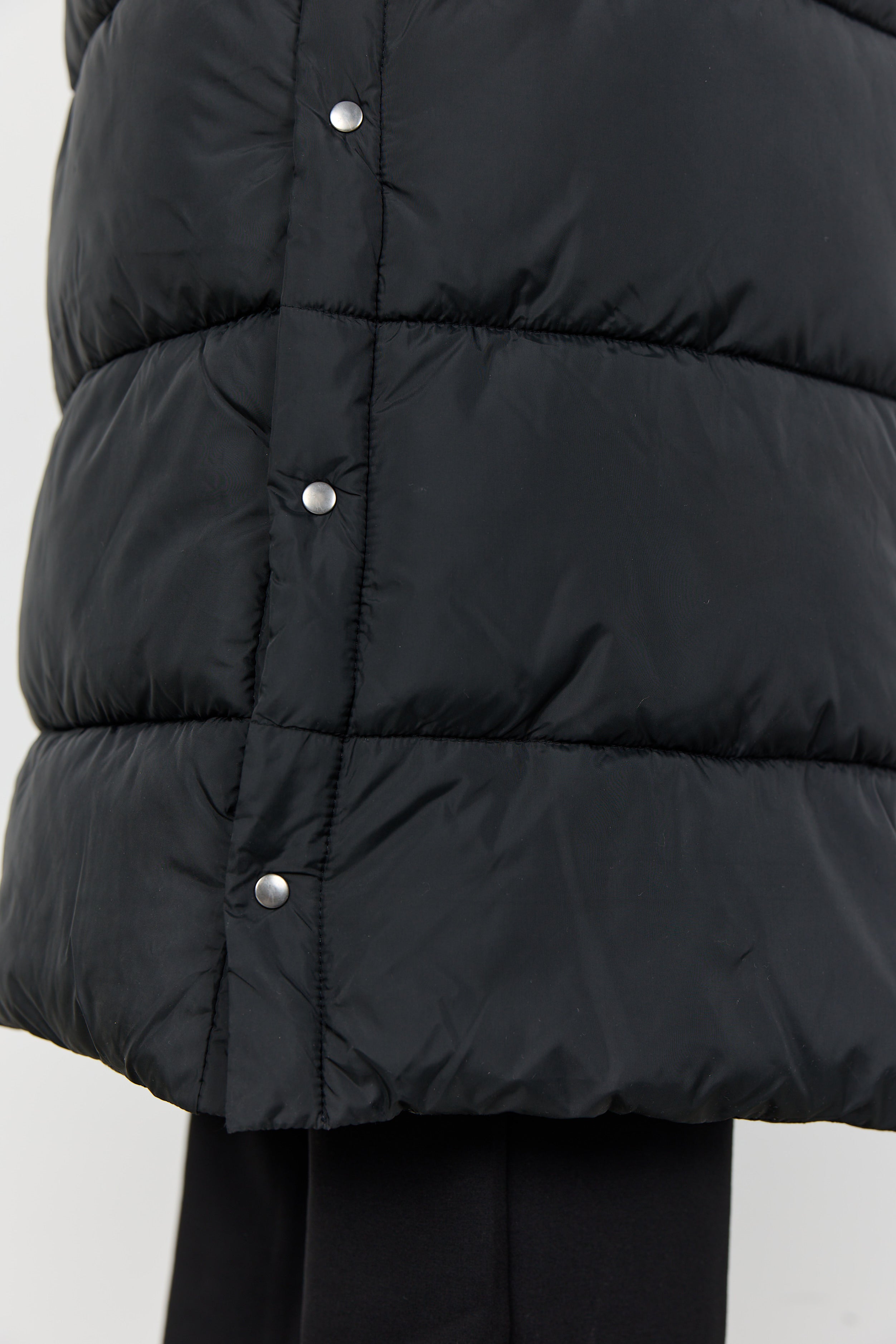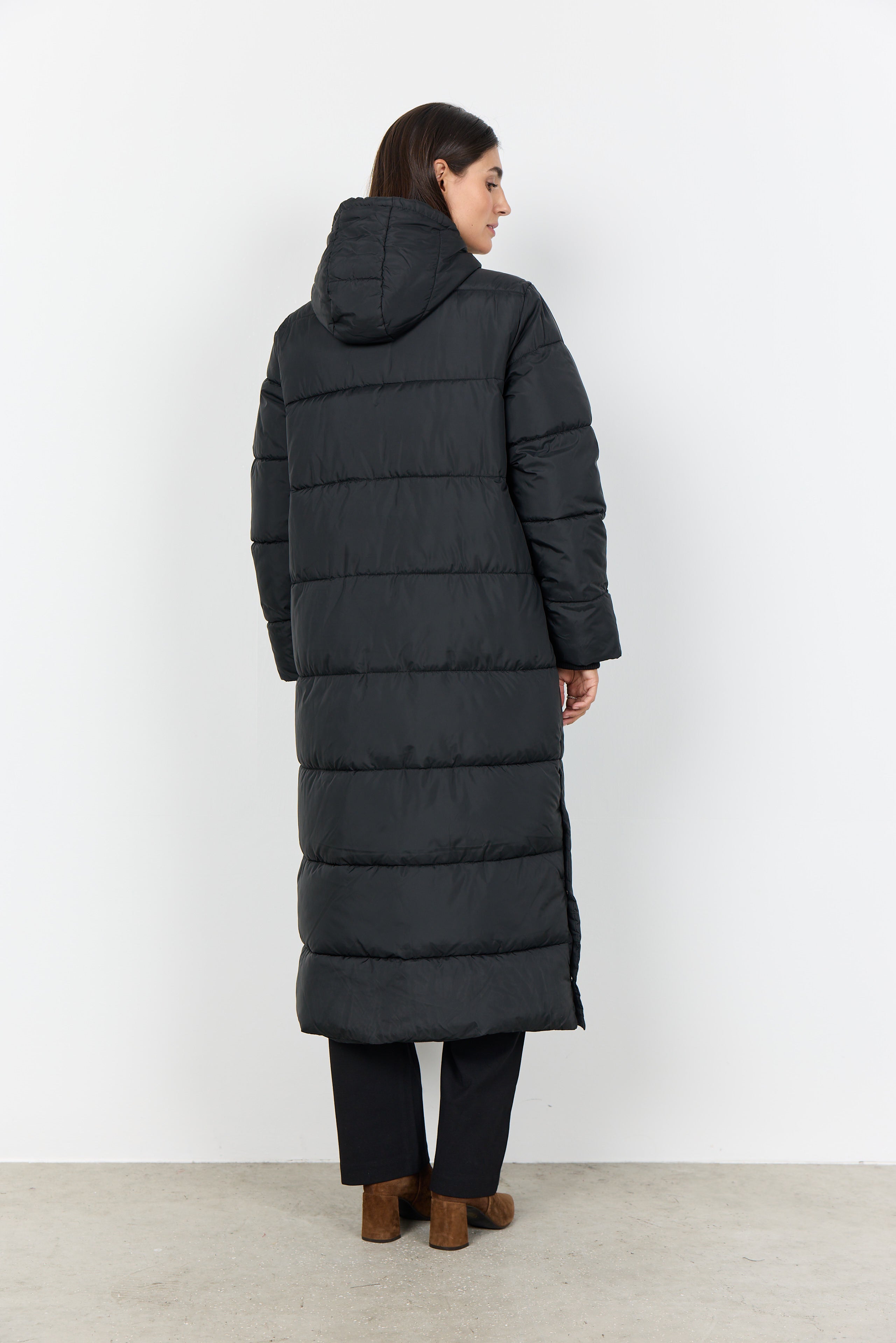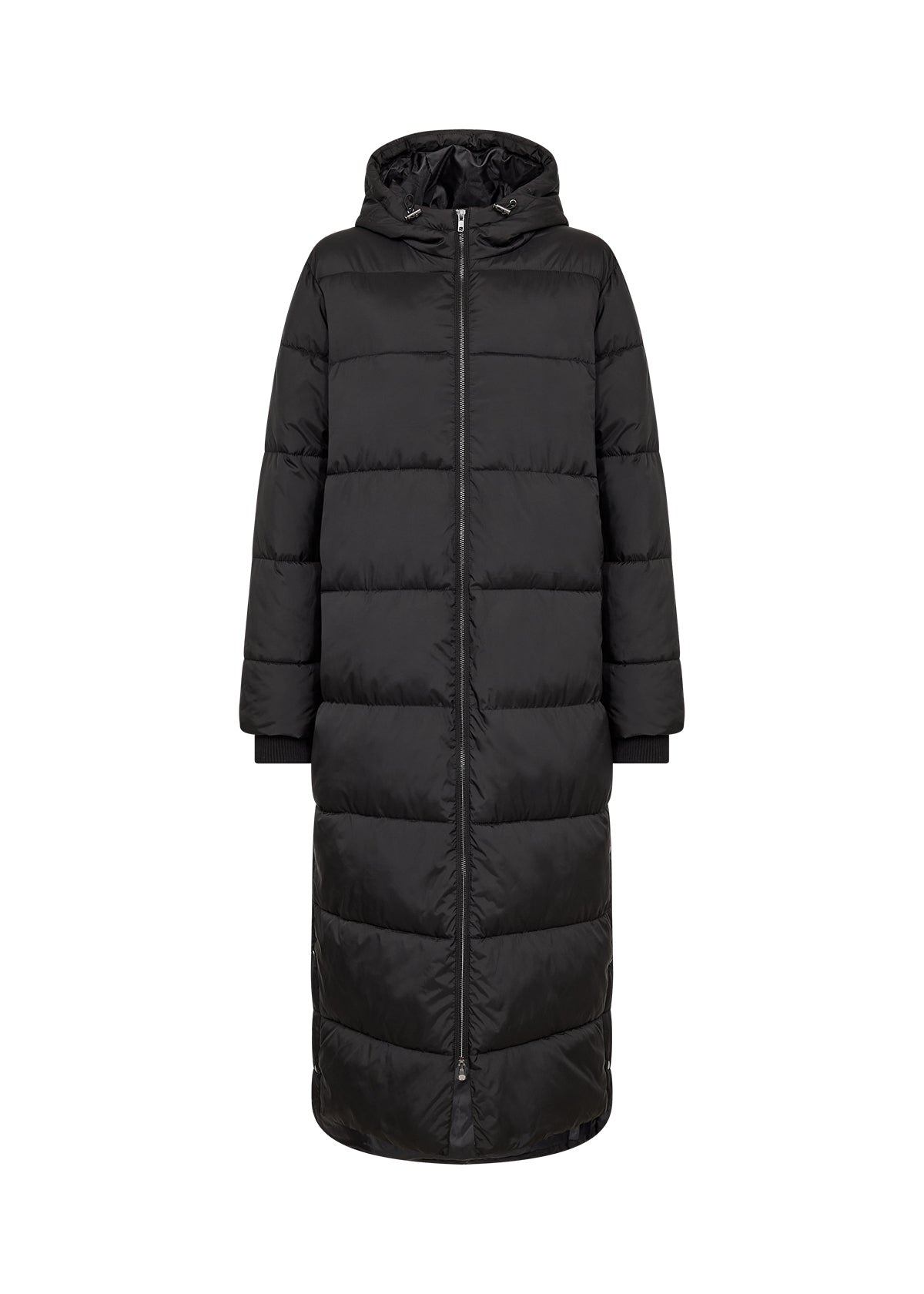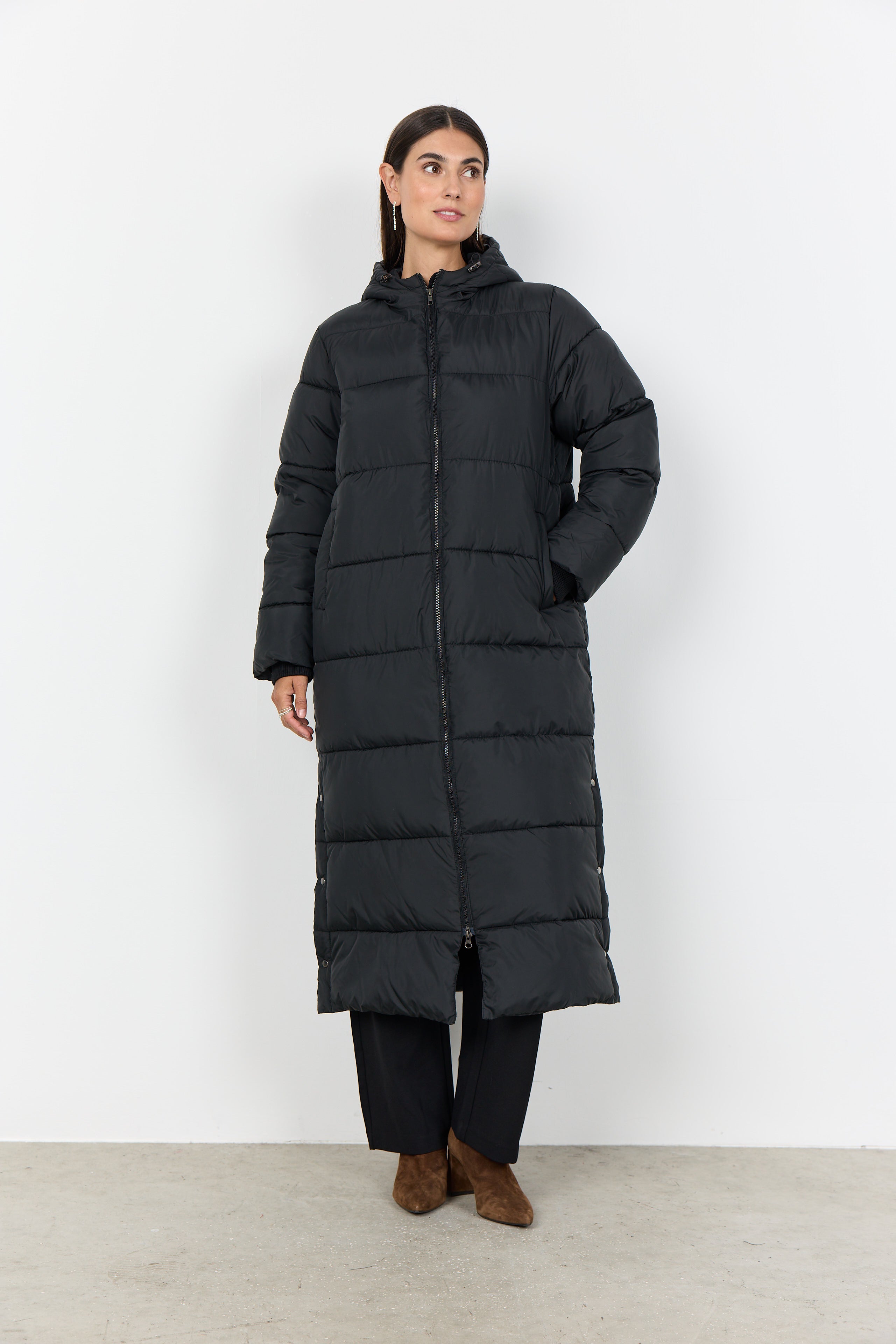 SC_SORINE 1 frakken fra SOYACONCEPT. Den har en krave med hætte, en lynlås i fuld længde og quiltede syninger, der giver et hyggeligt look. Praktisk åbning med trykknapper for neden i siderne.