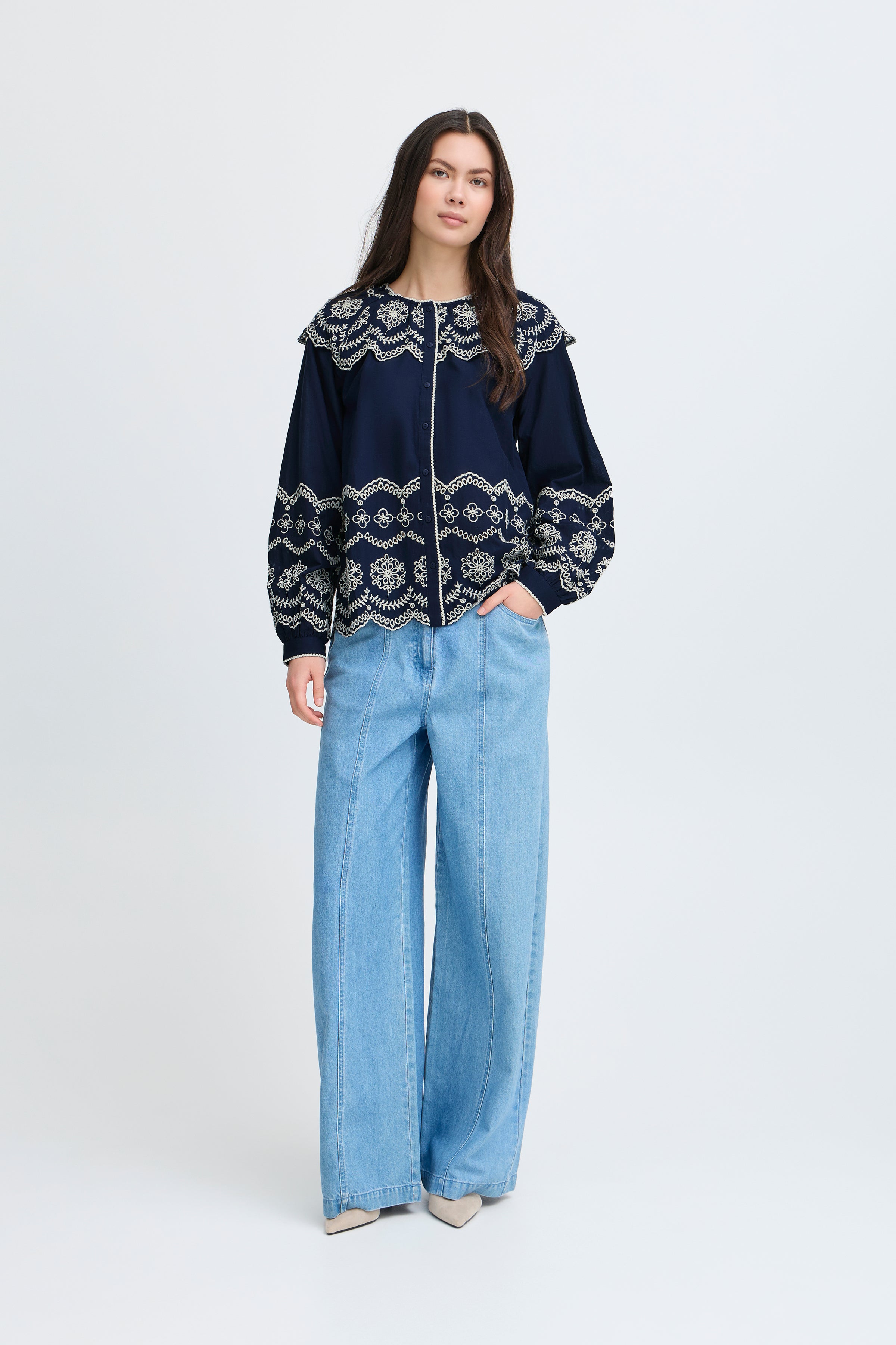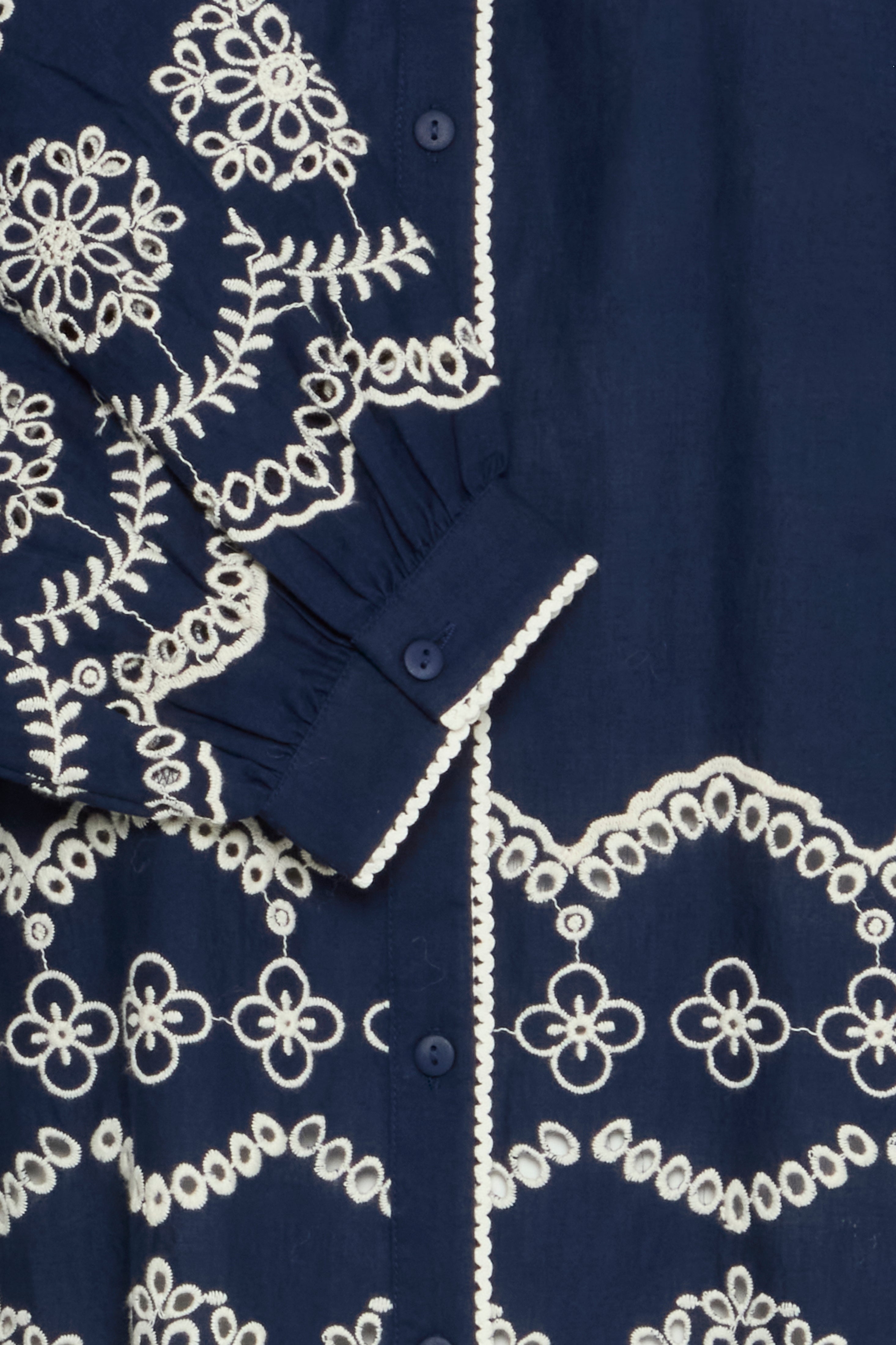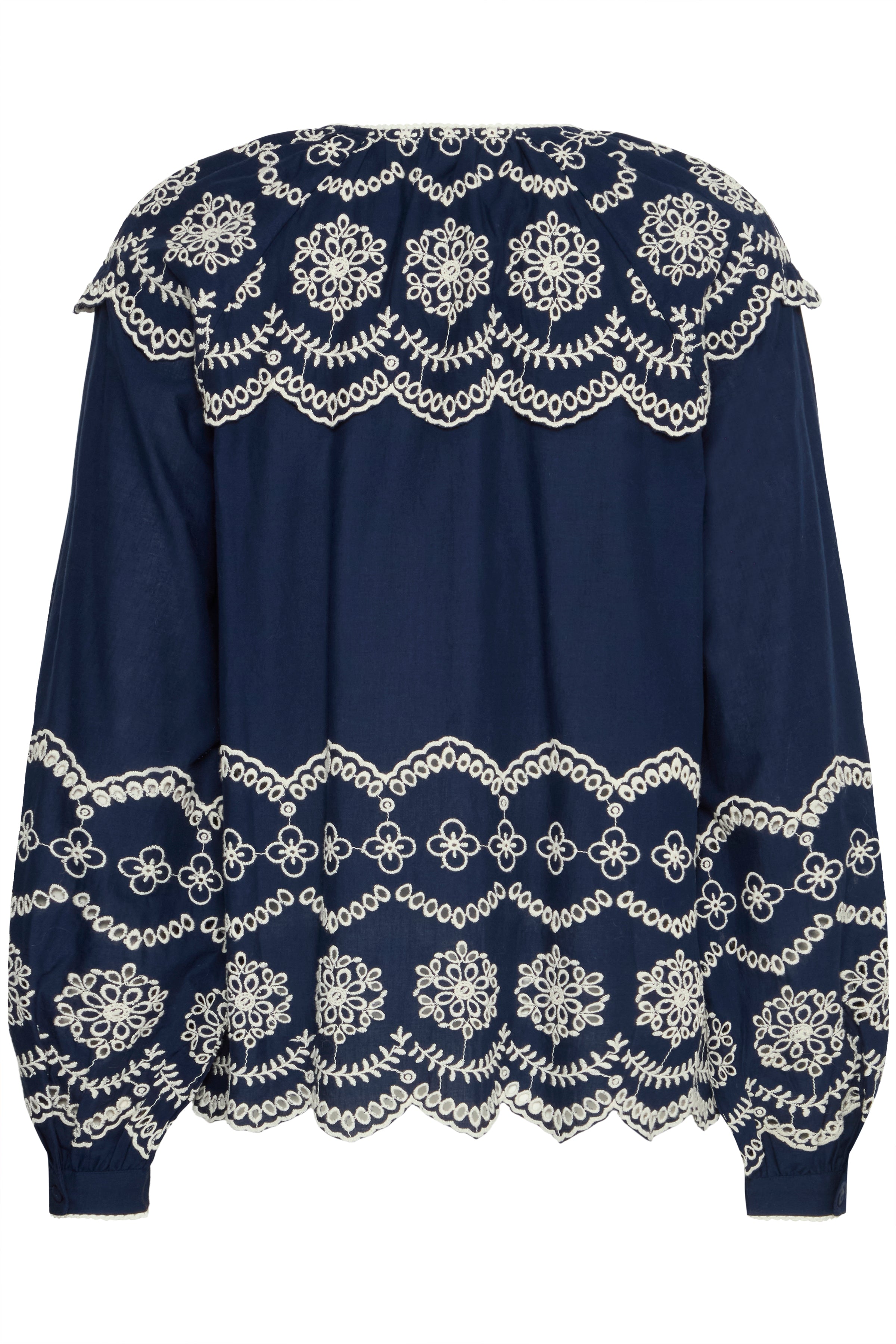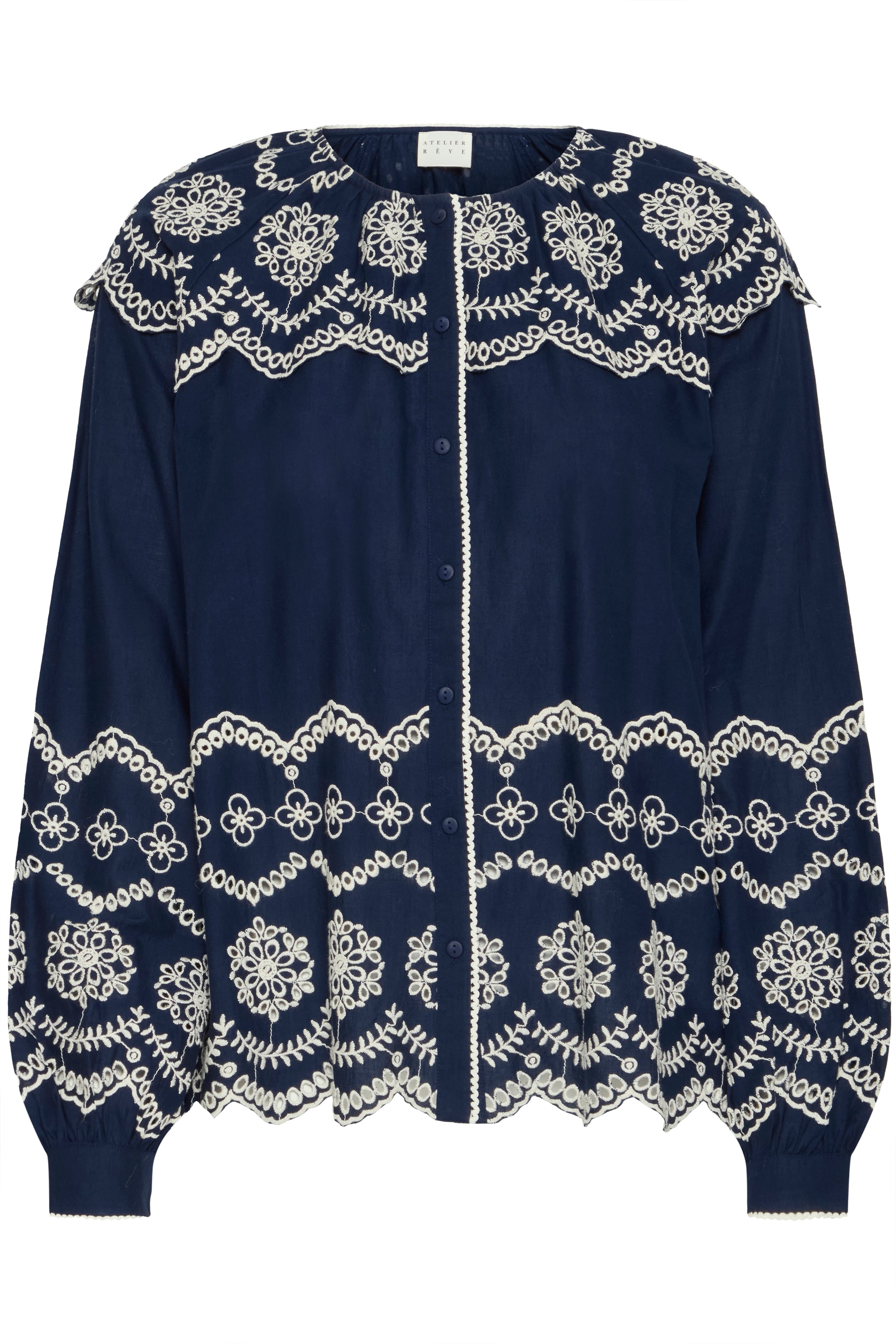 Mørkeblå Tanja skjorte fra Atelier Rêve, designet med fantastisk flotte broderier langs den store krave, forneden på ærmerne og ved nederste kant, der afsluttes med fine buer. Skjorten har rund hals, lange ærmer med smockmanchet og er gennemknappet.