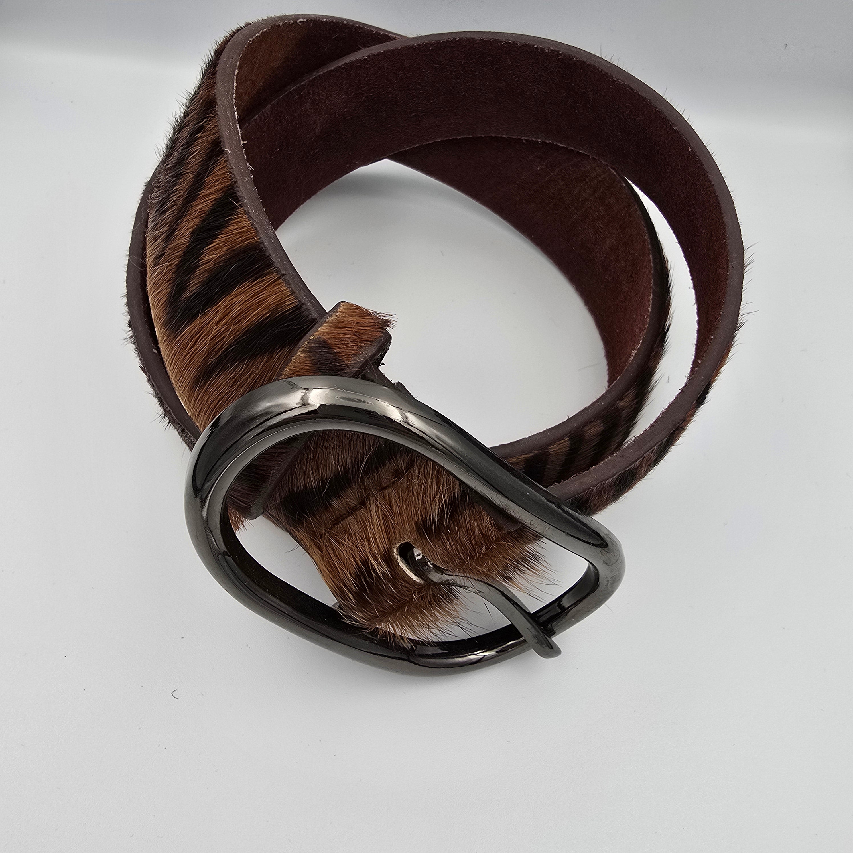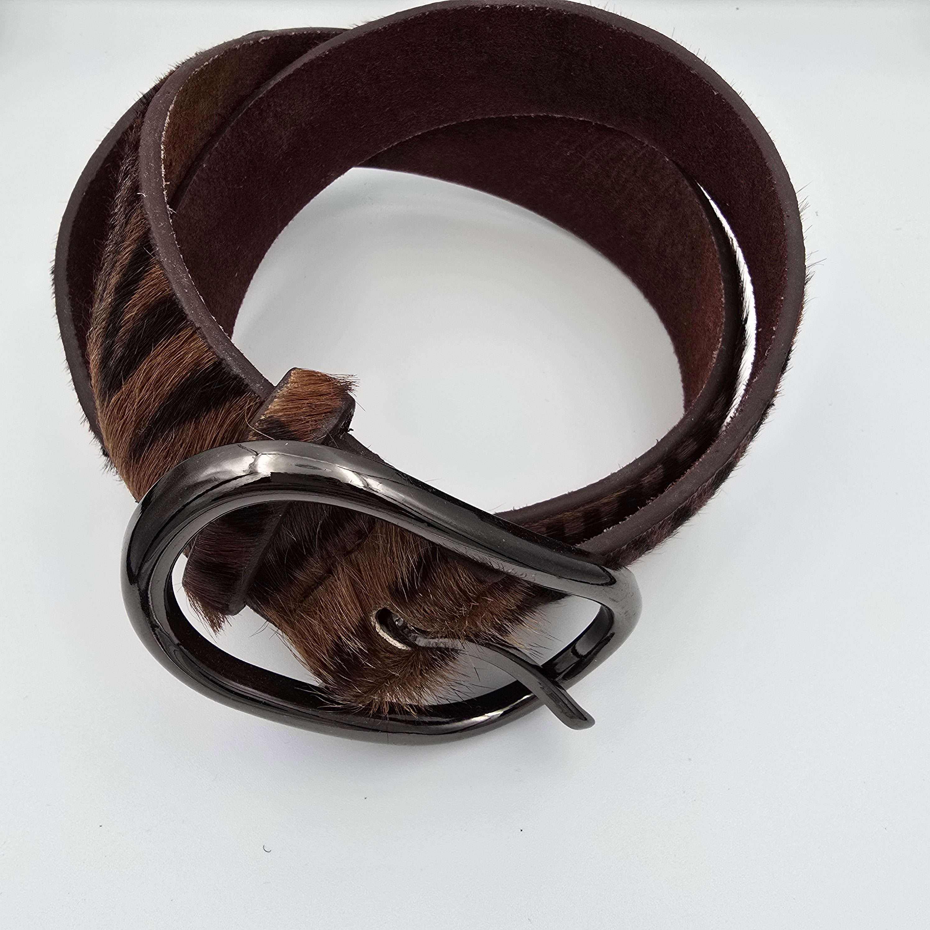 Et lækkert skindbælte i brun/sort med imiteret koskind. Bæltet er 4 cm bredt, og måler 90 cm.