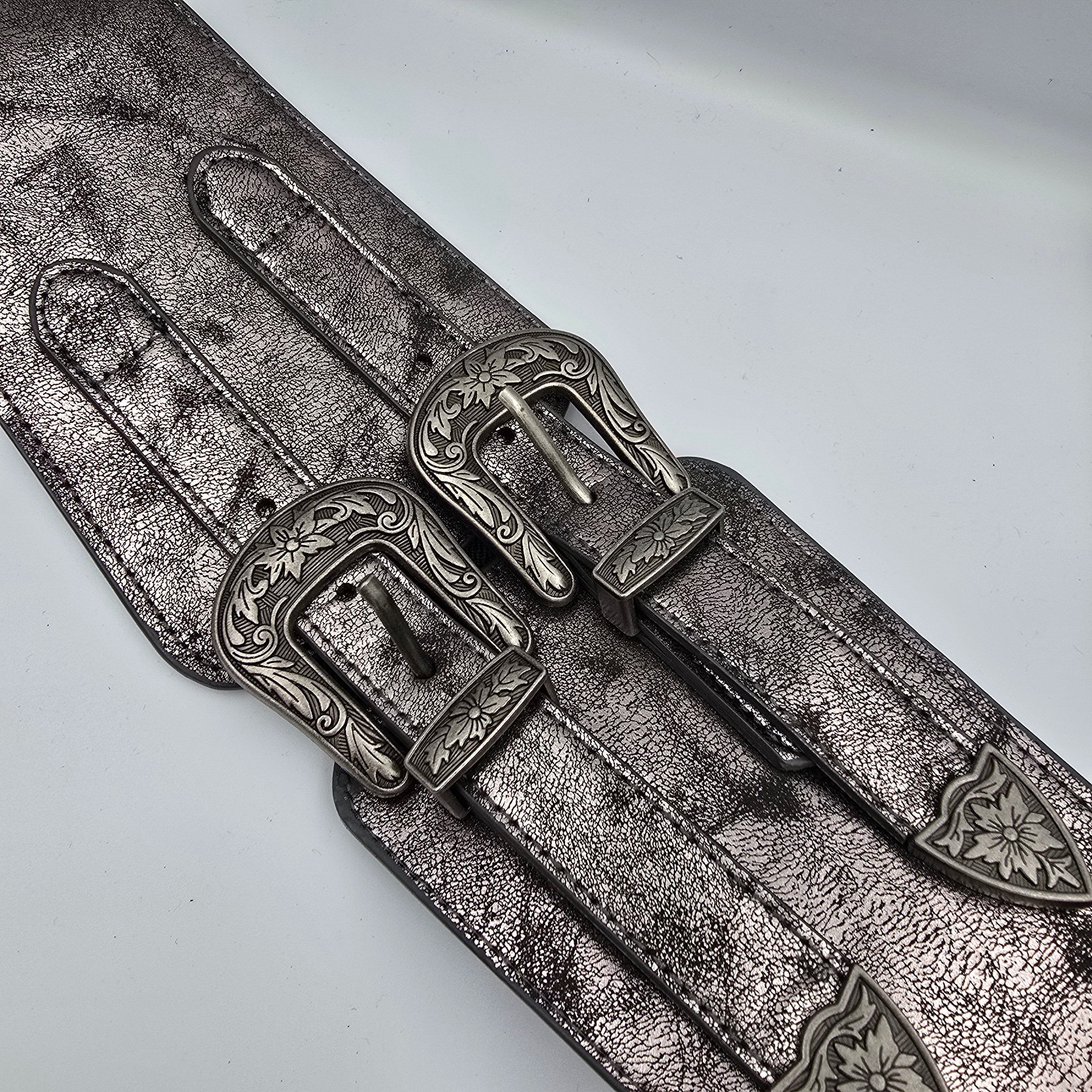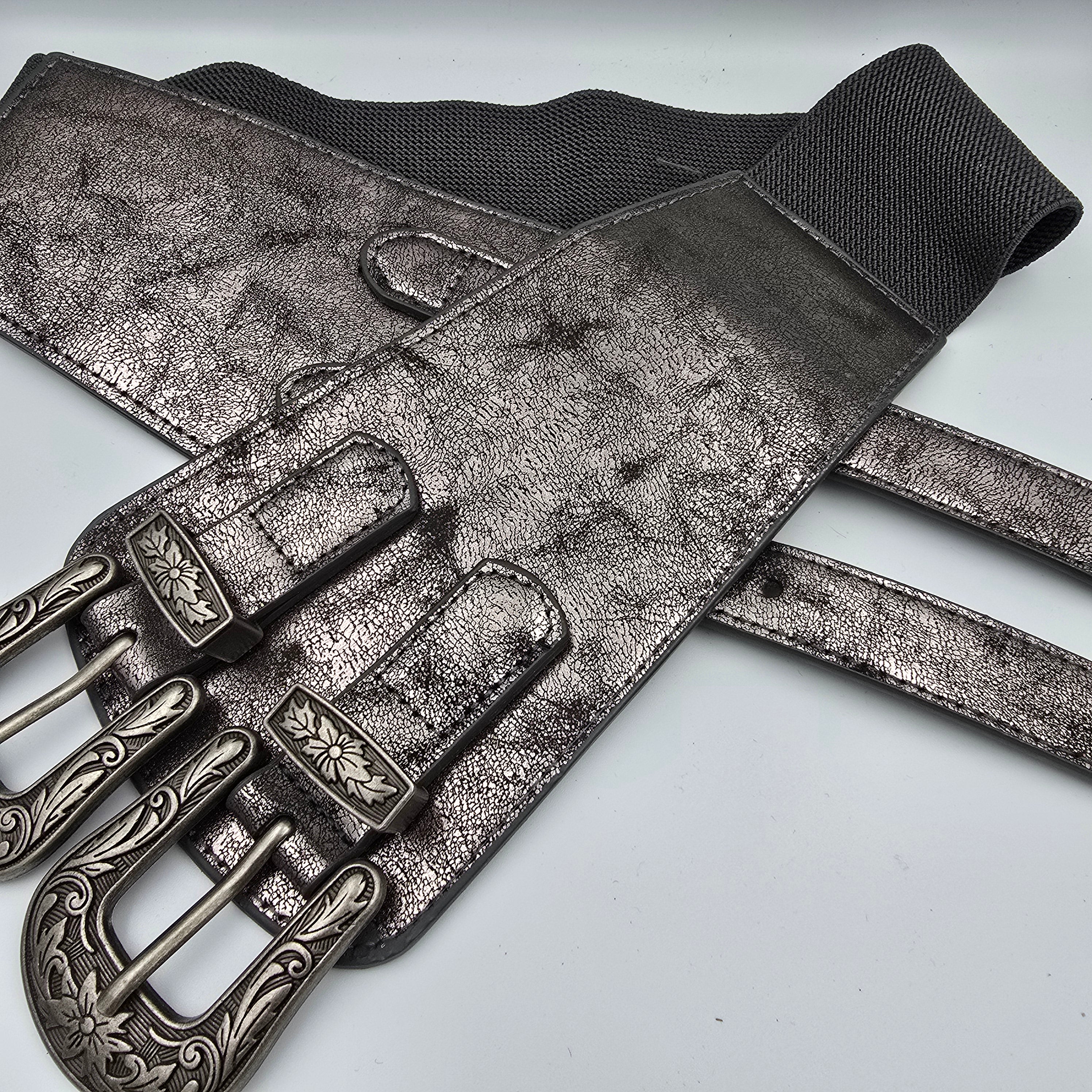 Fedt bælte med dobbelt spænder foran på det brede stykke, og elastik på ryggen.