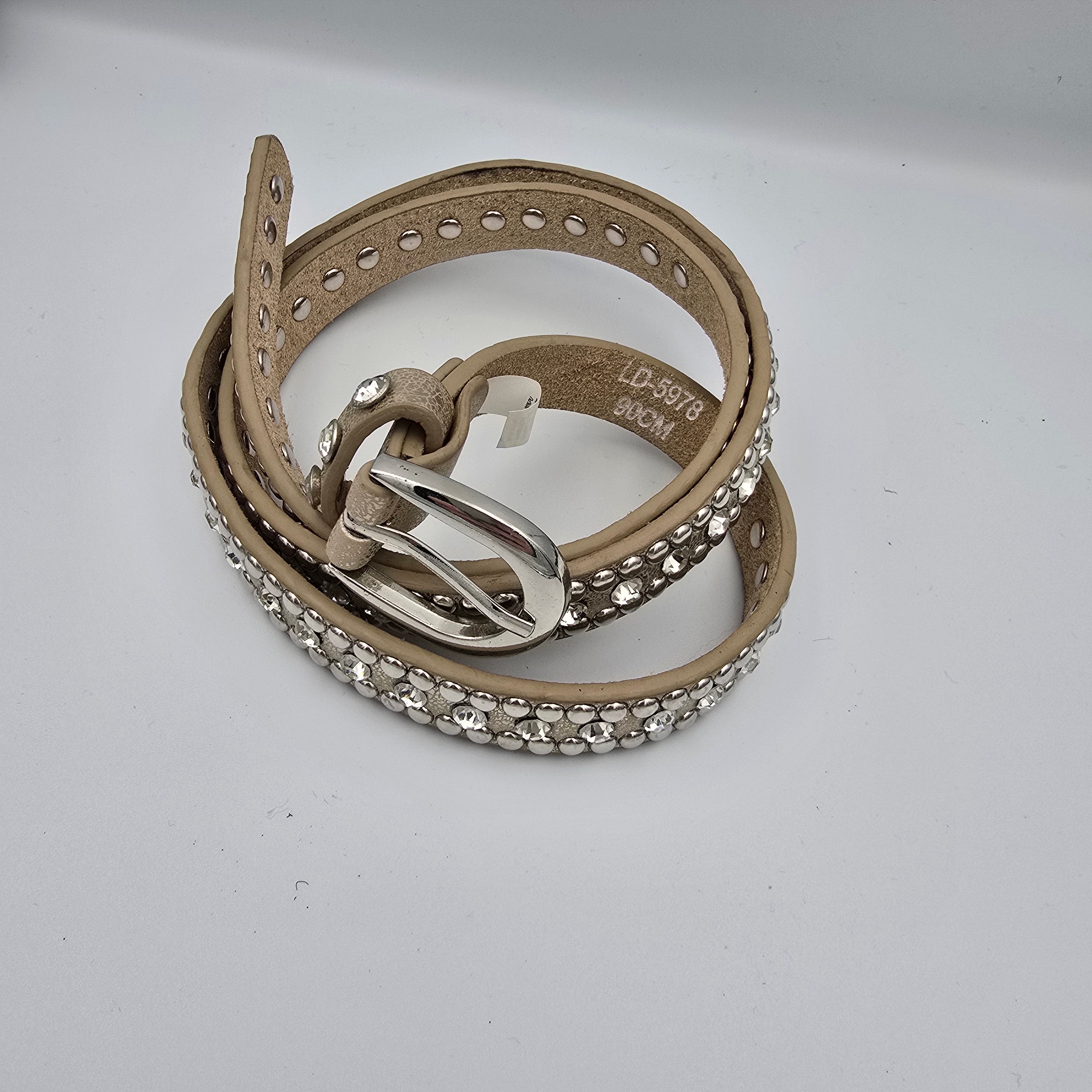 Fint smalt bælte med sten og nitter. Farven er lys lidt guld-agtig.