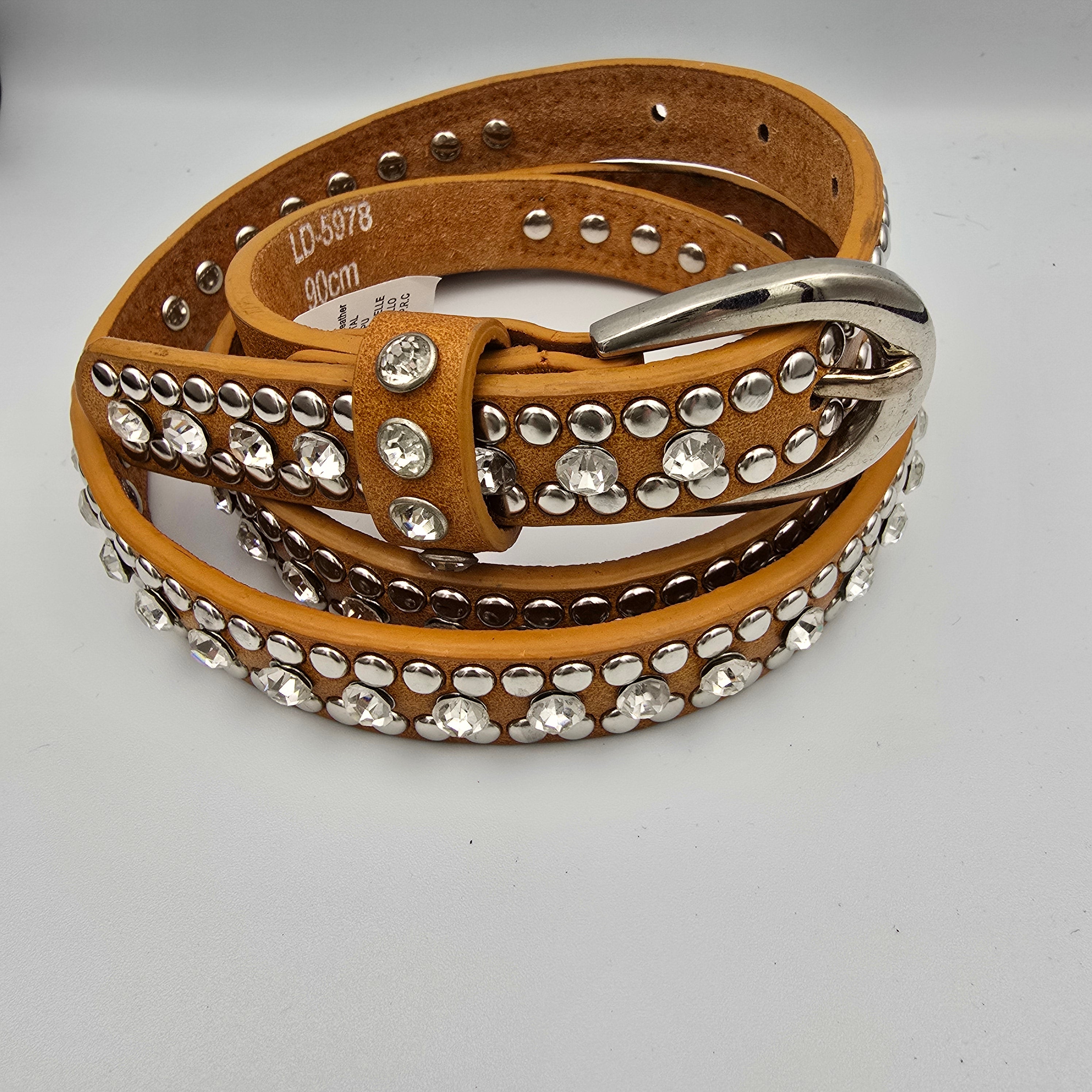Smalrt læderbælte dekoreret med sten og nitter.