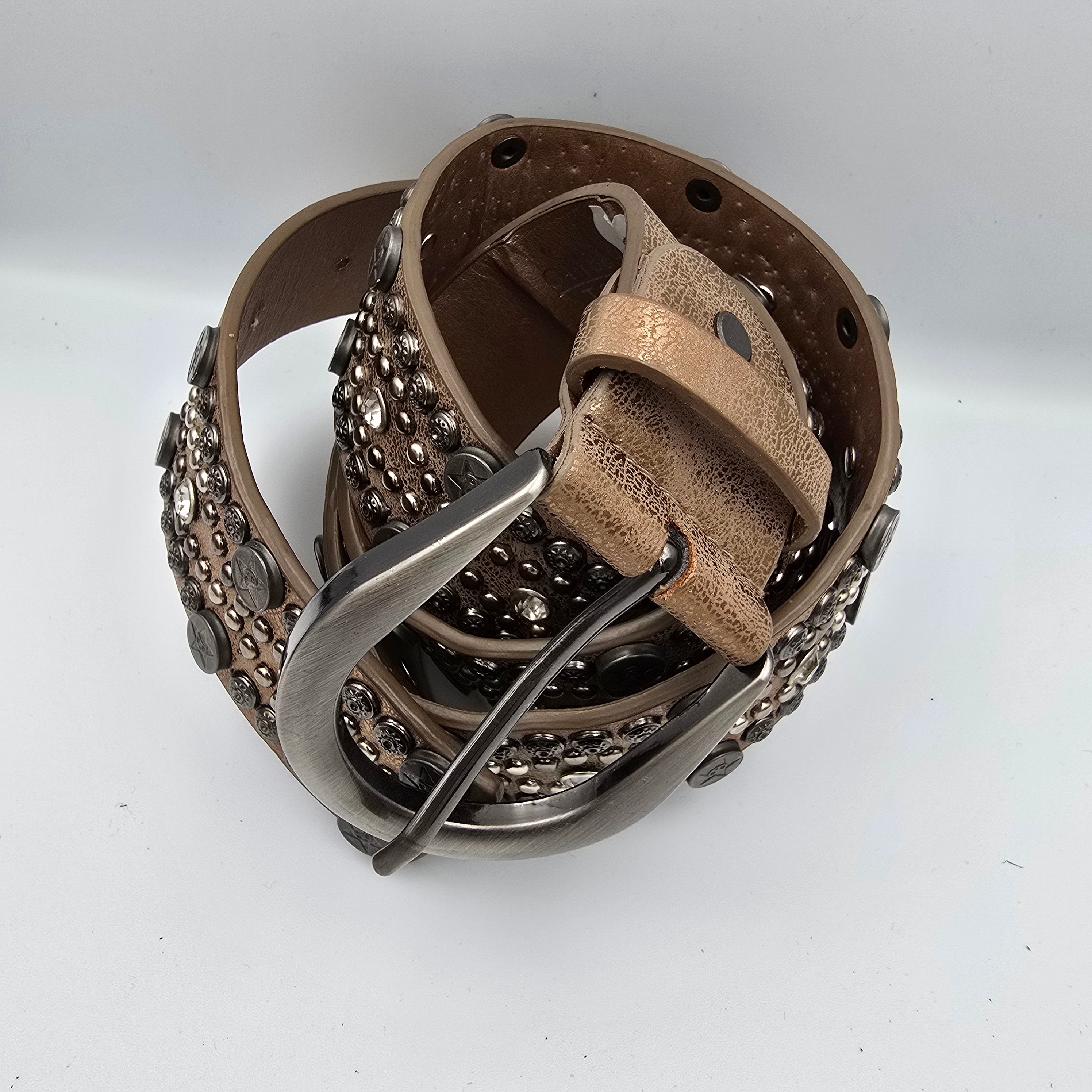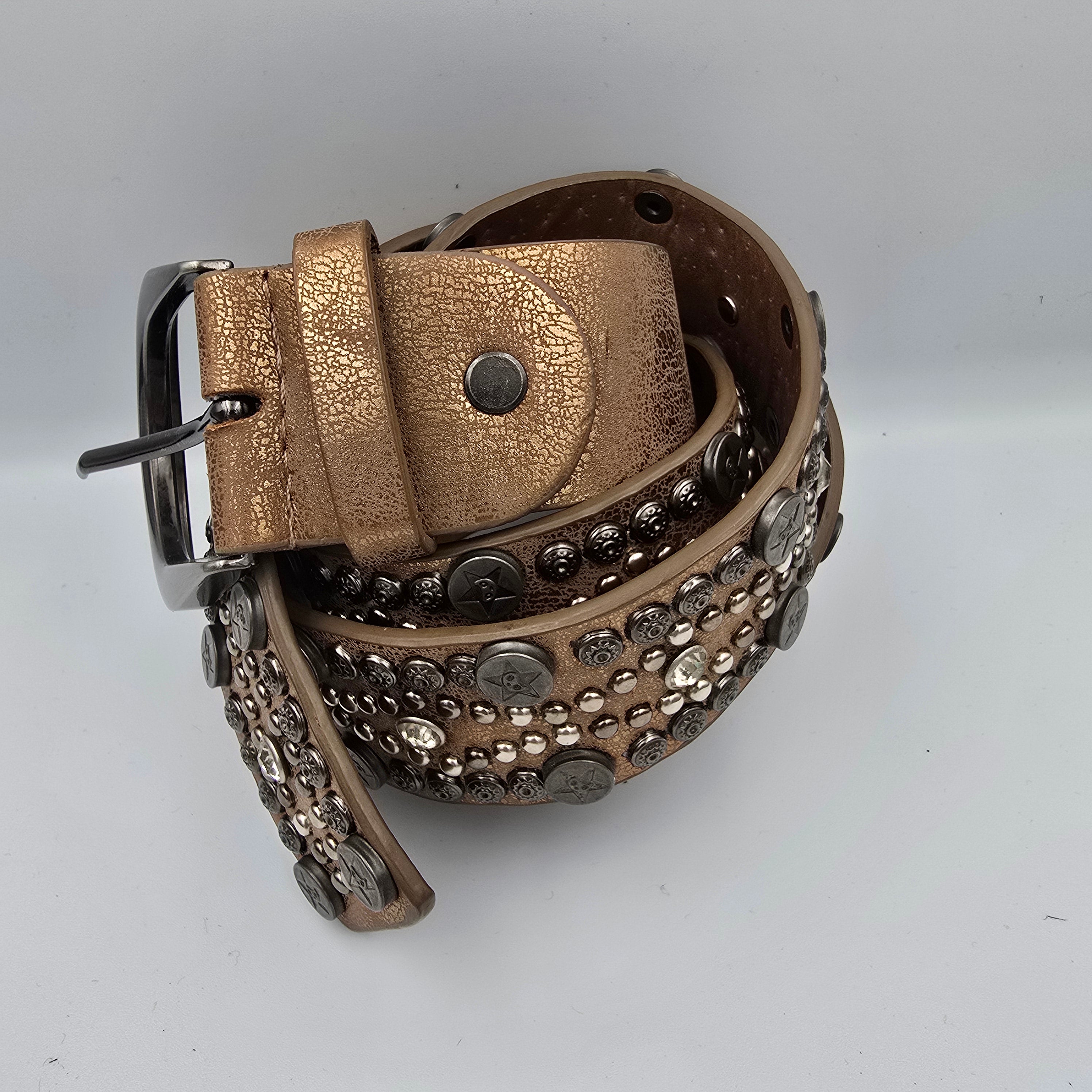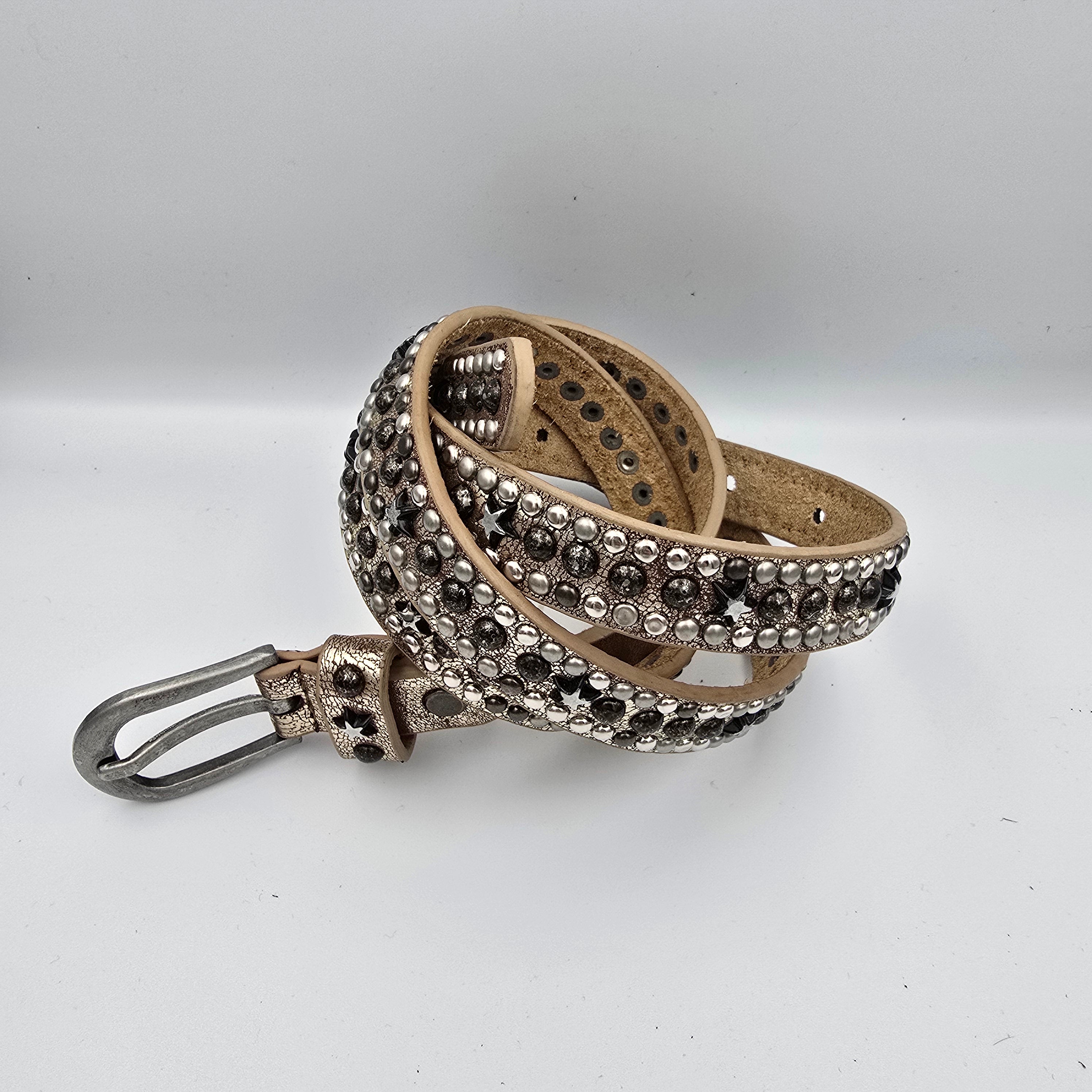 Smalt bælte i lyst skind, dekoreret med små nitter og stjerner.