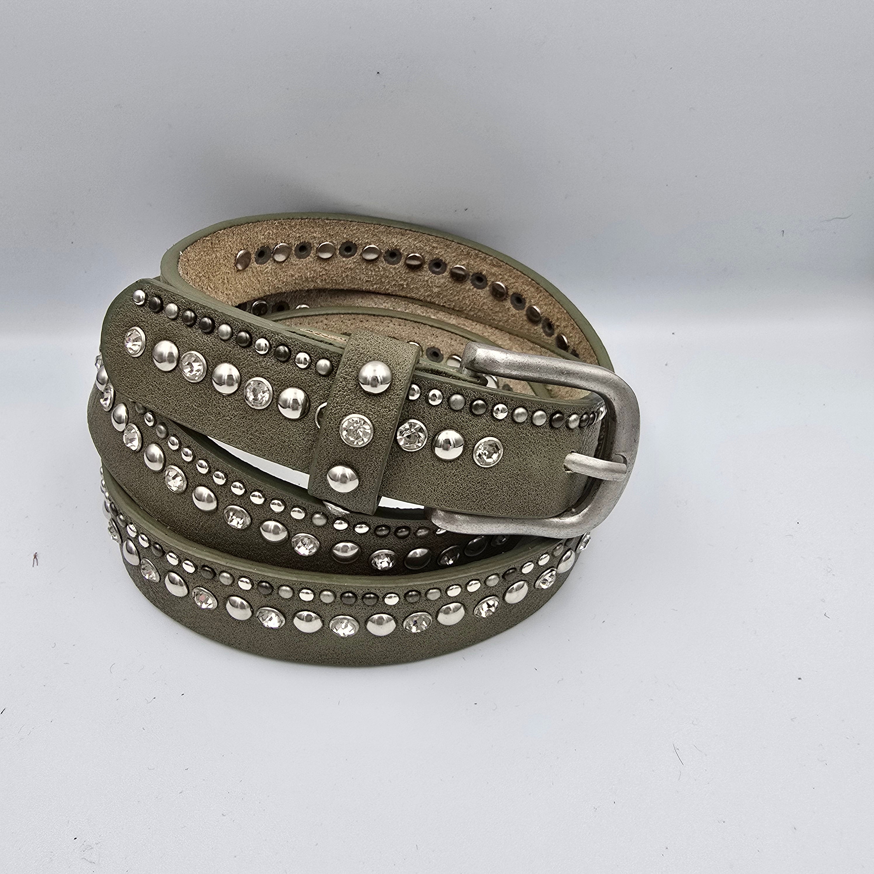 Fint skindbælte i lys grå, med dekorative sten og nitter.