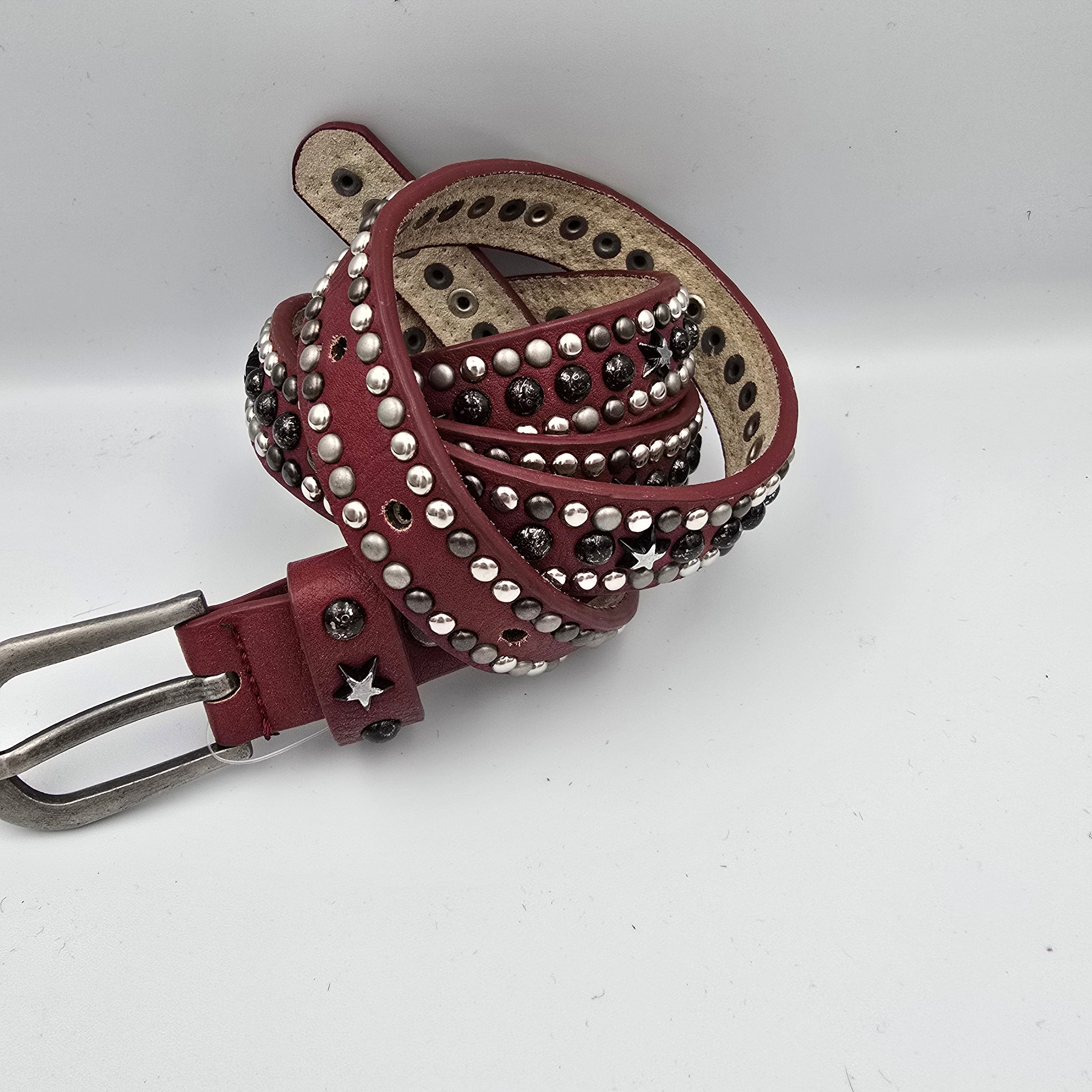 Flot bælte i mørk rød skind, med dekorative små nitter.