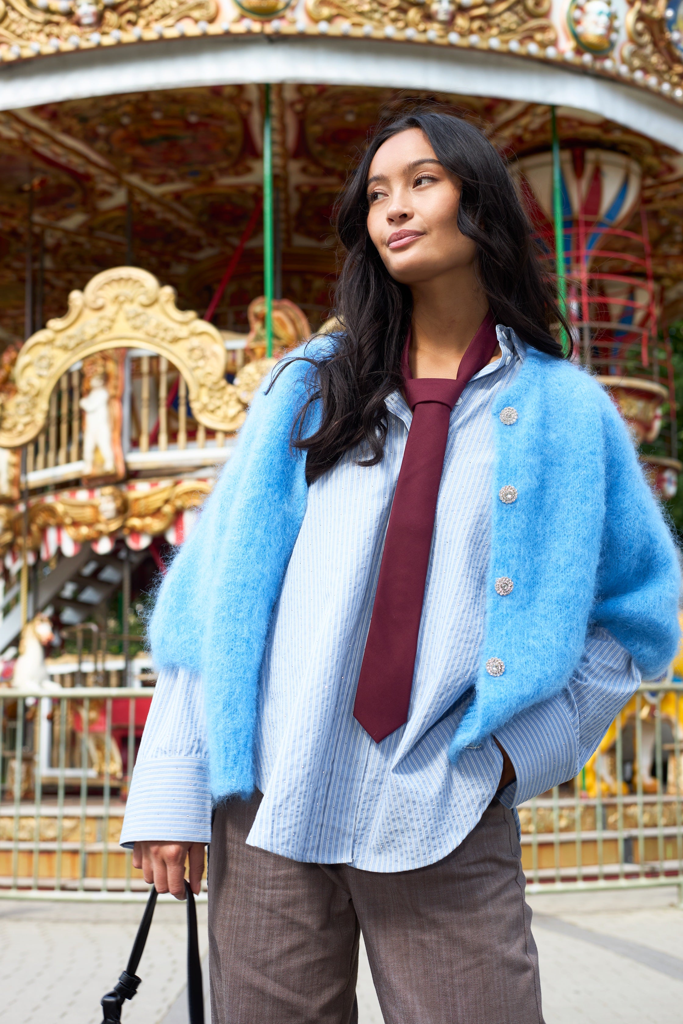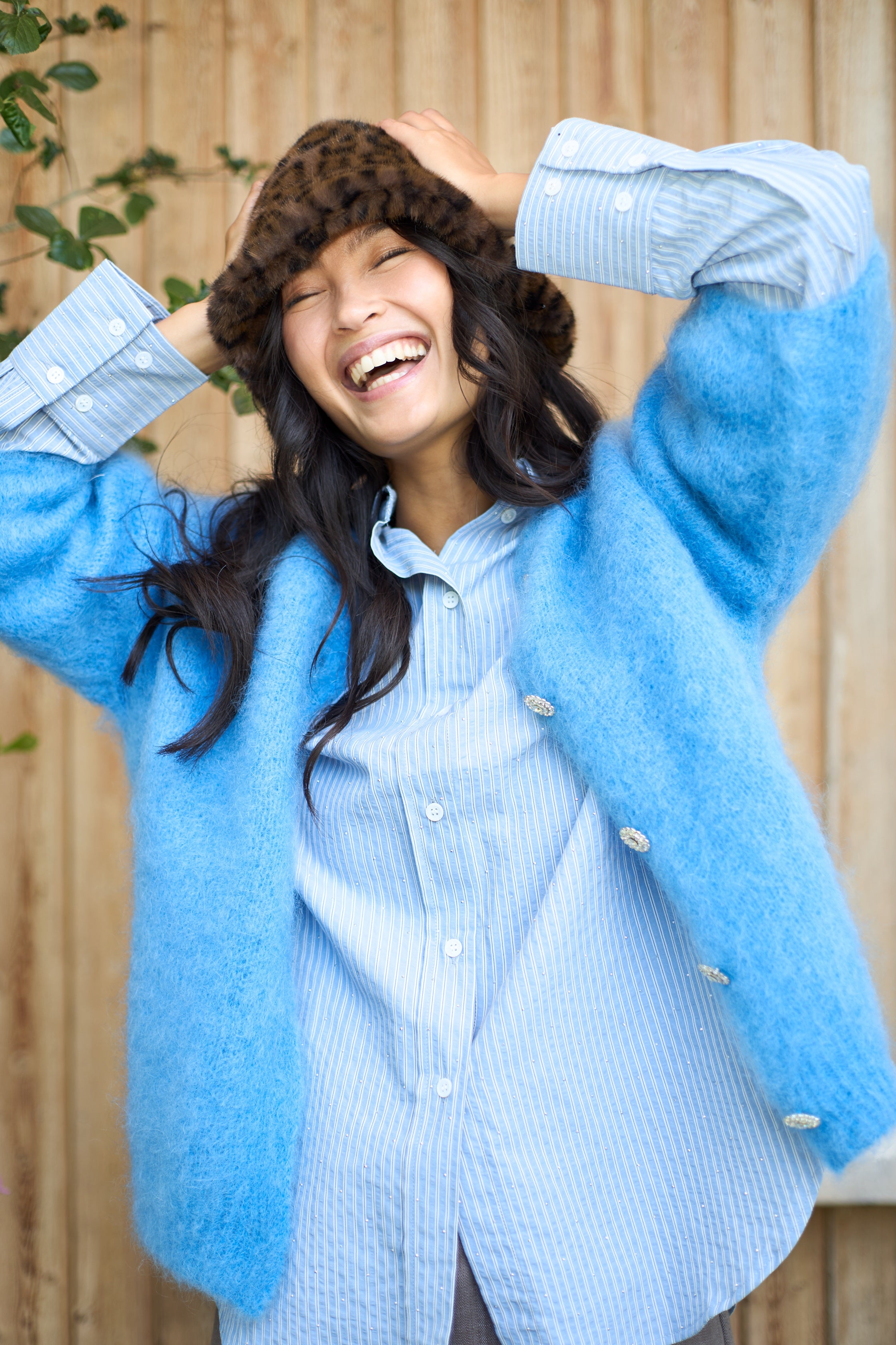 • BJØRK mohair cardigan fra Black Colour er en feminin og iøjnefaldende cardigan i en blød og fluffy strikkvalitet med mohair. Modellen har korte diskrete pufærmer og er pyntet med smukke glitrende knapper, der giver et elegant touch. Brug den lukket med bredbenede jeans eller åben over en kjole for et chic lag-på-lag-look.