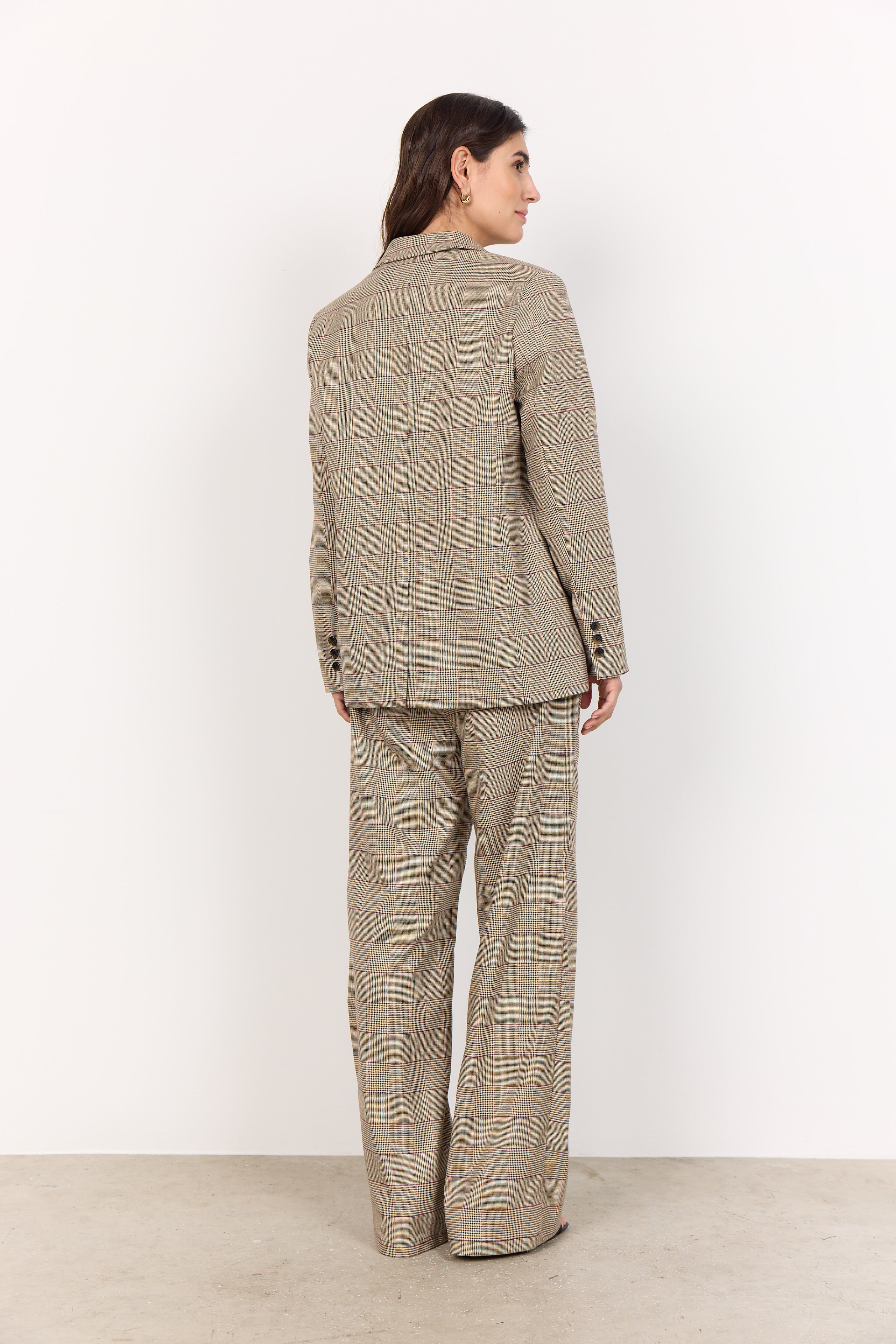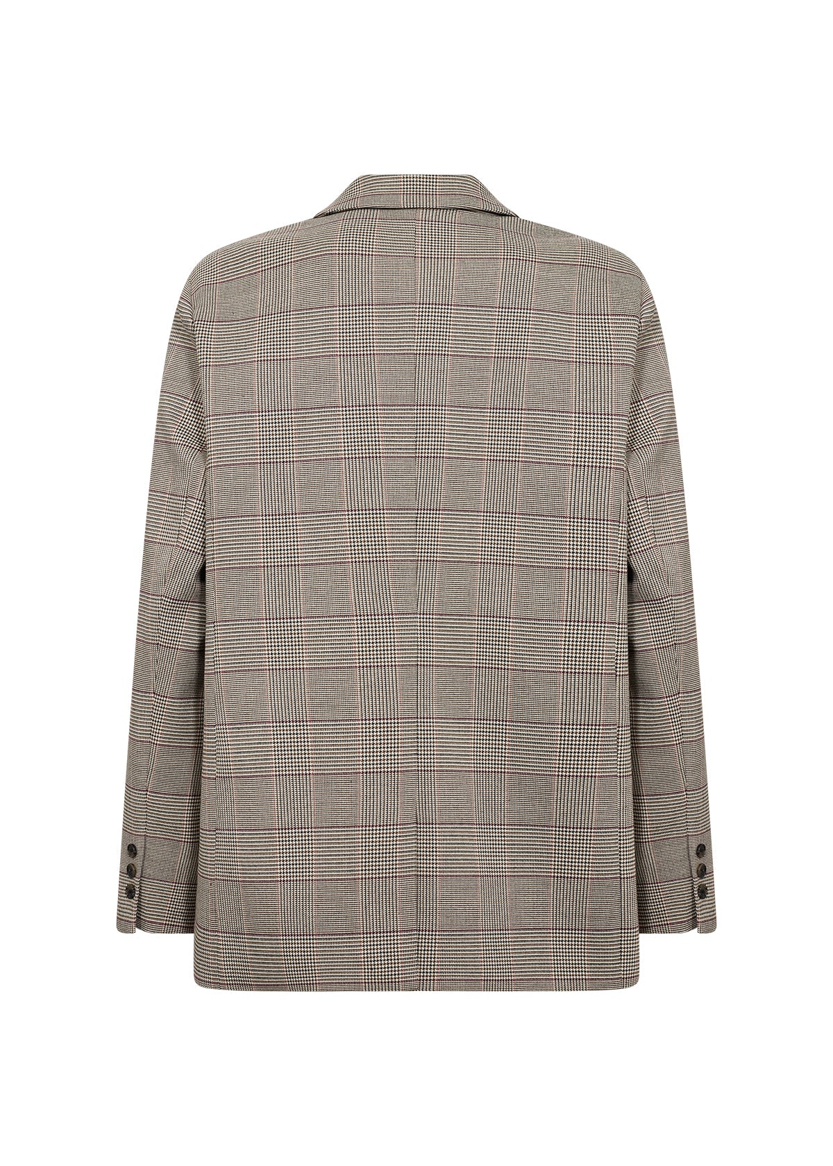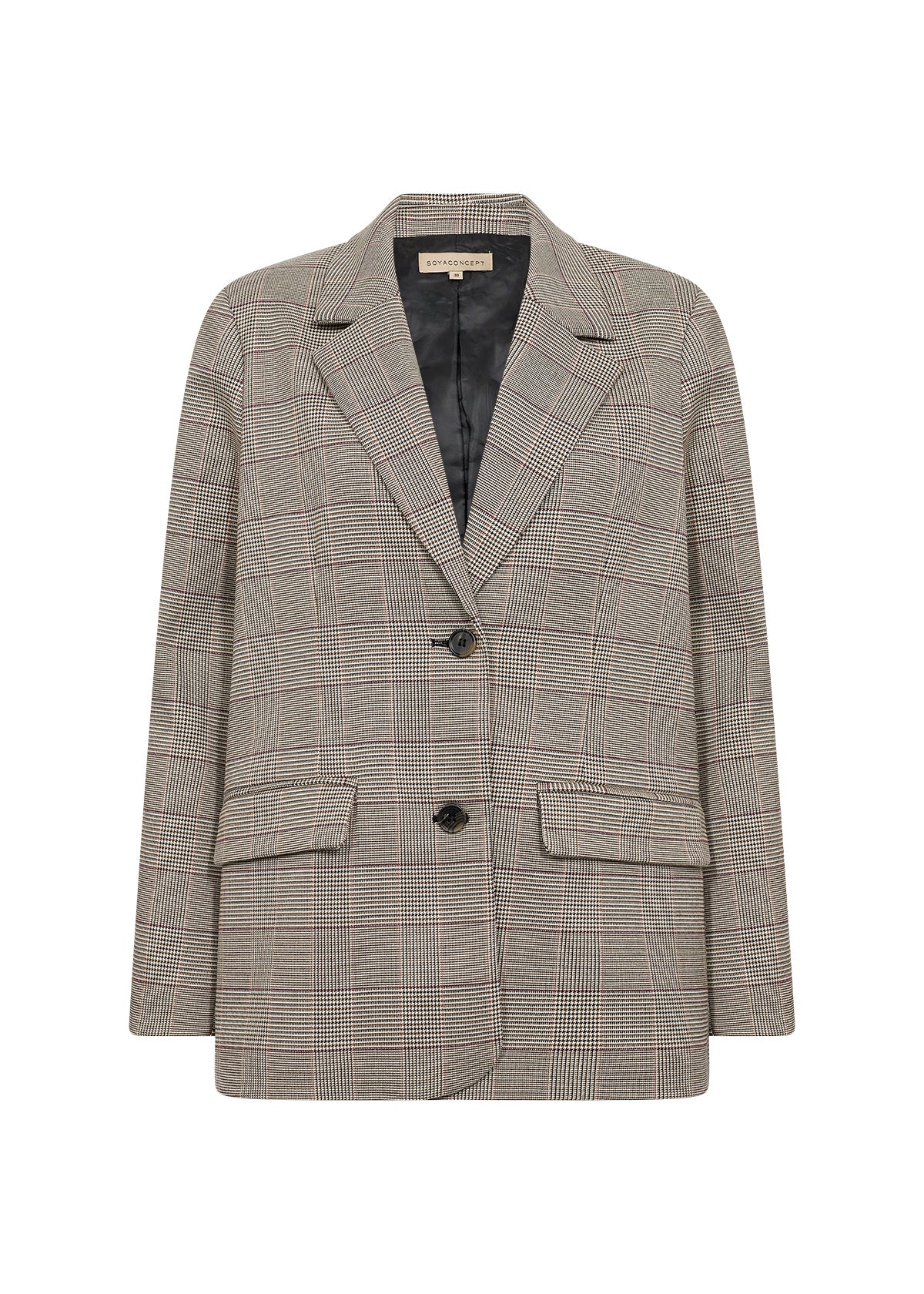 VENETIA blazer fra SOYACONCEPT er en blazer lavet af 98% genbrugspolyester og 2% elastan. Den har krave med indhak, to-knaps-lukning, forlommer og et elegant ternet mønster. Sæt den sammen med skræddersyede bukser for et professionelt look eller jeans for en mere afslappet stil.