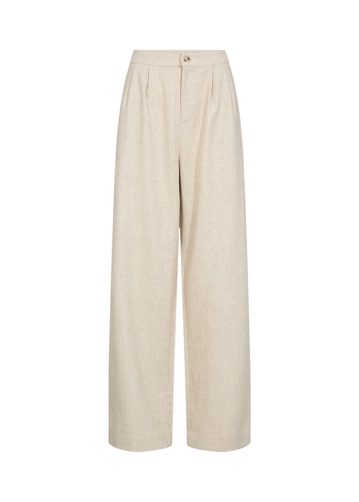 SIMI 3 bukser fra SOYA CONCEPTbukser er fremstillet af en blanding af 37% bomuld, 37% ramie og 26% hør. Bukserne har brede ben, en enkelt knaplukning og en subtil struktur hele vejen igennem.