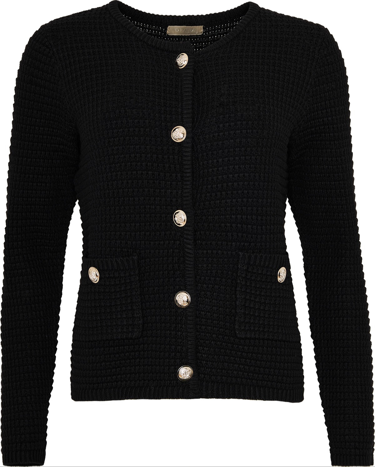 • DINA Jacket fra OFELIA er en smuk cardigan til sensommeren. Den er lidt Chanel-inspireret med et enkelt snit, et fint st5rukturmønster, to lommer foran og nogle store flotte guld knapper.