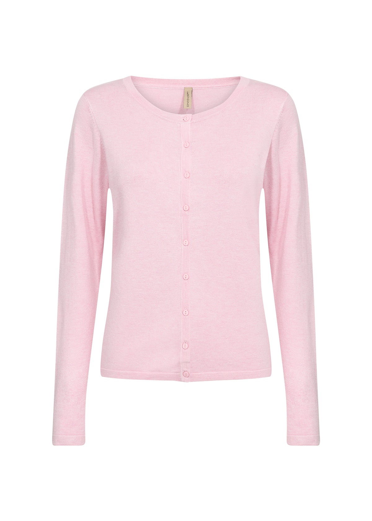 DOLLIE 446 fra SOYACONCEPT er en basis cardigan i en viskose og nylon blandingskvalitet. Cardiganen har en stram pasform, lange ærmer, rund hals og en knappelukning.