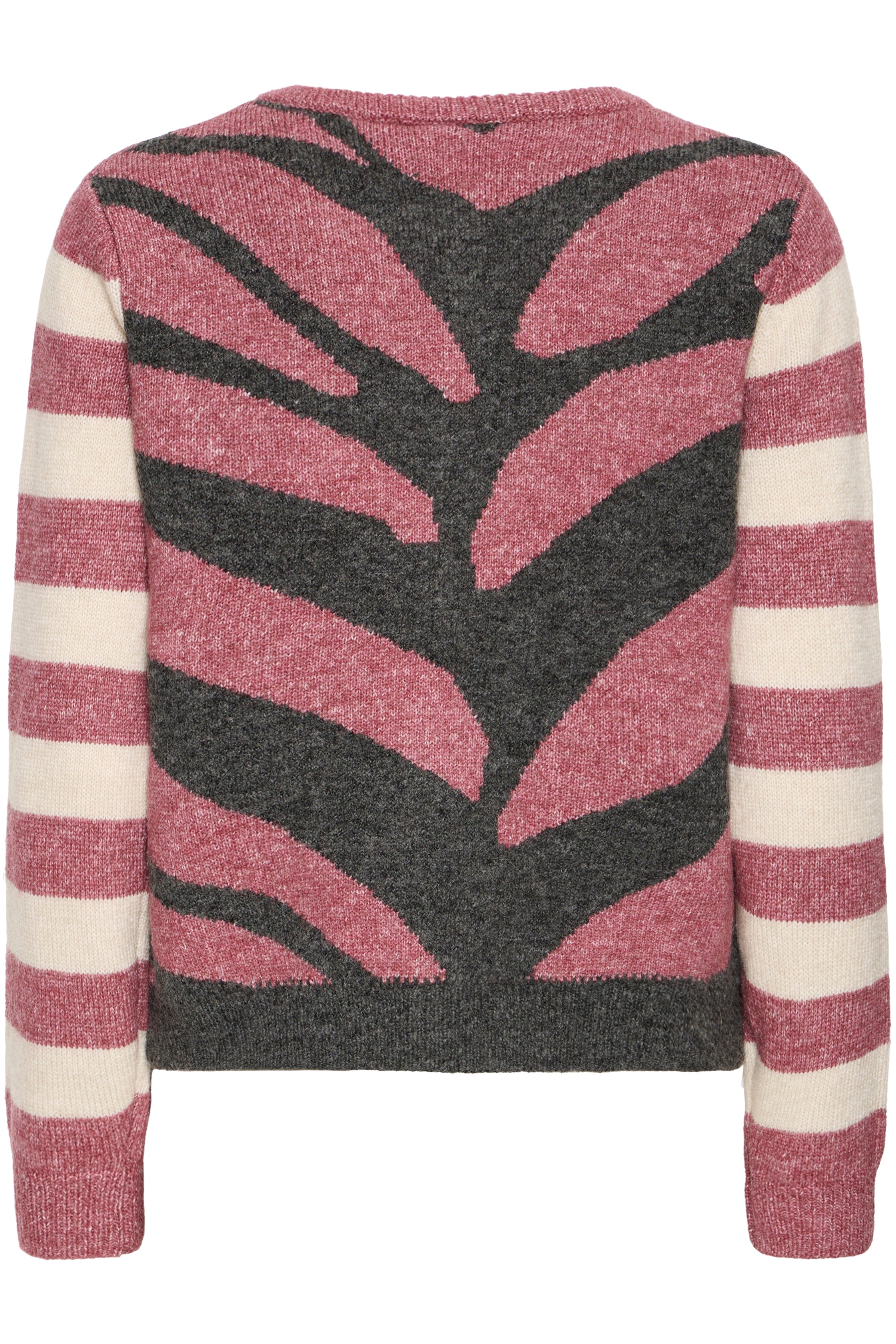 IHLIVONI CA2 er en lækker cardigan fra ICHI. Denne strik har et flot mønster i rød, creme og sort, en flot rund krave og yndige hjerteknapper i guld.