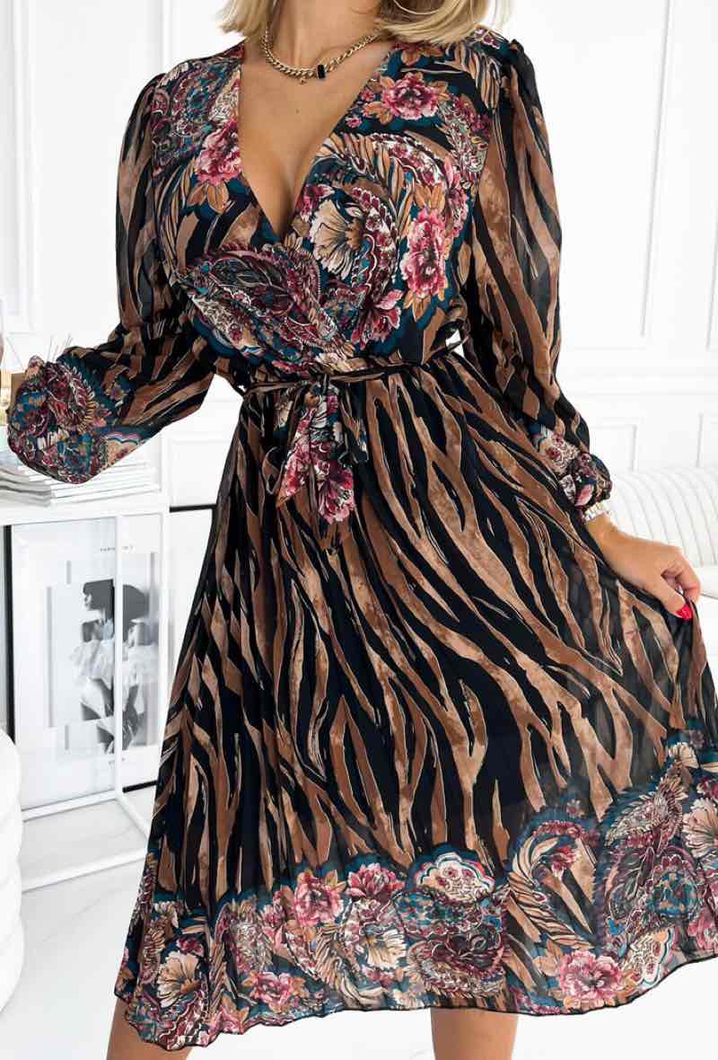 Halvlang kjole med mønstret print. Kjolen har dyb v-udskæring og lange ærmer. Ærmerne har elastik i ærmekanten, så det er let at holde ærmerne oppe. Der er elastik i linningen og et fint bindebånd.