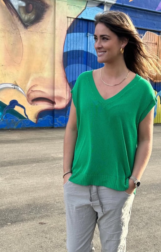 Super skøn MEG TOP fra HELLOU. Blusen er en let strik uden ærmer og har en flot v-udskæring ved halsen.