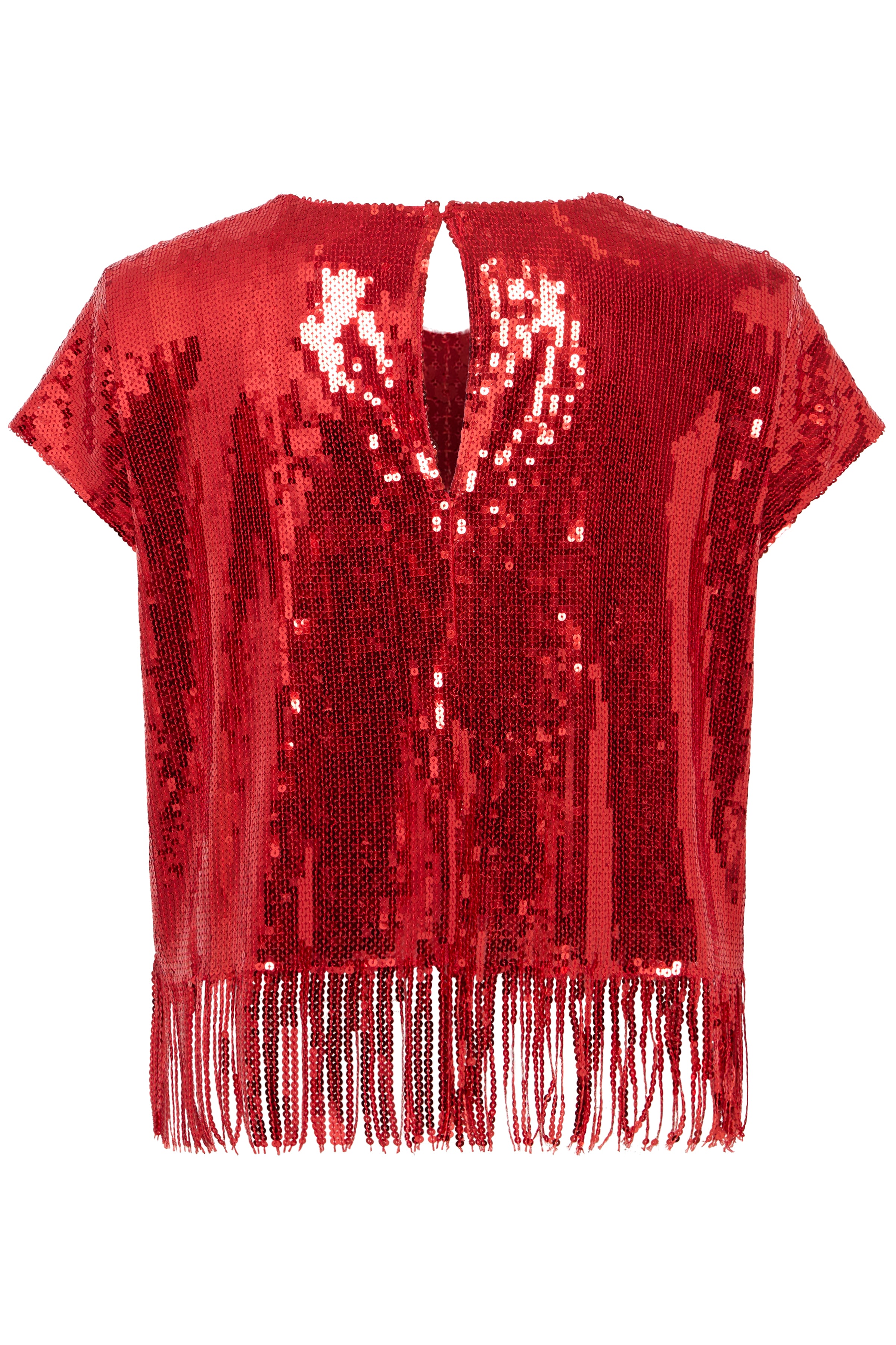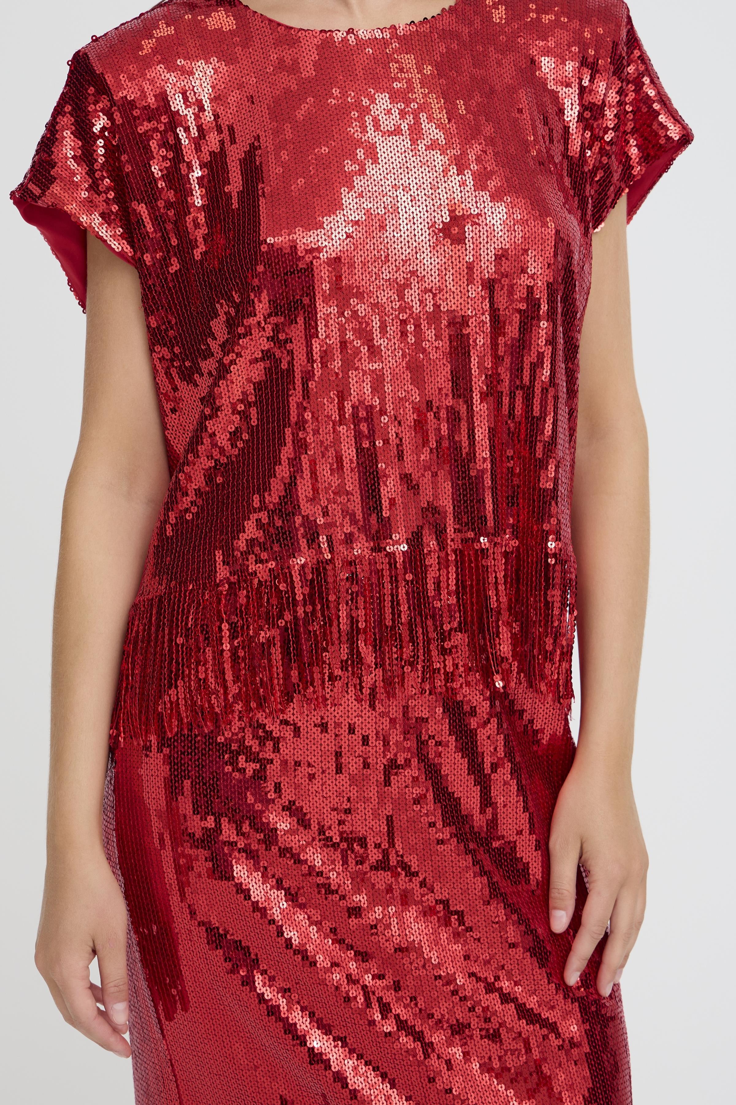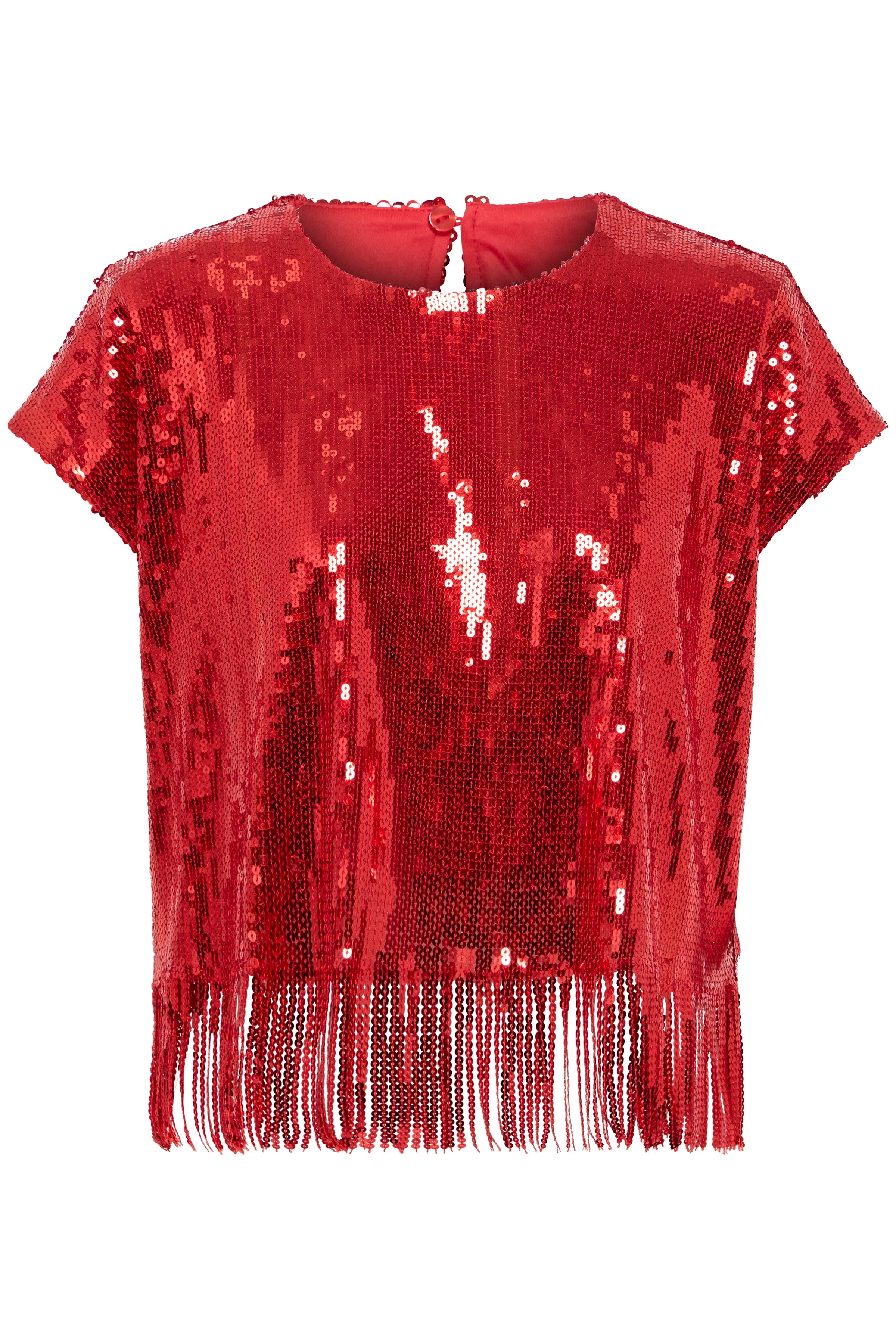 IHMOLLIA blusen fra ICHI er en pailletbluse med lige, afslappet pasform, rund halsudskæring, korte ærmer, fuldt dækket af pailletter og iøjnefaldende frynsekant forneden.