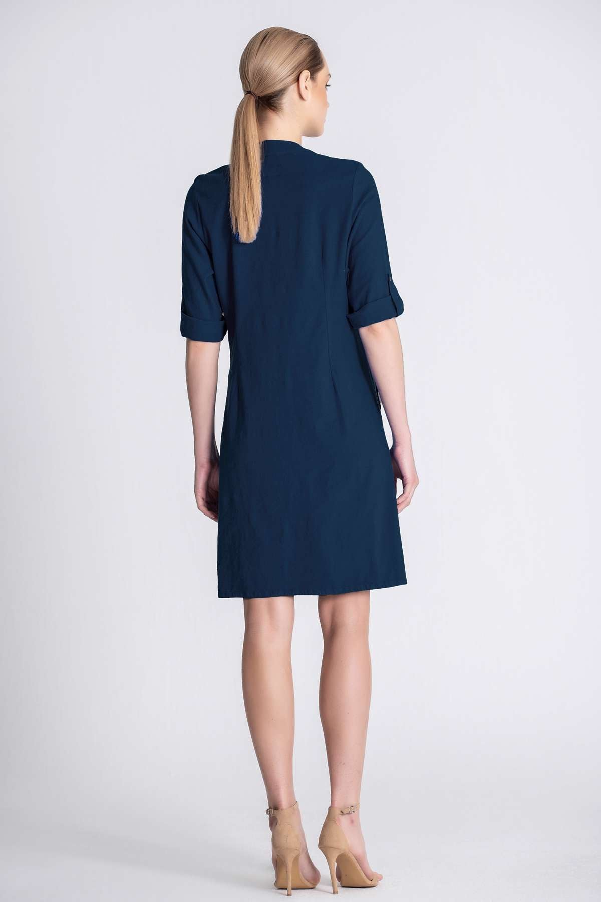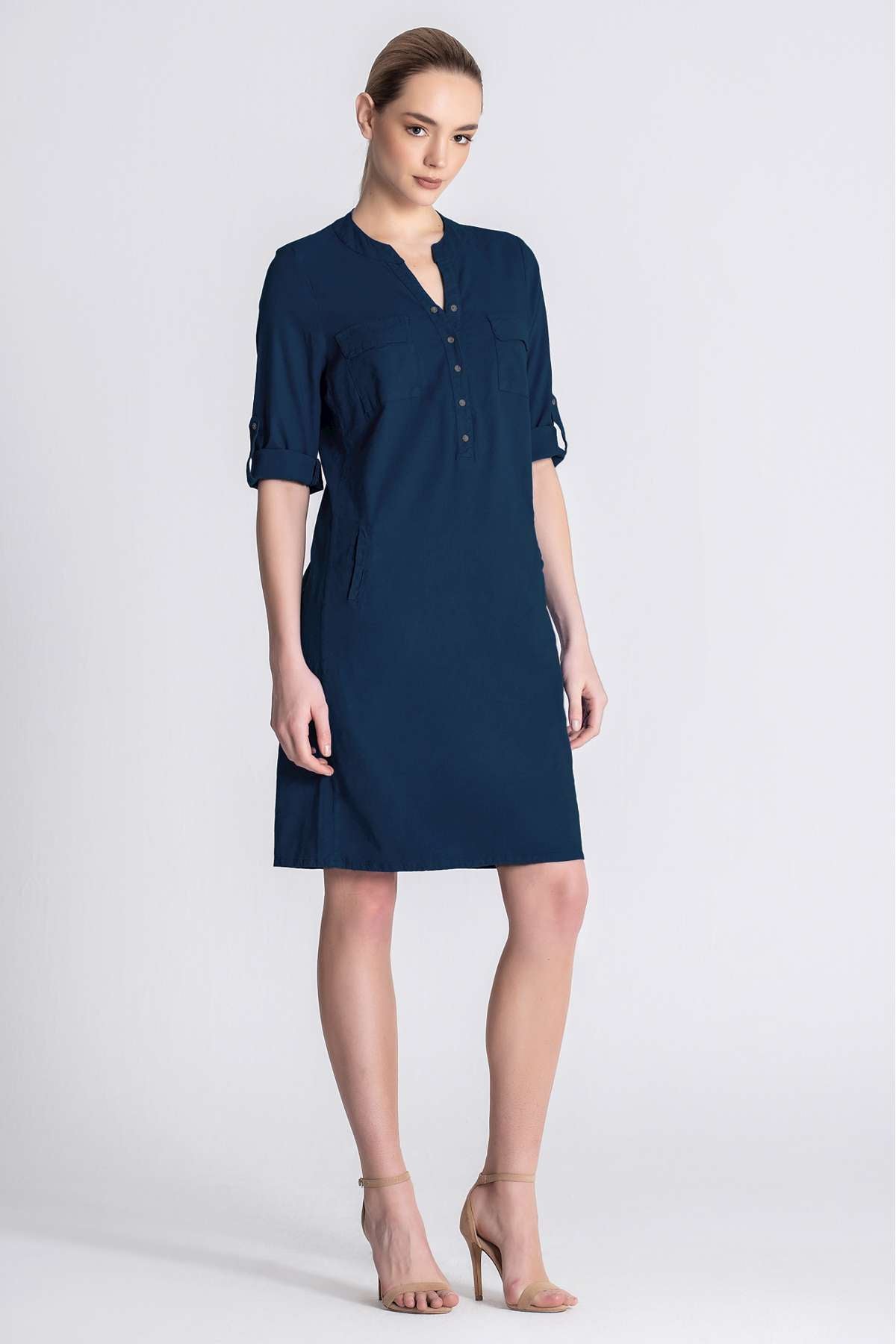 Kjolen har 3/4 ærmer med mulighed for opsmøg og en smart halsudskæring med trykknapper. Derudover har Ella Dress lommer i siderne samt små brystlommer.