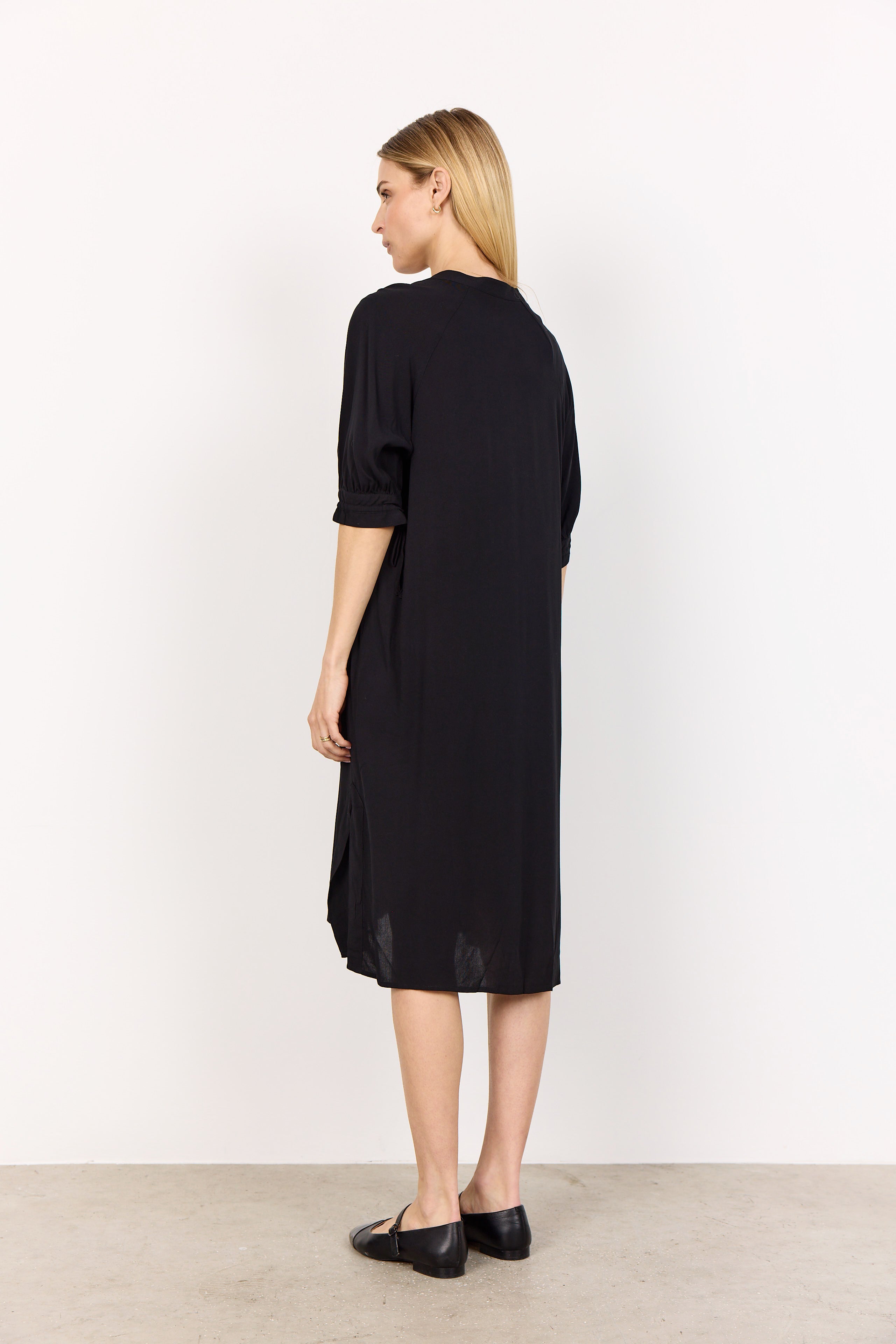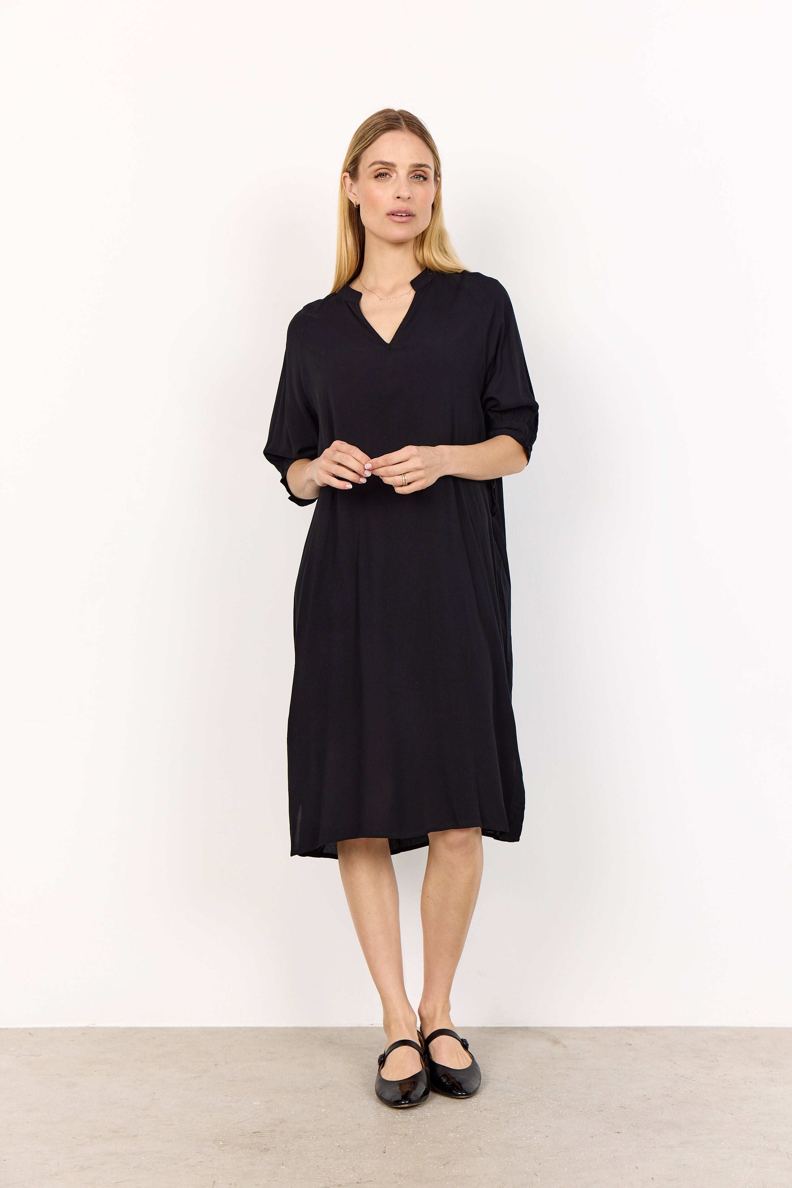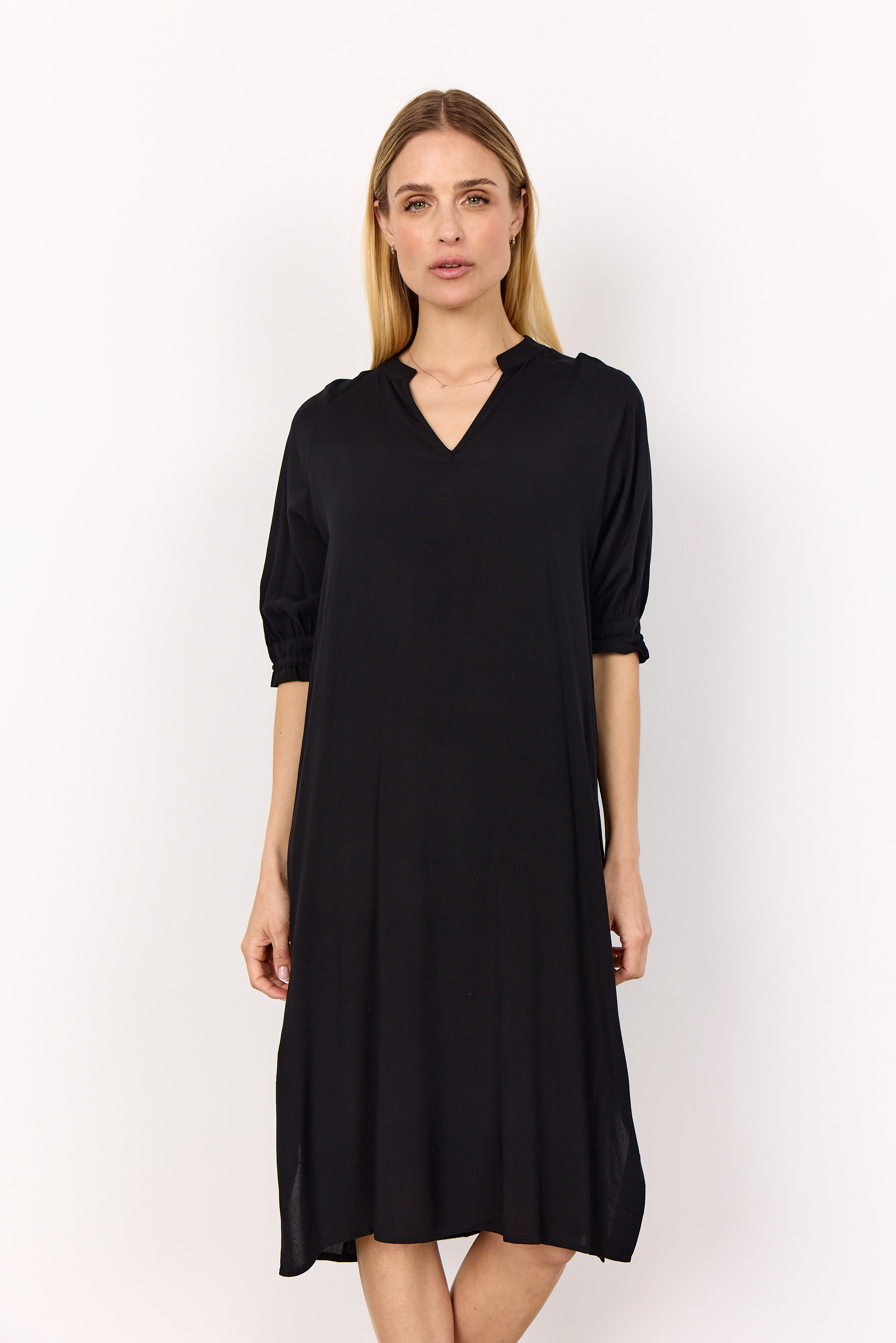 • RADIA 219 tunicakjole  fra SOYACONCEPT er en kjole fremstillet af 100 % LENZING™ ECOVERO™-viskose. Kjolen har V-udskæring, korte ærmer med rynkede manchetter og en afslappet pasform, der går til knæet.