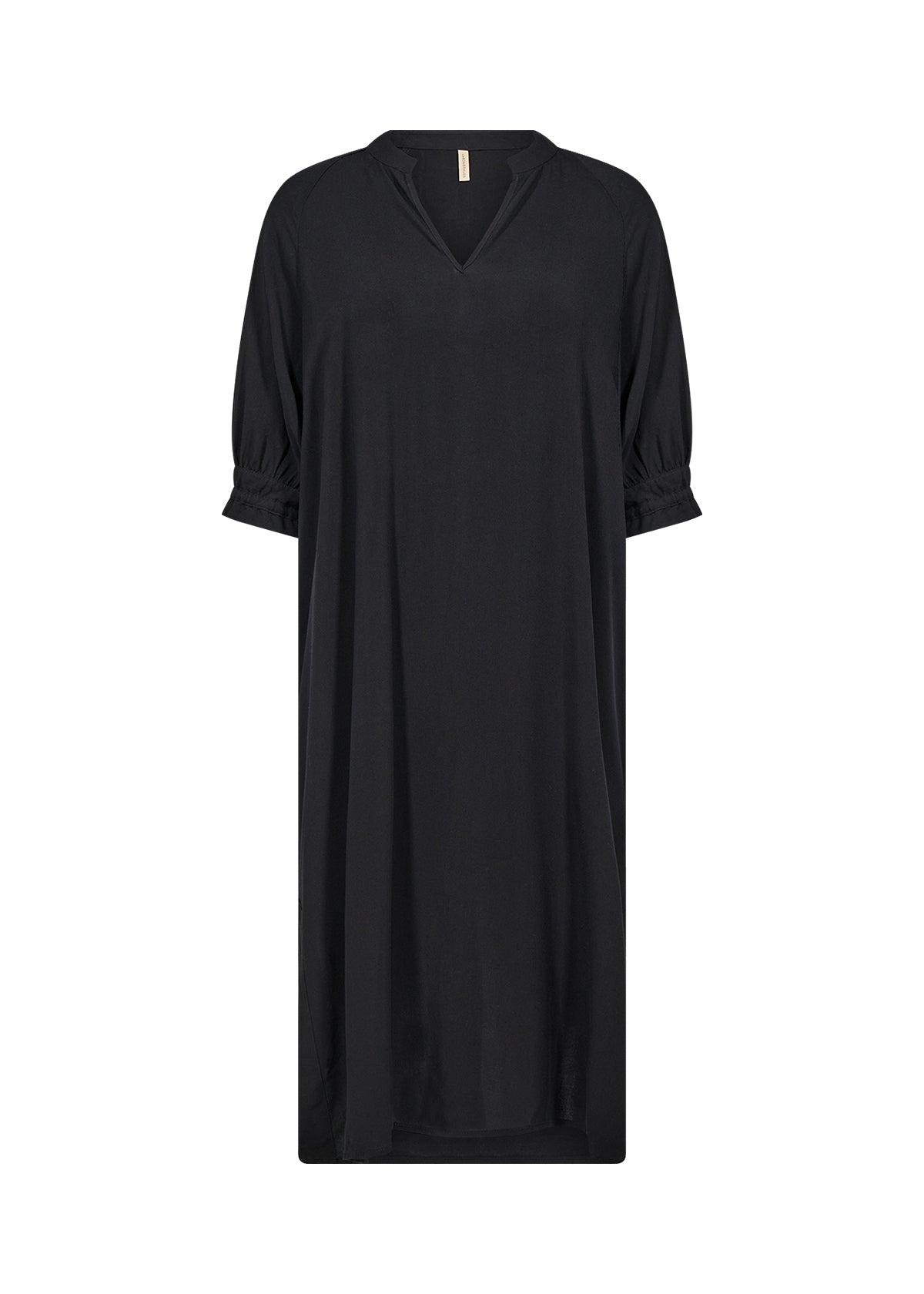 RADIA 219 tunicakjole  fra SOYACONCEPT er en kjole fremstillet af 100 % LENZING™ ECOVERO™-viskose. Kjolen har V-udskæring, korte ærmer med rynkede manchetter og en afslappet pasform, der går til knæet.