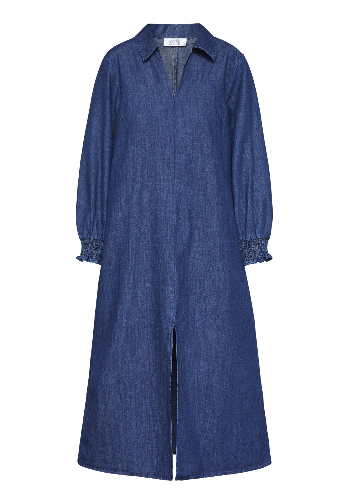 LOVE 1392 er en lang denim kjole fra LOVE & DIVINE i et mørkeblåt vasket look. Kjolen har en klassisk krave, V-halsudskæring og lange ærmer med smock-detalje ved ærmegabene. Den er designet med en slids midt foran.