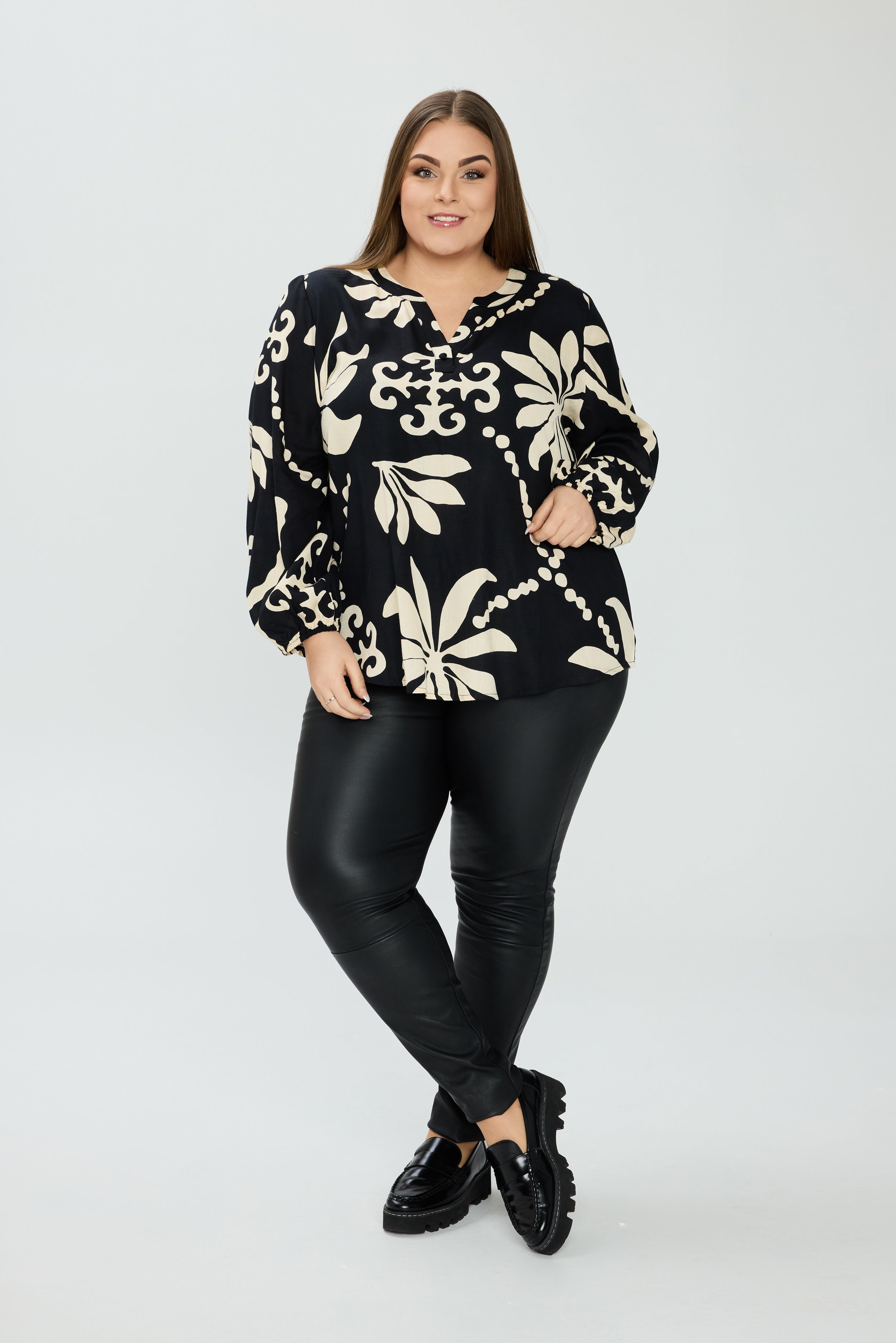 Elegant bluse fra NO. 1 BY OX med en elegant v-udskæring med en enkel knap foran, som tilføjer et let og feminint touch. De lange ærmer afsluttes med elastikkant, der tilføjer en fin balloneffekt til ærmet.