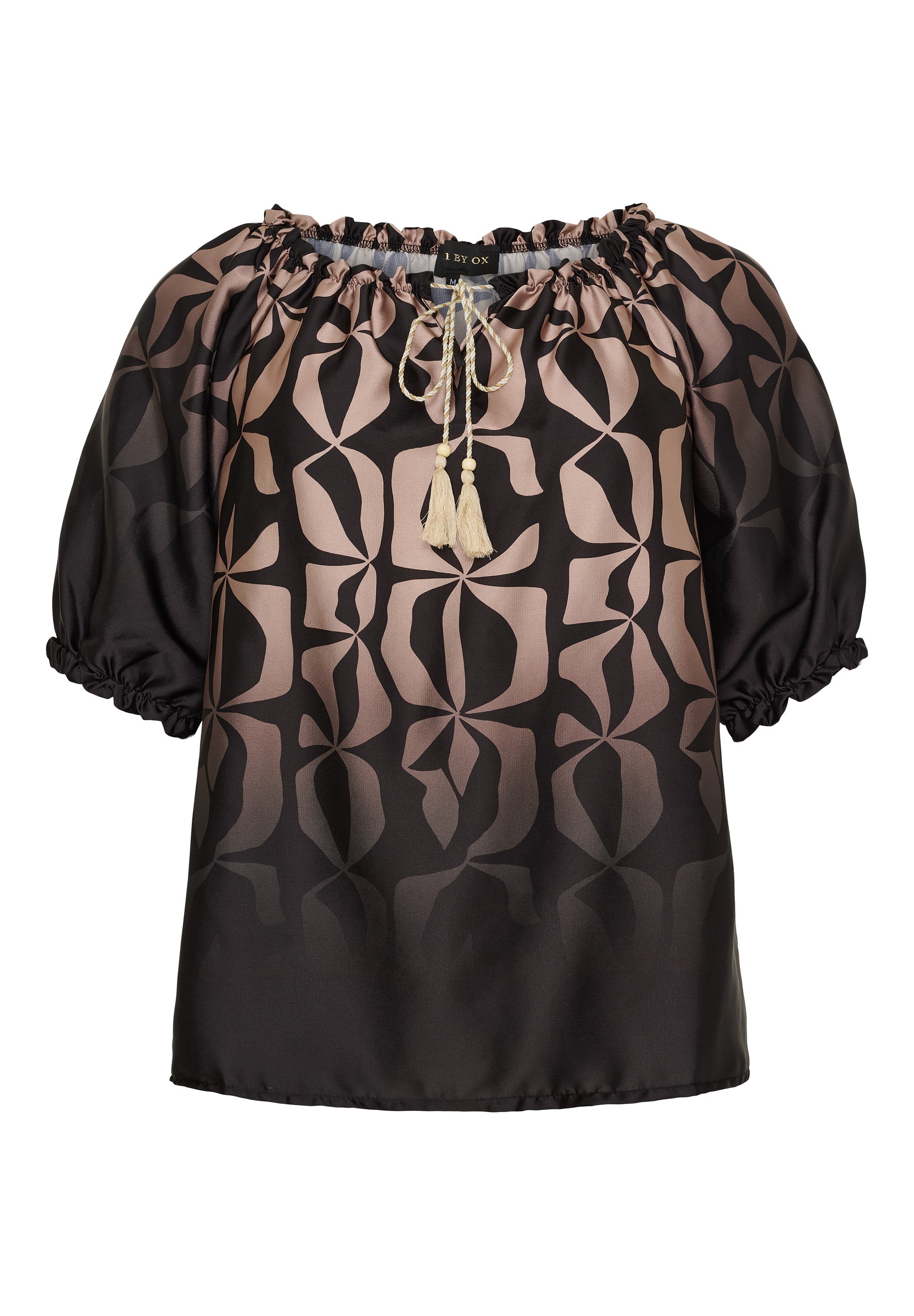 Smukke bluse fra NO. 1 BY OX med elastisk flæsekant i halsudskæringen, som både kan bæres oppe eller nede over skulderne for et mere afslappet og elegant look. Korte ærmer med elastisk flæsekant og giver en let puf-effekt. Blusen har et dekorativ bindebånd med kvast.