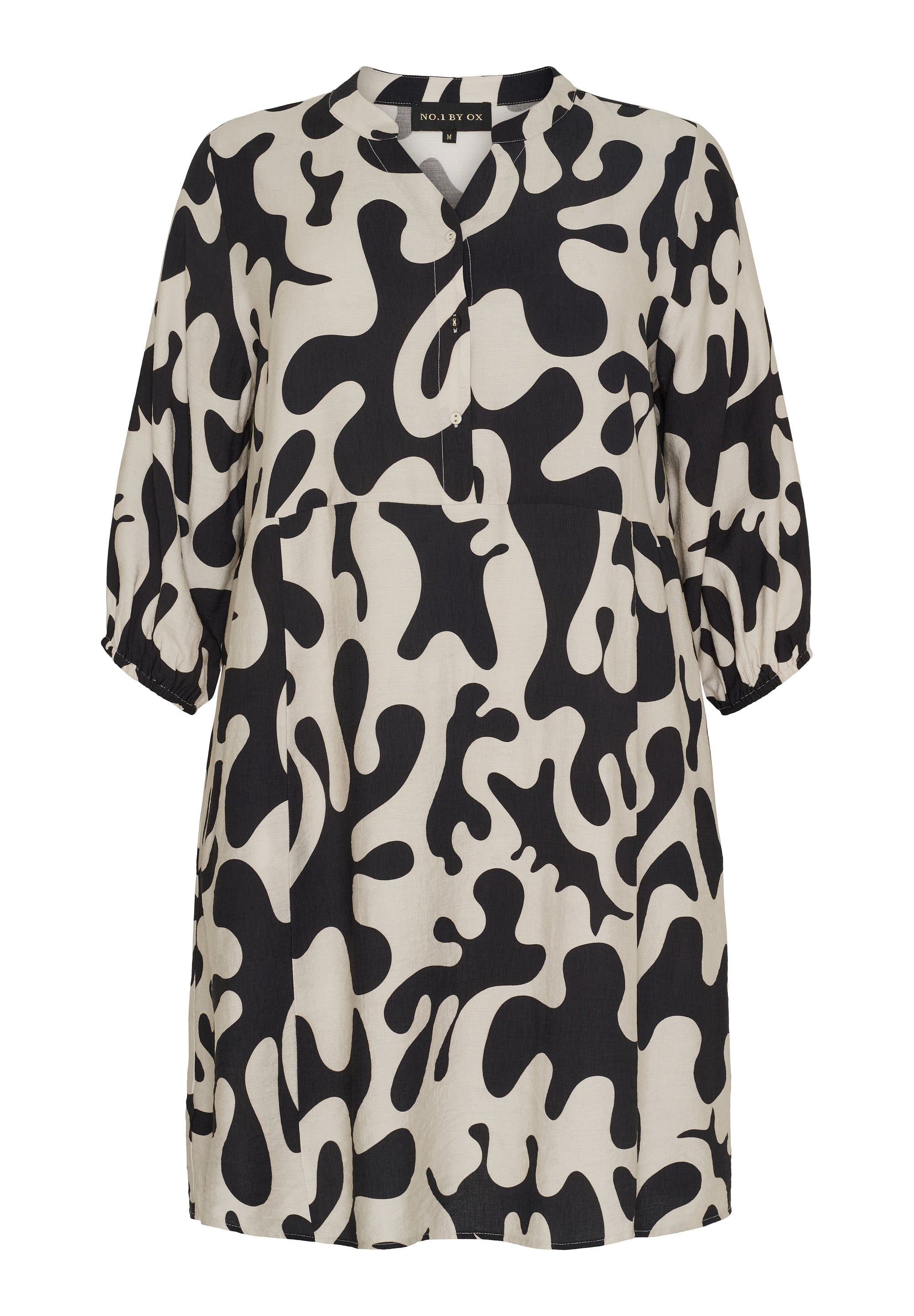 i et tidløst print med V-udskæring og enkle knapper ned langs fronten. De 3/4 lange ærmer afsluttes med elastikkant, der skaber en let puf-effekt og et elegant touch. Kjolen er designet med praktiske skjulte sidelommer, som giver funktionalitet.