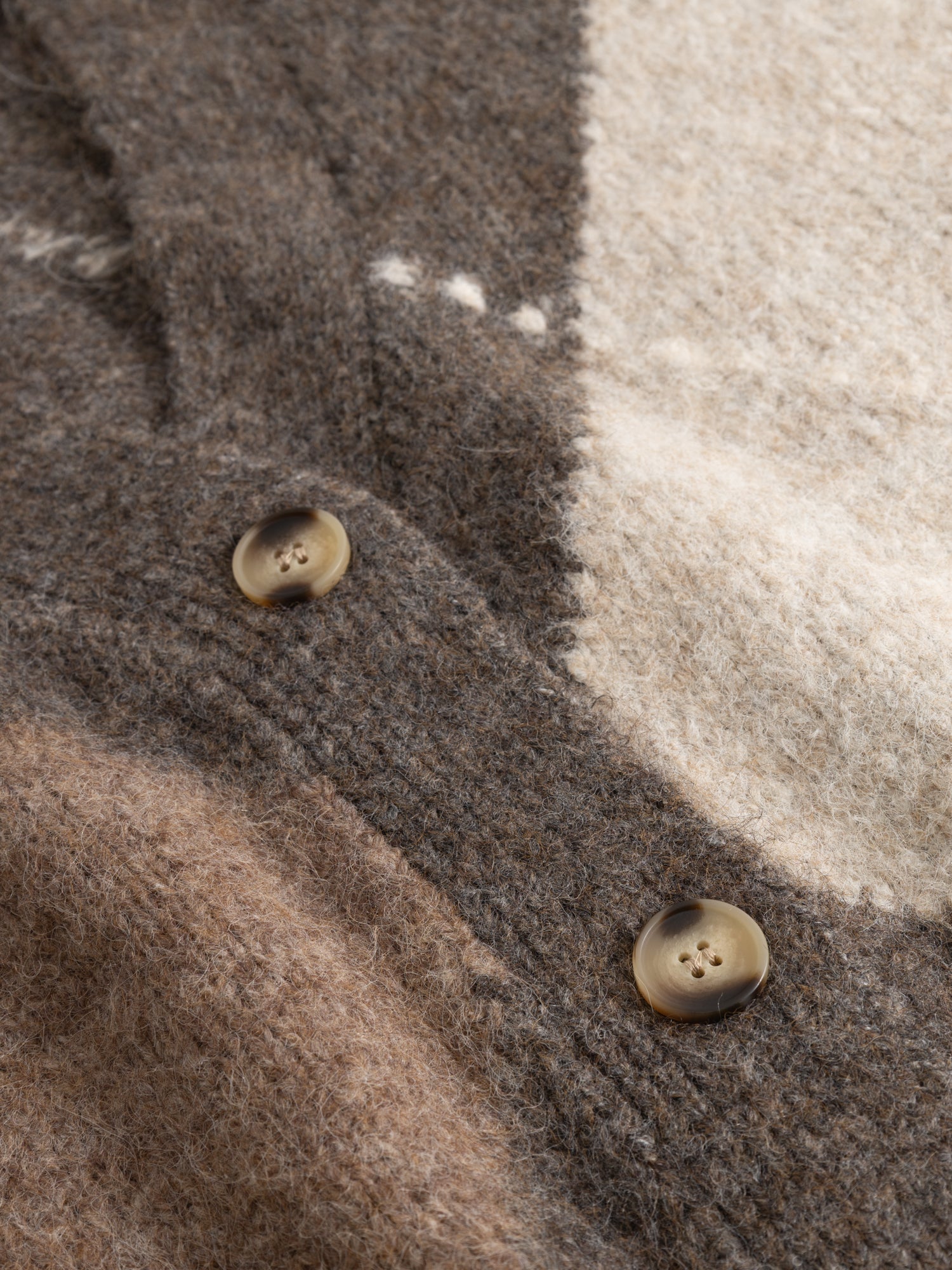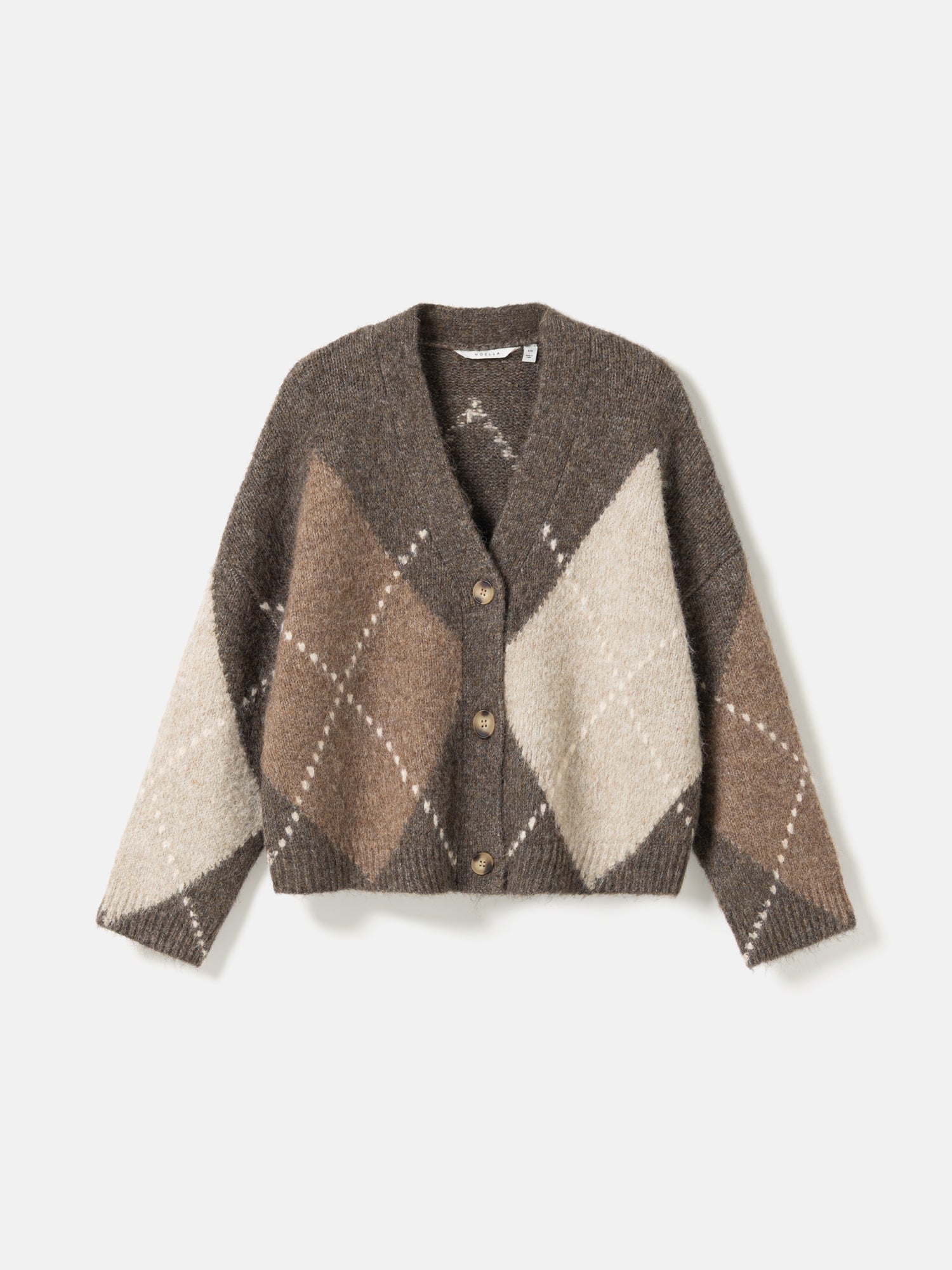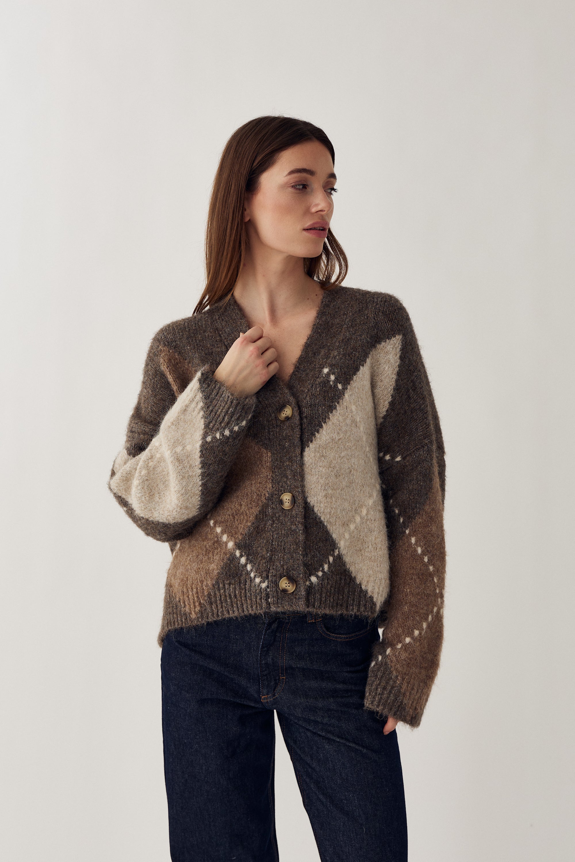 LAIANA KNIT fra NOELLA er en skøn cardigan med et klassisk harlekin-mønster, lange voluminøse ærmer og en afslappet pasform for et elegant og tidløst look.