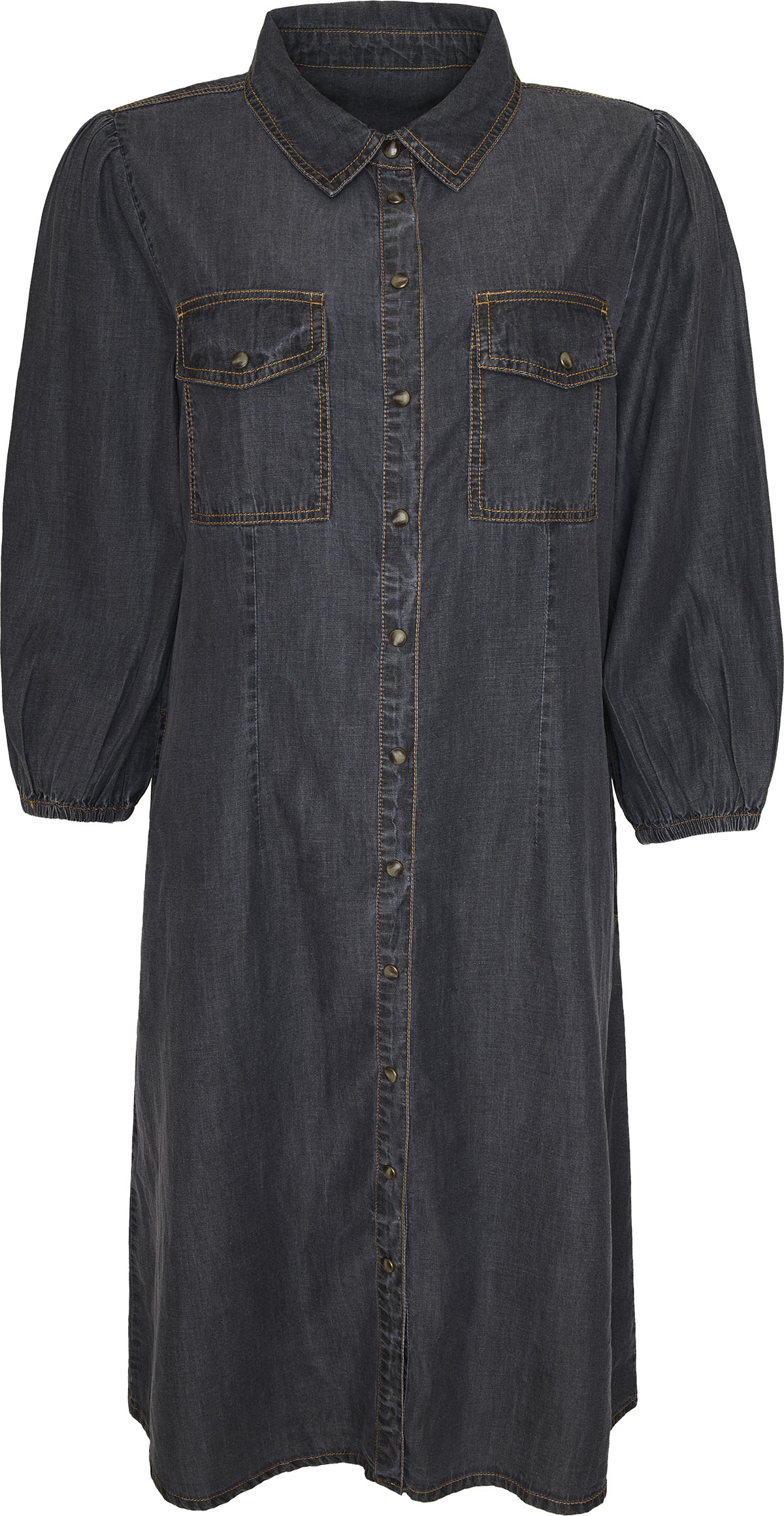 Enkel og anvendelig skjortekjole med 3/4 ærmer, skjortekrave og lommer i siden. Gennemknappet med fine trykknapper og lavet i blød tencel, der falder flot og er behagelig hele dagen.