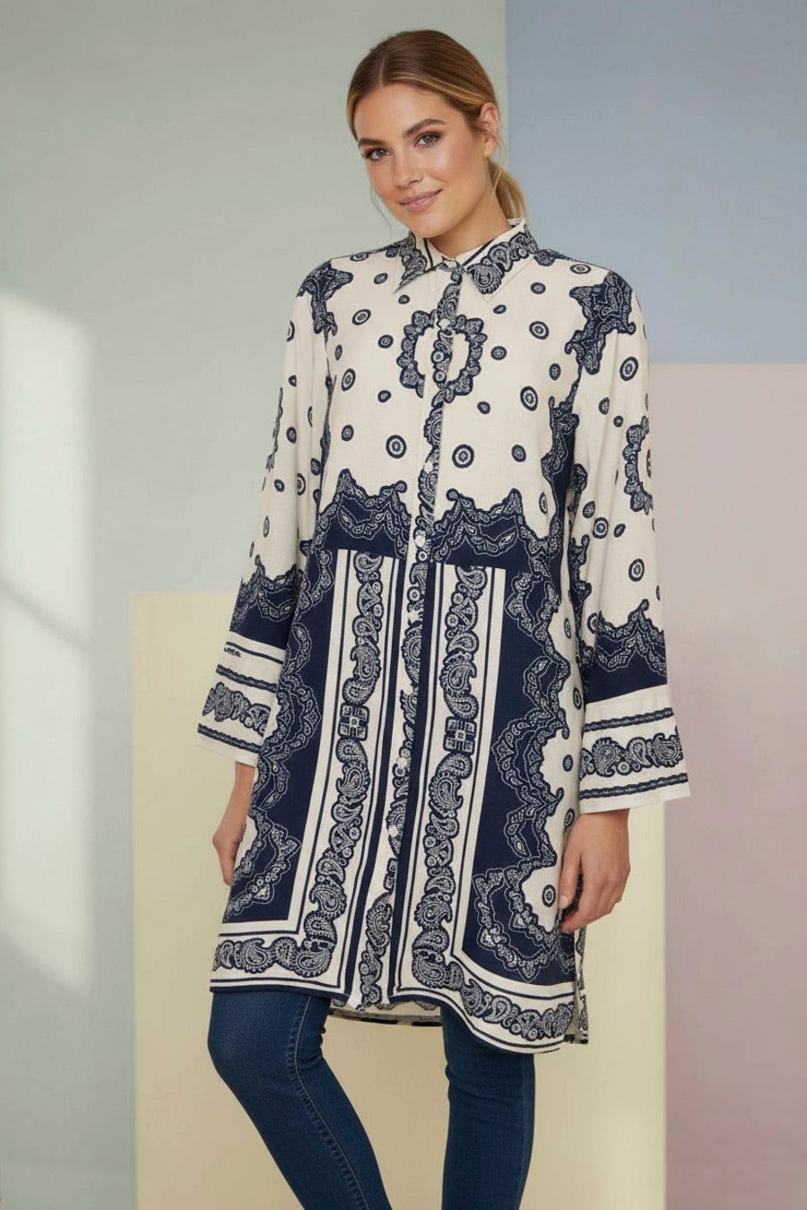 SCARLET tunika kjole fra OFELIA er designet i blød viskose med et smukt placement print i creme og navy. Tunikaen er gennemknappet og har klassisk skjortekrave samt 3/4 lange ærmer med let flair, som giver et elegant og feminint fald.