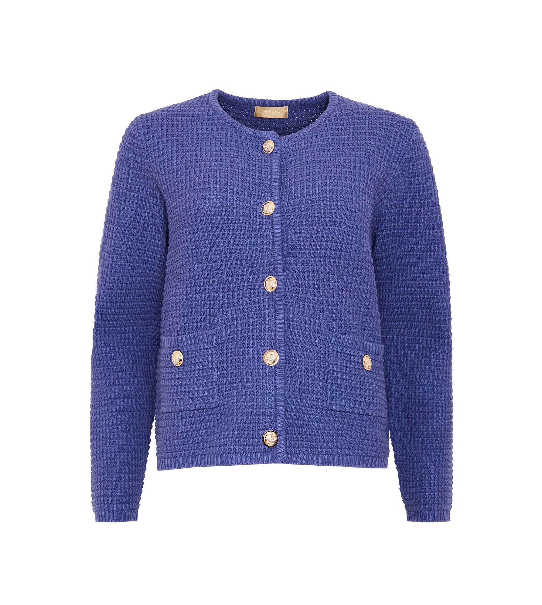 DINA Jacket fra OFELIA er en smuk cardigan til sensommeren. Den er lidt Chanel-inspireret med et enkelt snit, et fint st5rukturmønster, to lommer foran og nogle store flotte guld knapper.