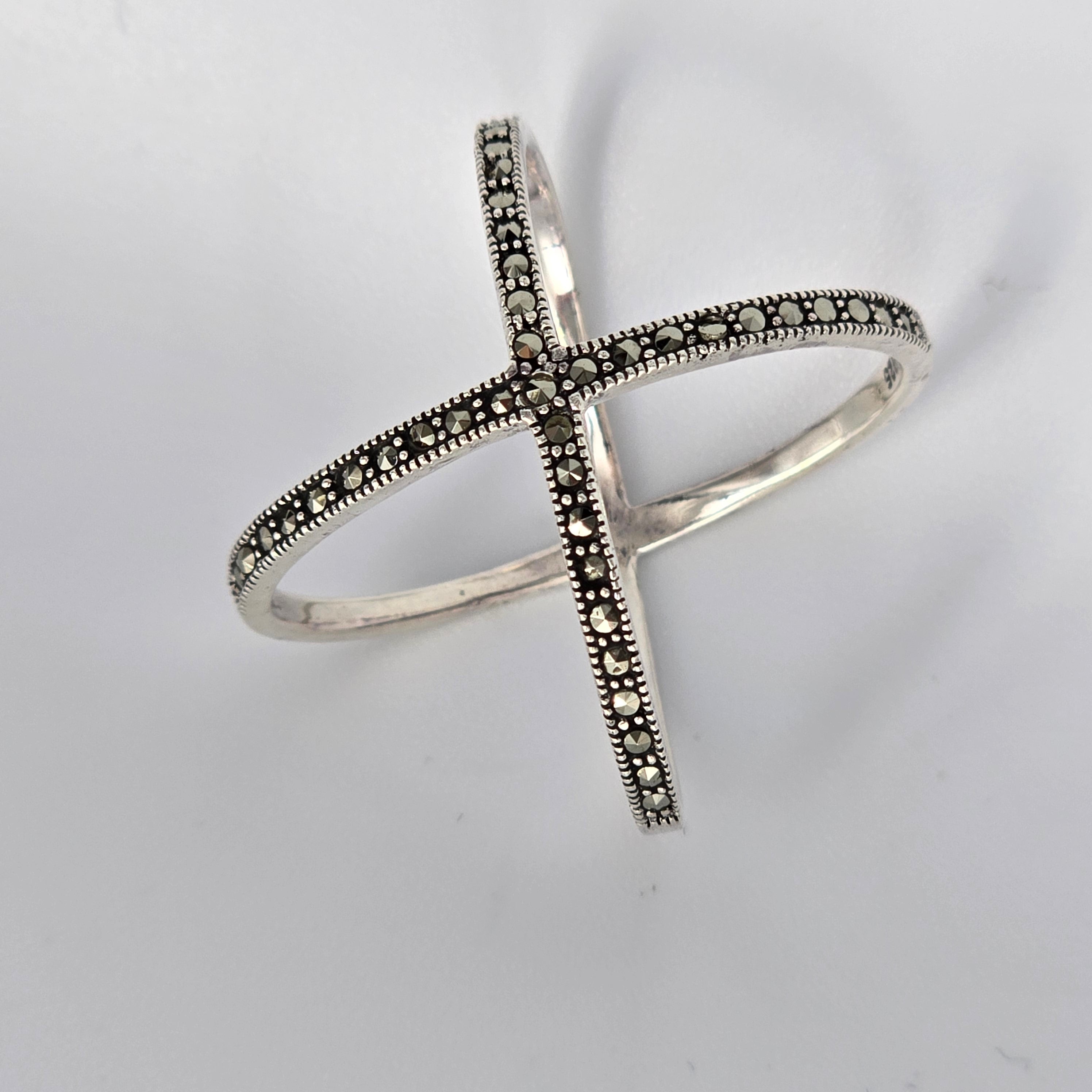 Meget fin enkel ring i sølv, der krydser over fingeren. Isat små zirkonia sten.