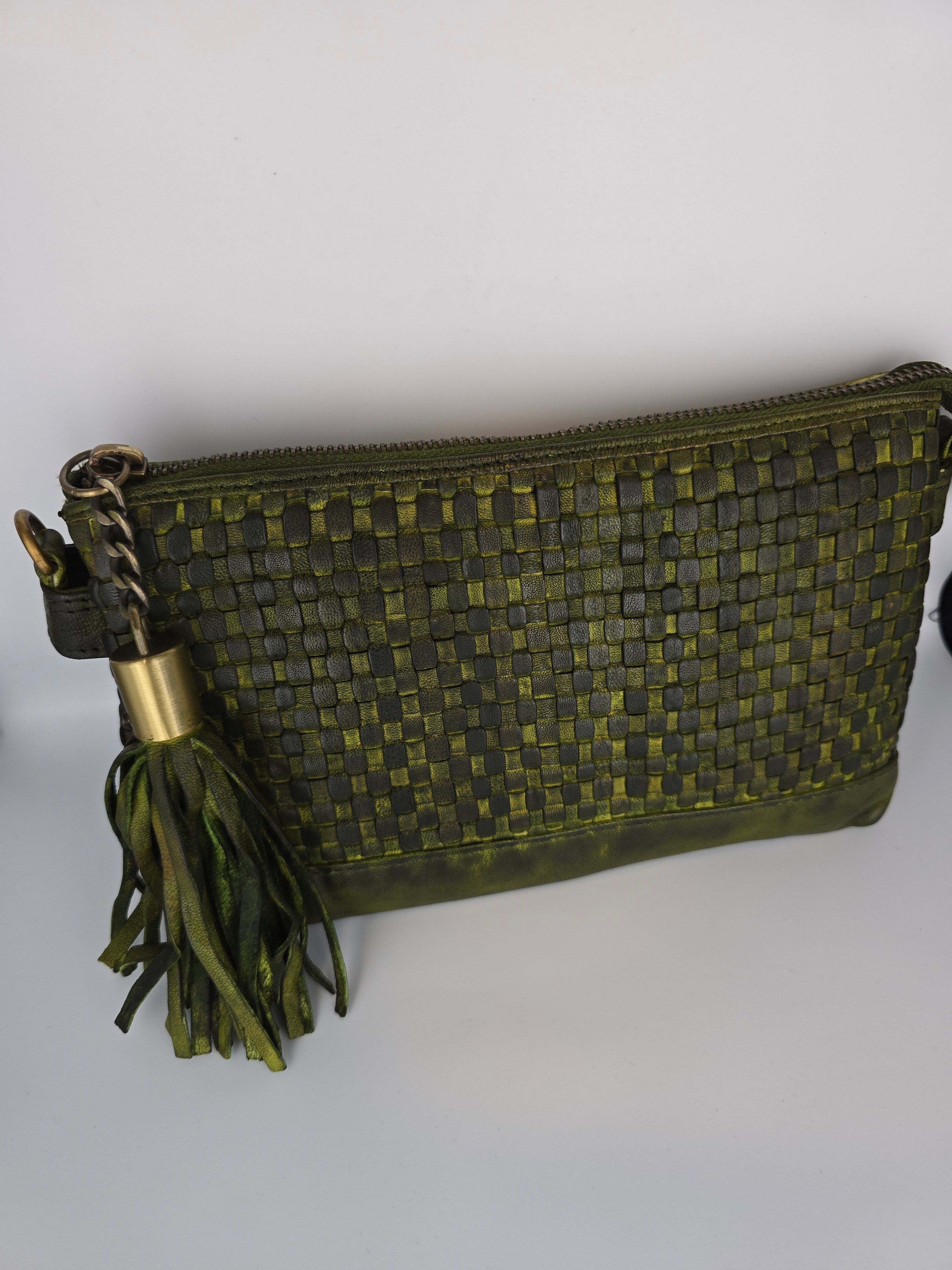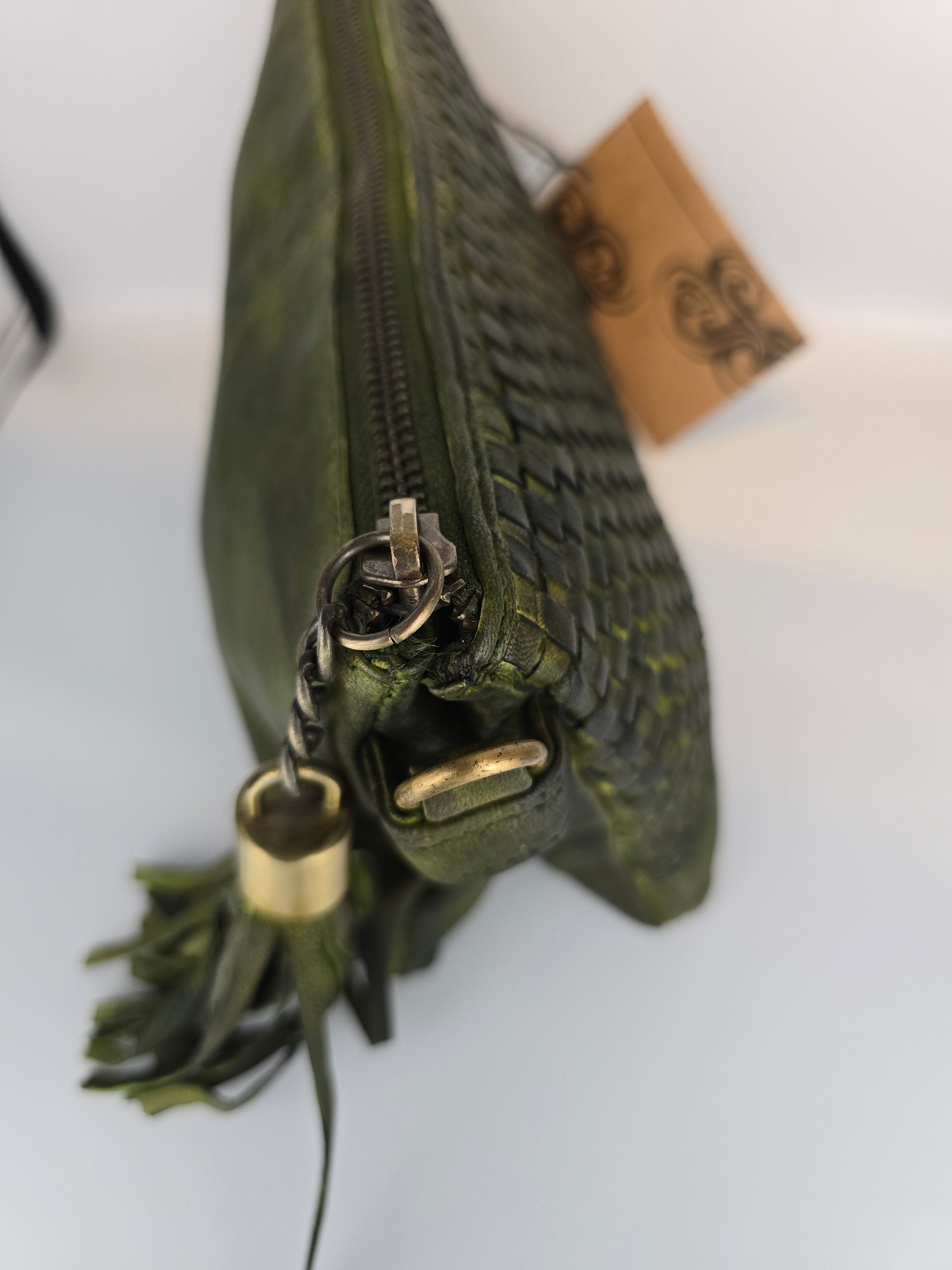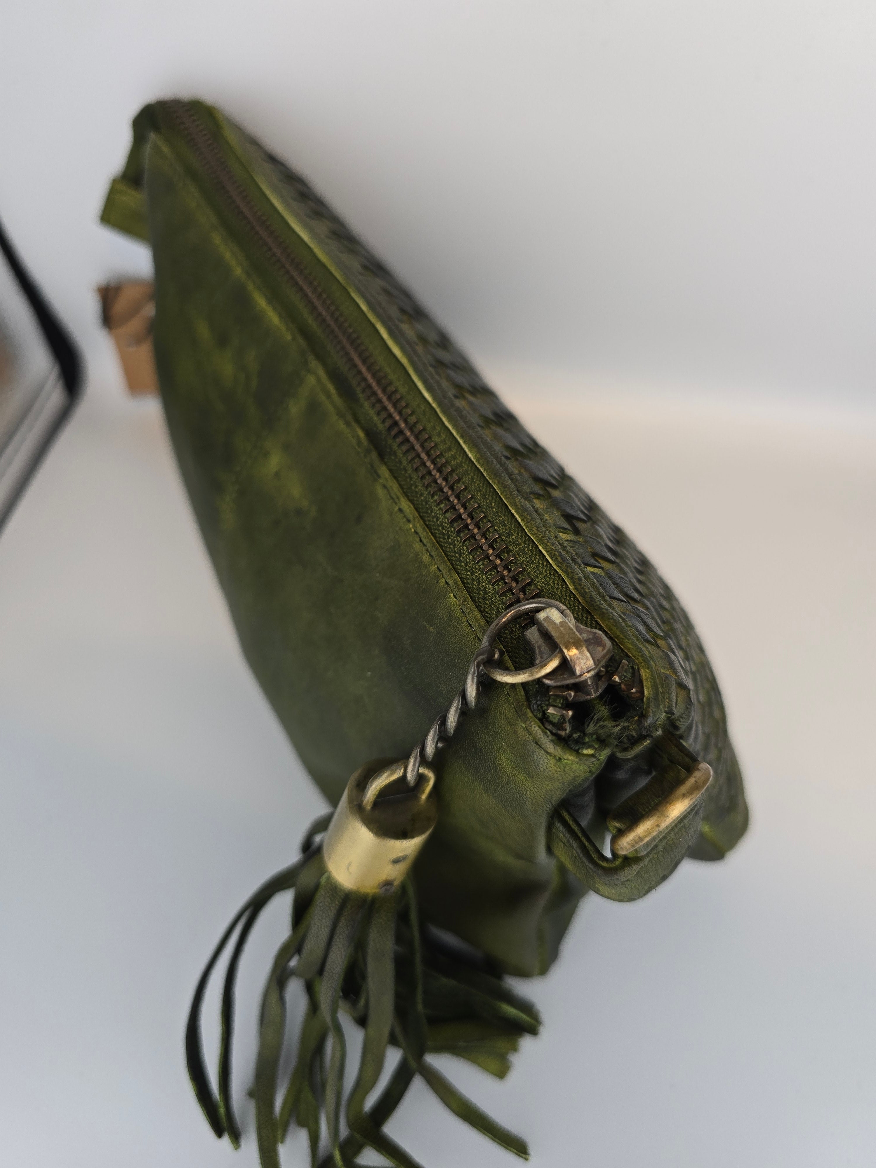 Smuk taske i skind med flet foran. Tasken har to store indvendige rum, en lille lynlåslomme samt en lille kortlomme. Dekorativ kvast på lynlåsen.