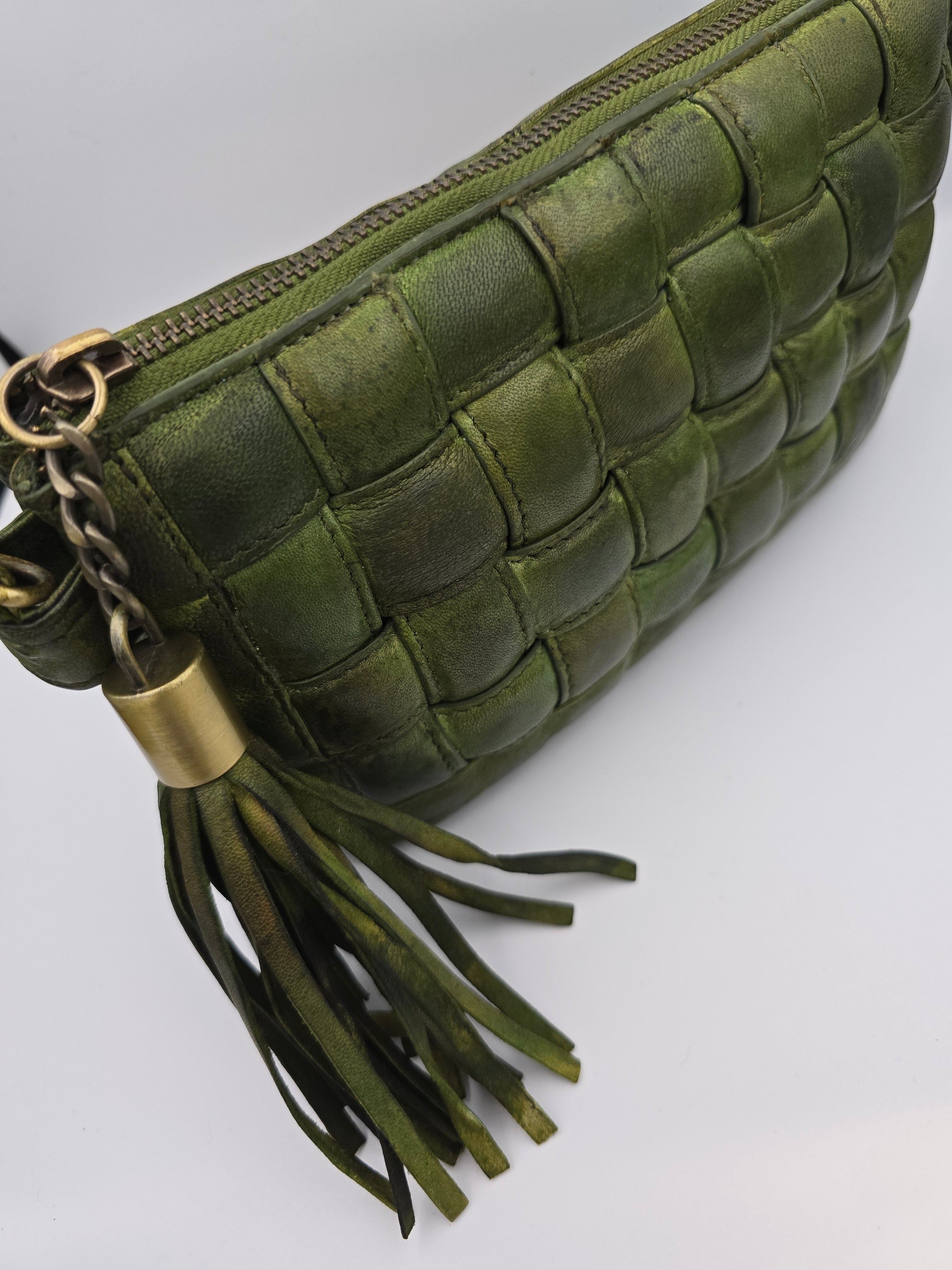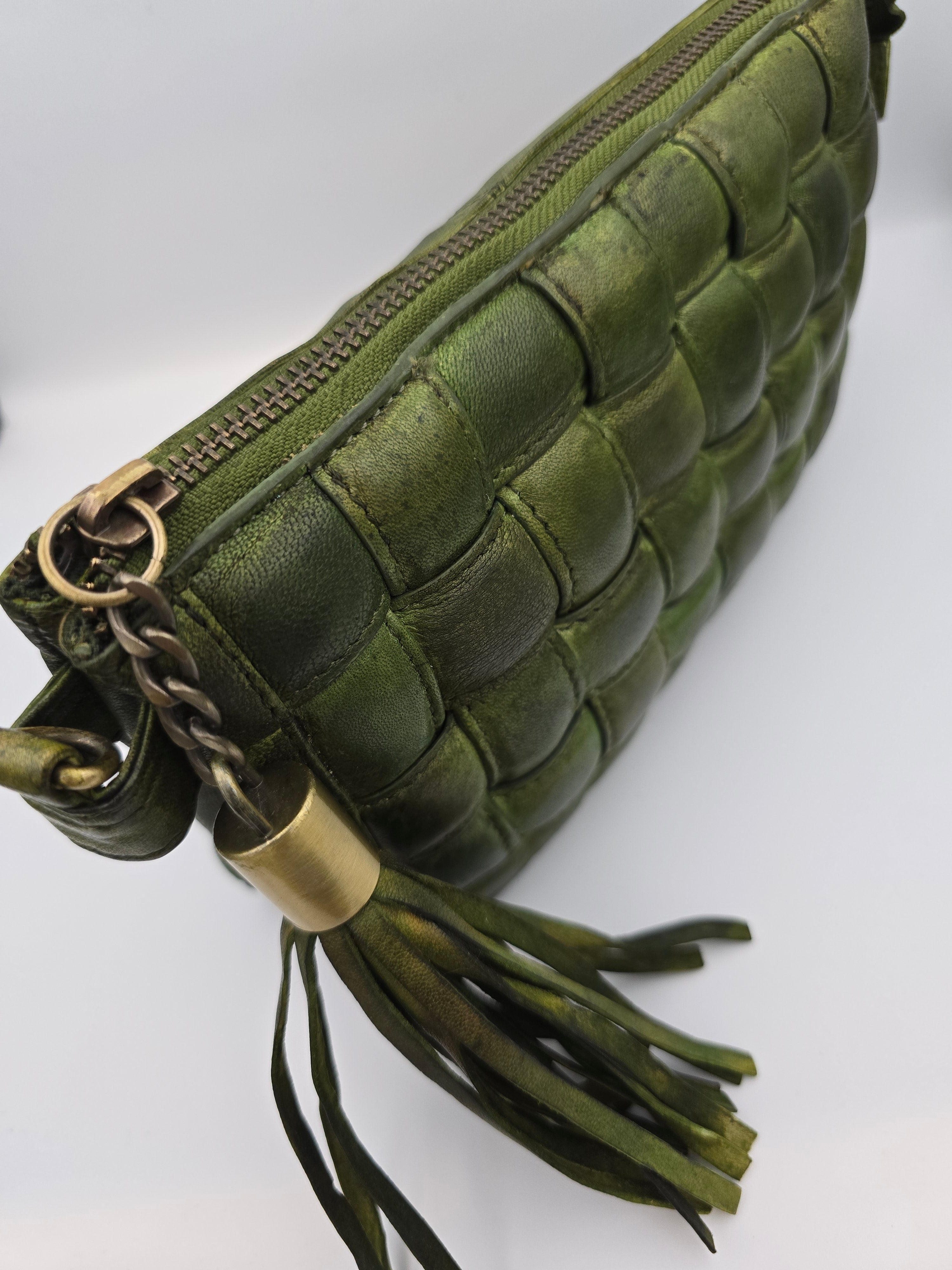 • Smuk taske i skind med stort flet foran. Tasken har to store indvendige rum, en lille lynlåslomme samt en lille kortlomme. Dekorativ kvast på lynlåsen.
