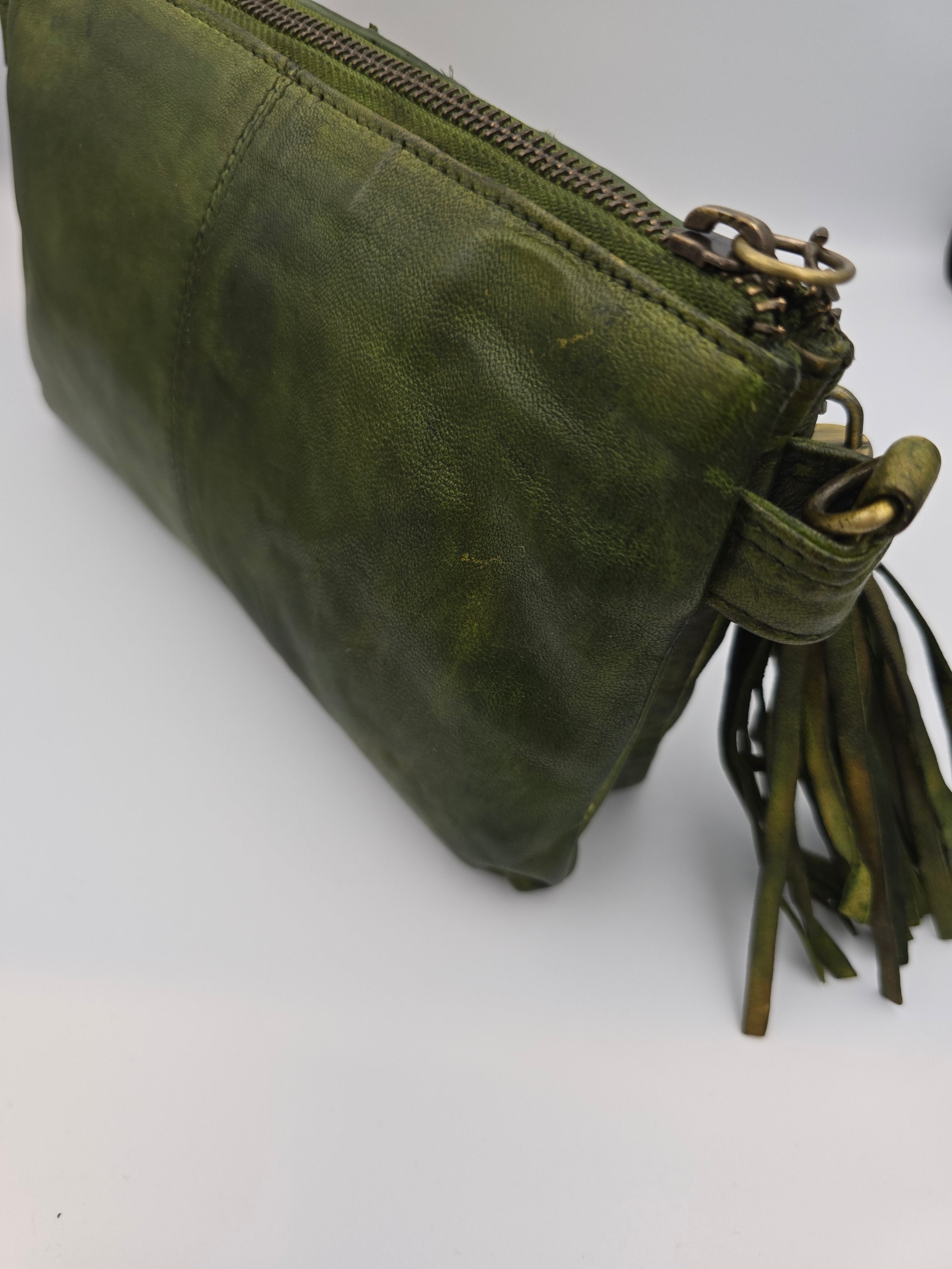 Smuk taske i skind med stort flet foran. Tasken har to store indvendige rum, en lille lynlåslomme samt en lille kortlomme. Dekorativ kvast på lynlåsen.