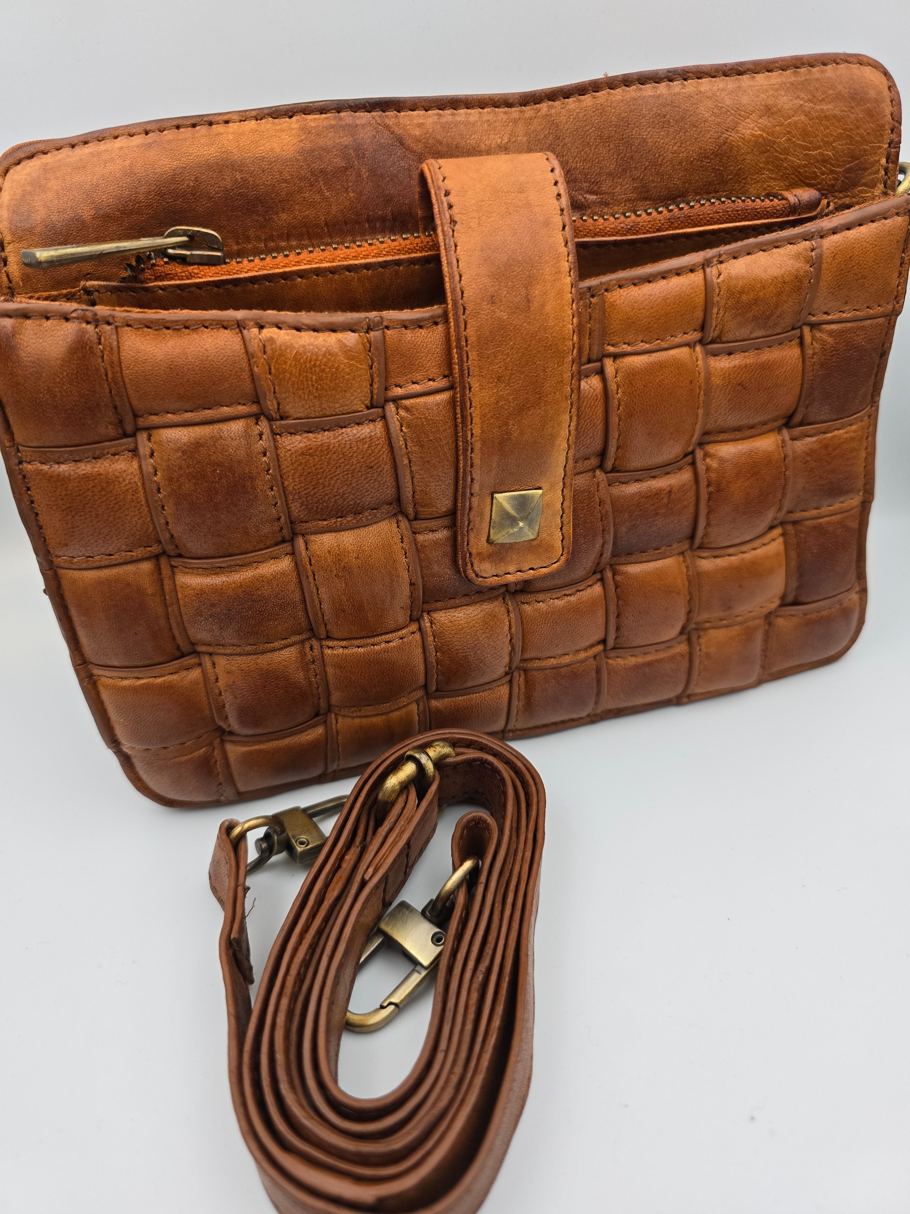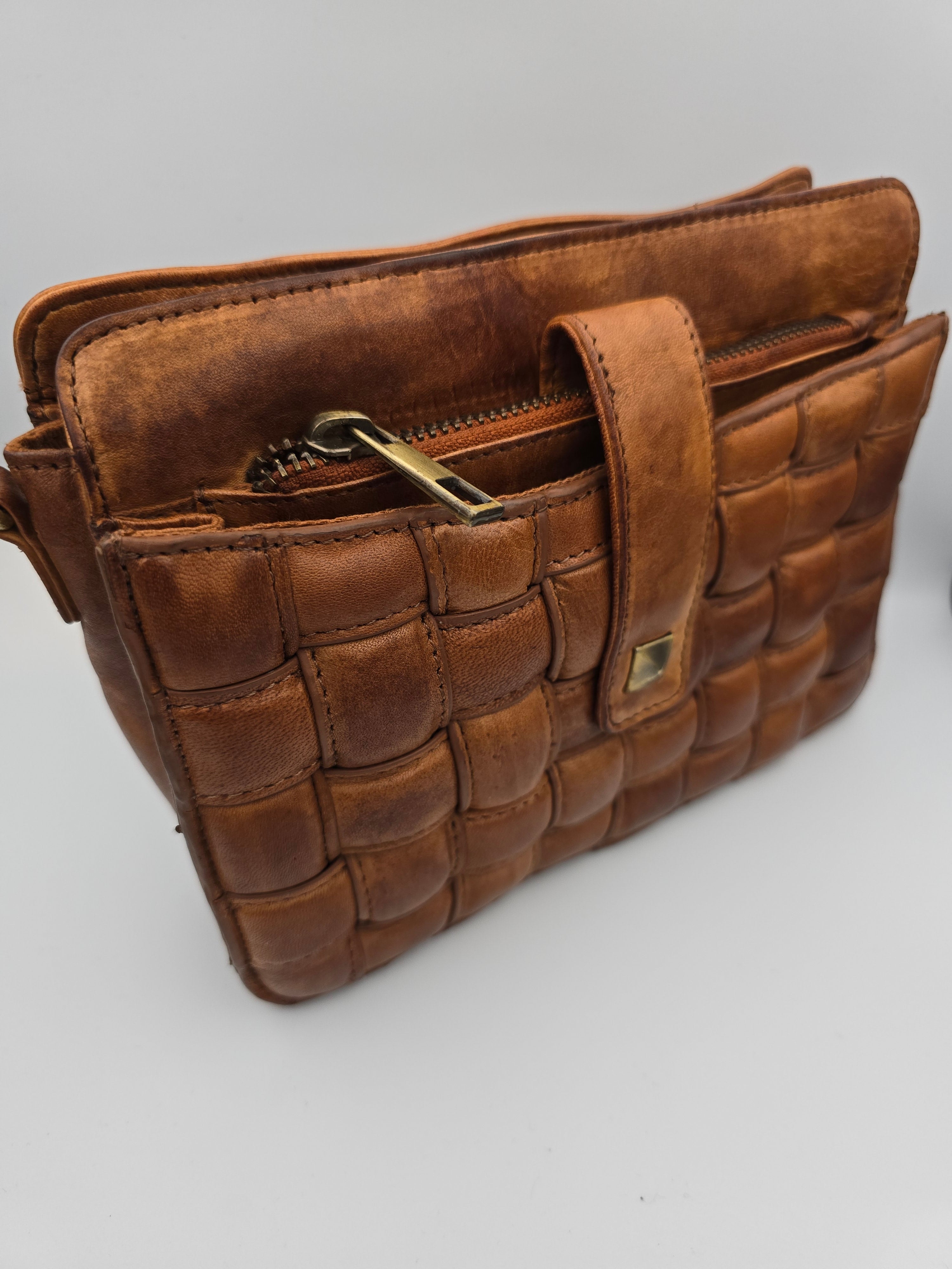 • Smuk taske i skind med stort flet foran. Tasken har mange gode rum: to store indvendige rum, en lille lynlåslomme samt en lille kortlomme. Udvendig er en stor lomme der lukkes med strop, og en lille lynlåslomme.