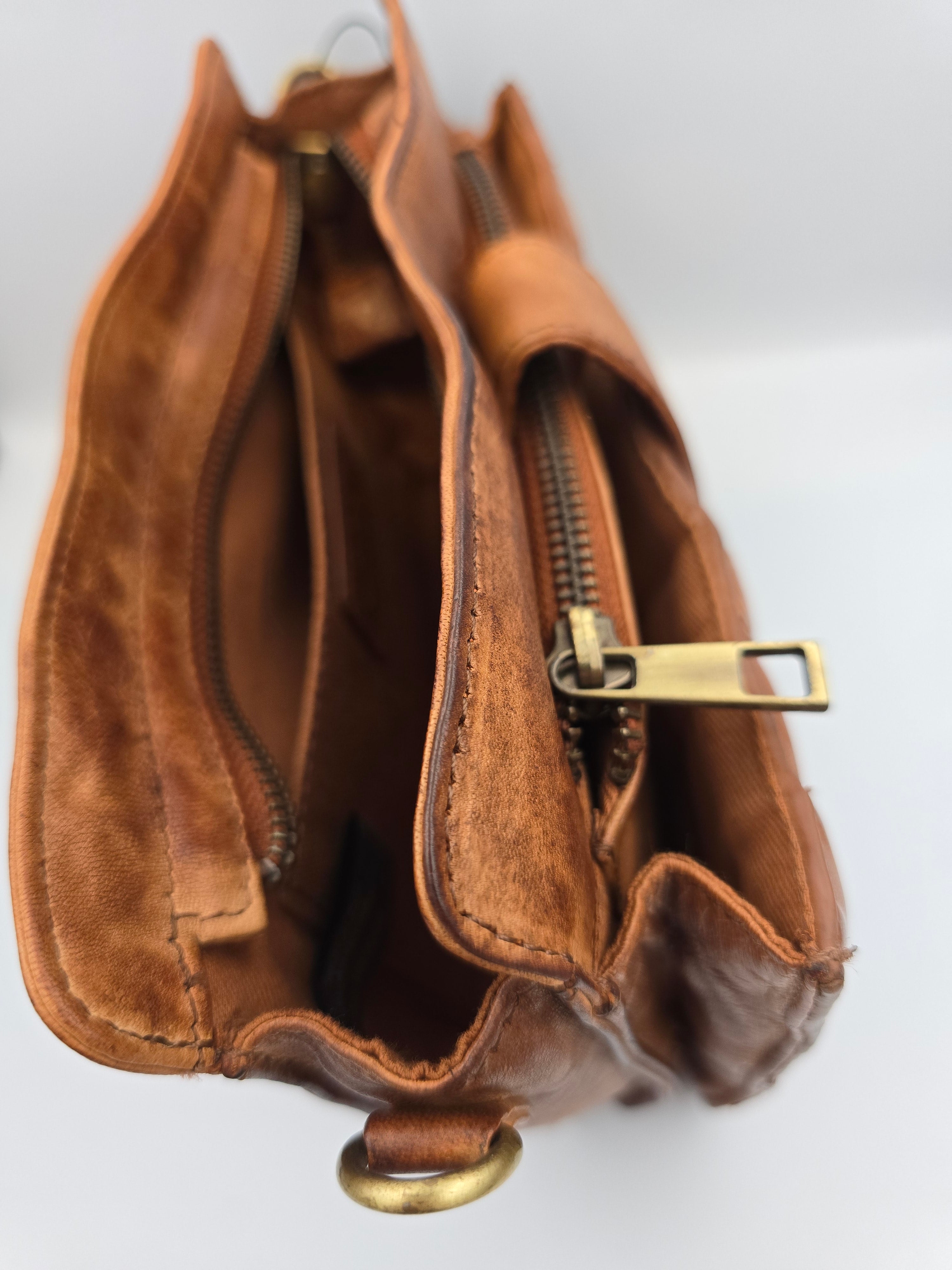 Smuk taske i skind med stort flet foran. Tasken har mange gode rum: to store indvendige rum, en lille lynlåslomme samt en lille kortlomme. Udvendig er en stor lomme der lukkes med strop, og en lille lynlåslomme.