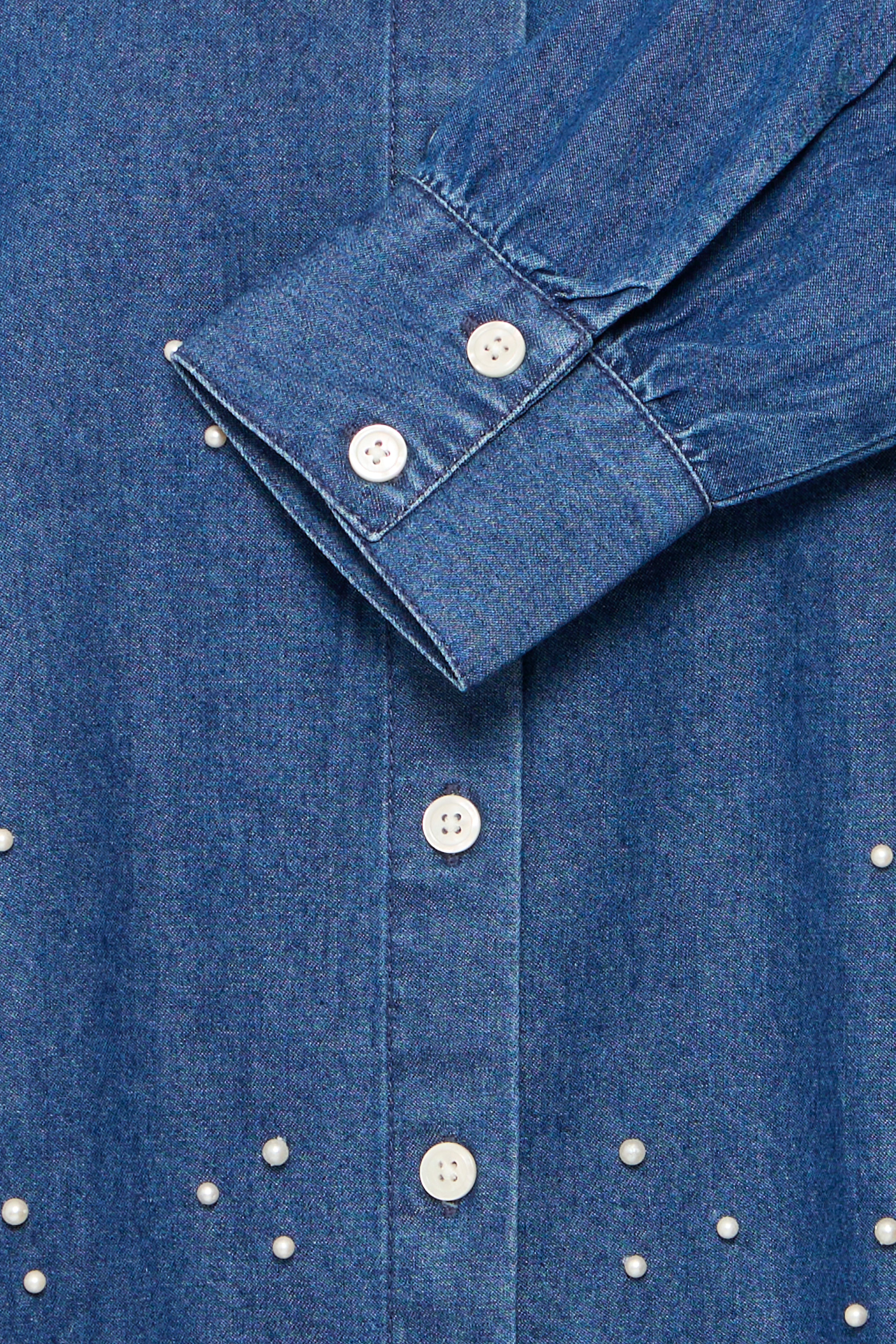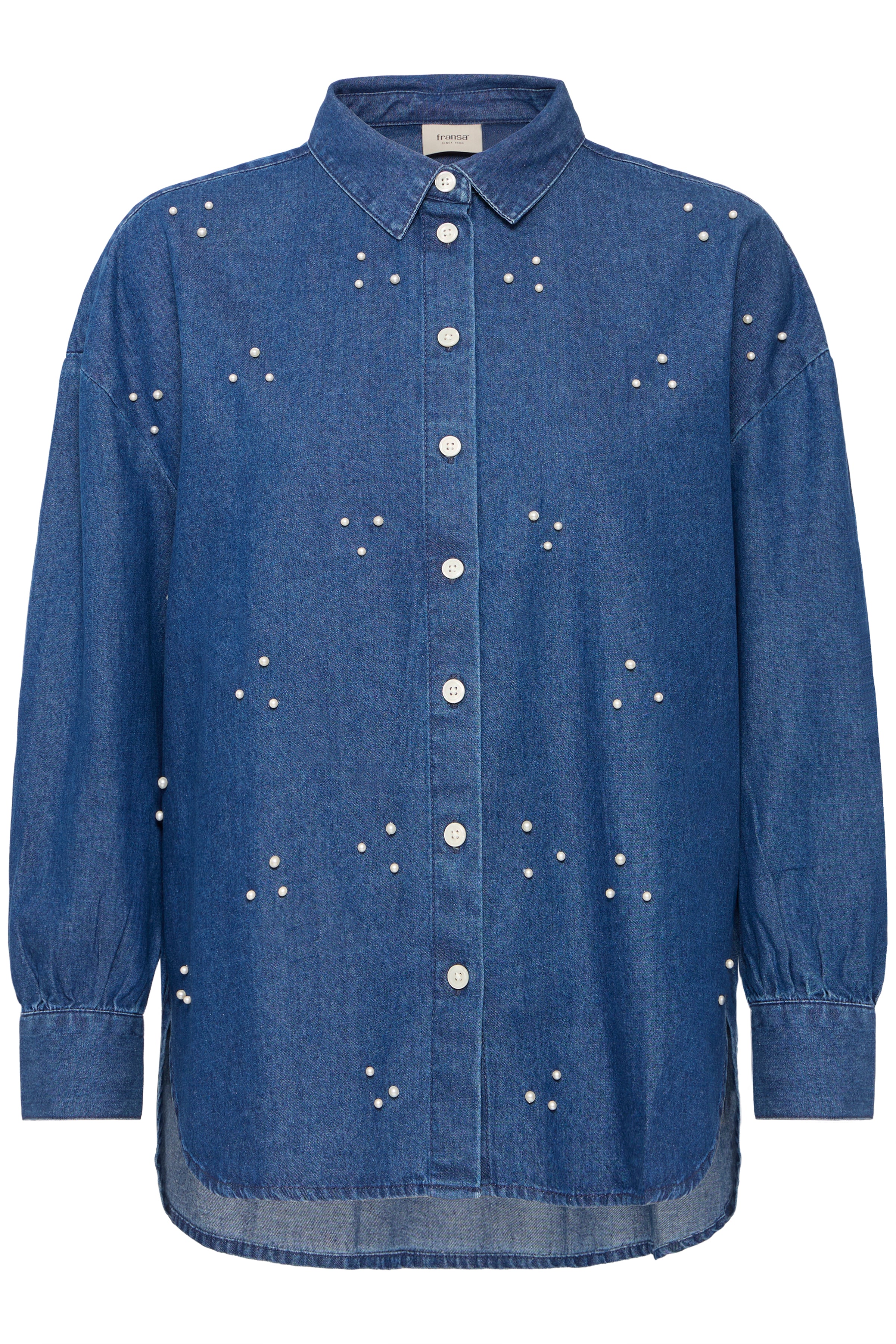 FRCALANTHA SH1 skjorte fra FRANSA er en flot skjorte i light blue denim, dekoreret med påsyede perler. Den er let rummelig uden at være oversize. Skjorten har lange ærmer og en fin klassisk flip.