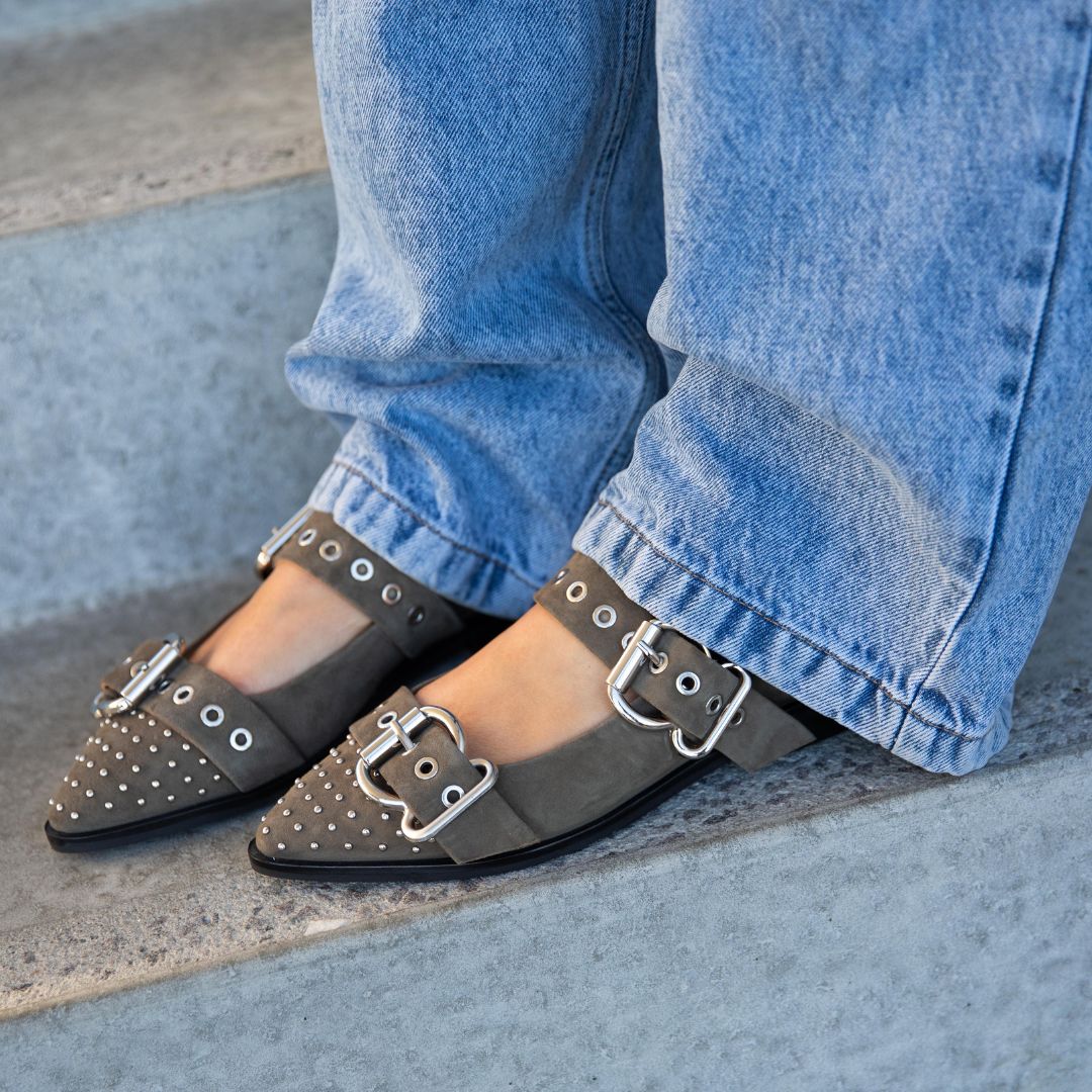Future Vibes Ballerina fra Copenhagen Shoes er kommet i grøn suede model med seje detaljer. Den har et spænde som sidder henover vristen og der er smukke nitte detaljer ved snuden.