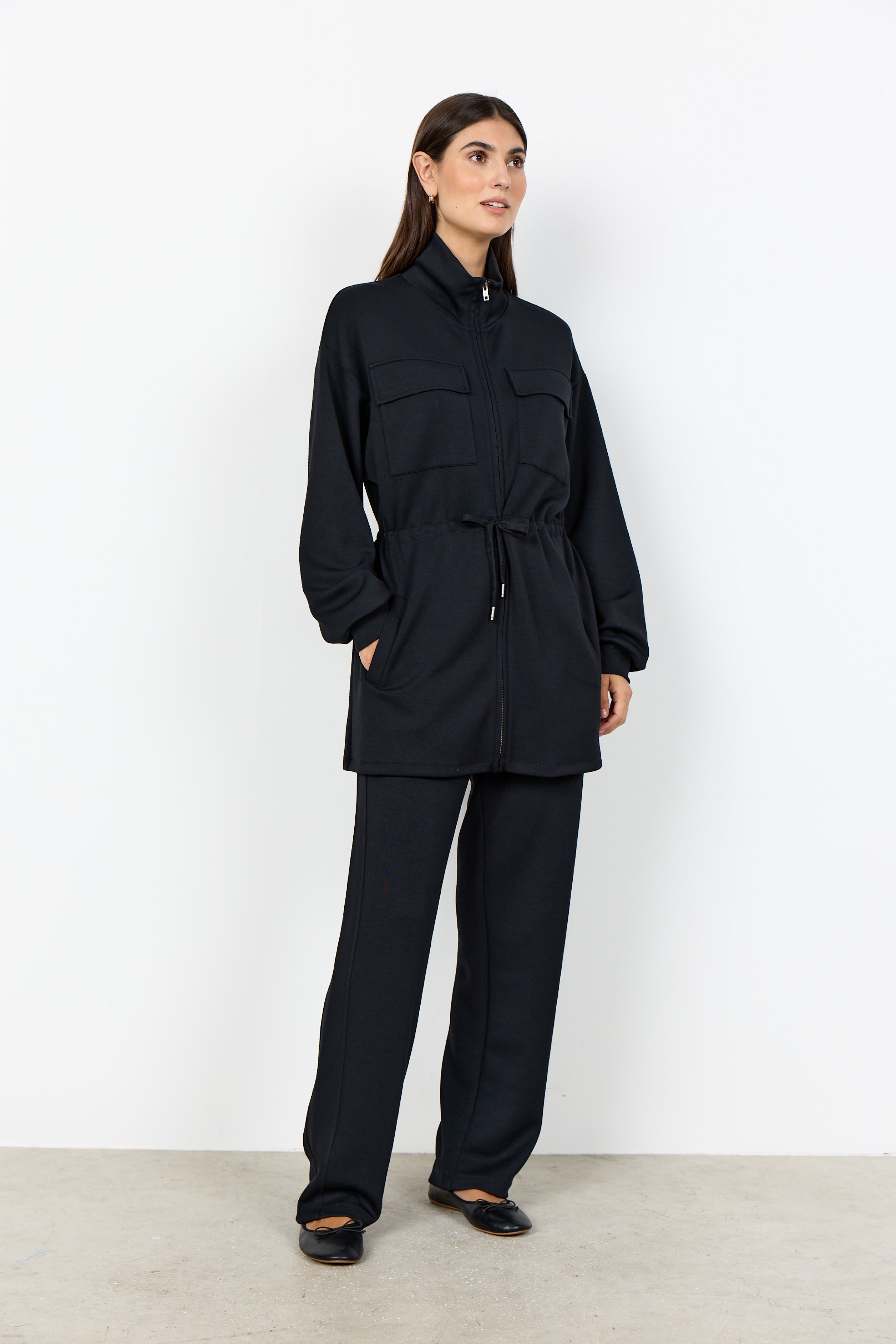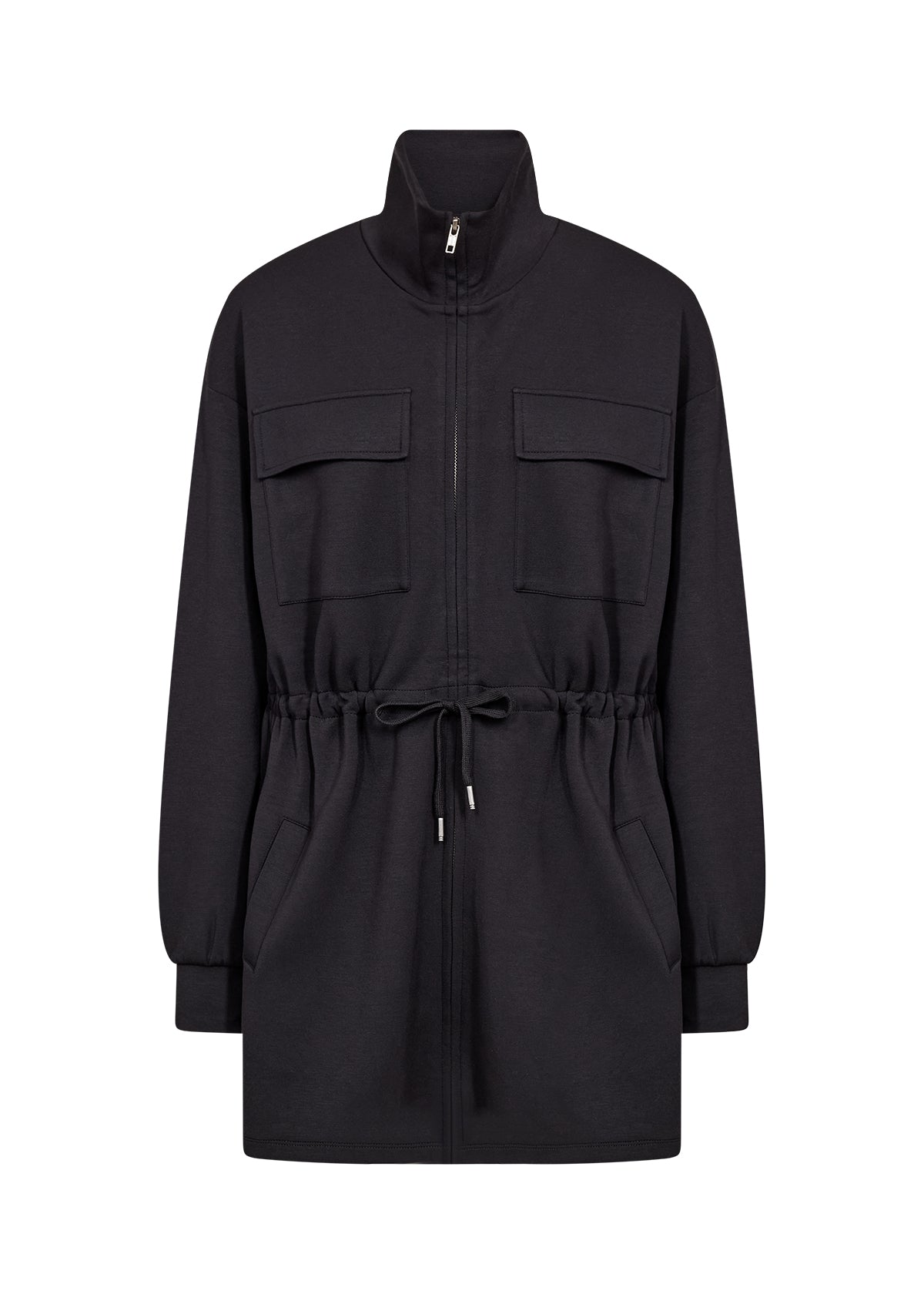 BANU 294 fra SOYACONCEPT er en lækker cardigan. Den har lynlås foran med høj krave, to klaplommer og justerbar snøre i taljen.