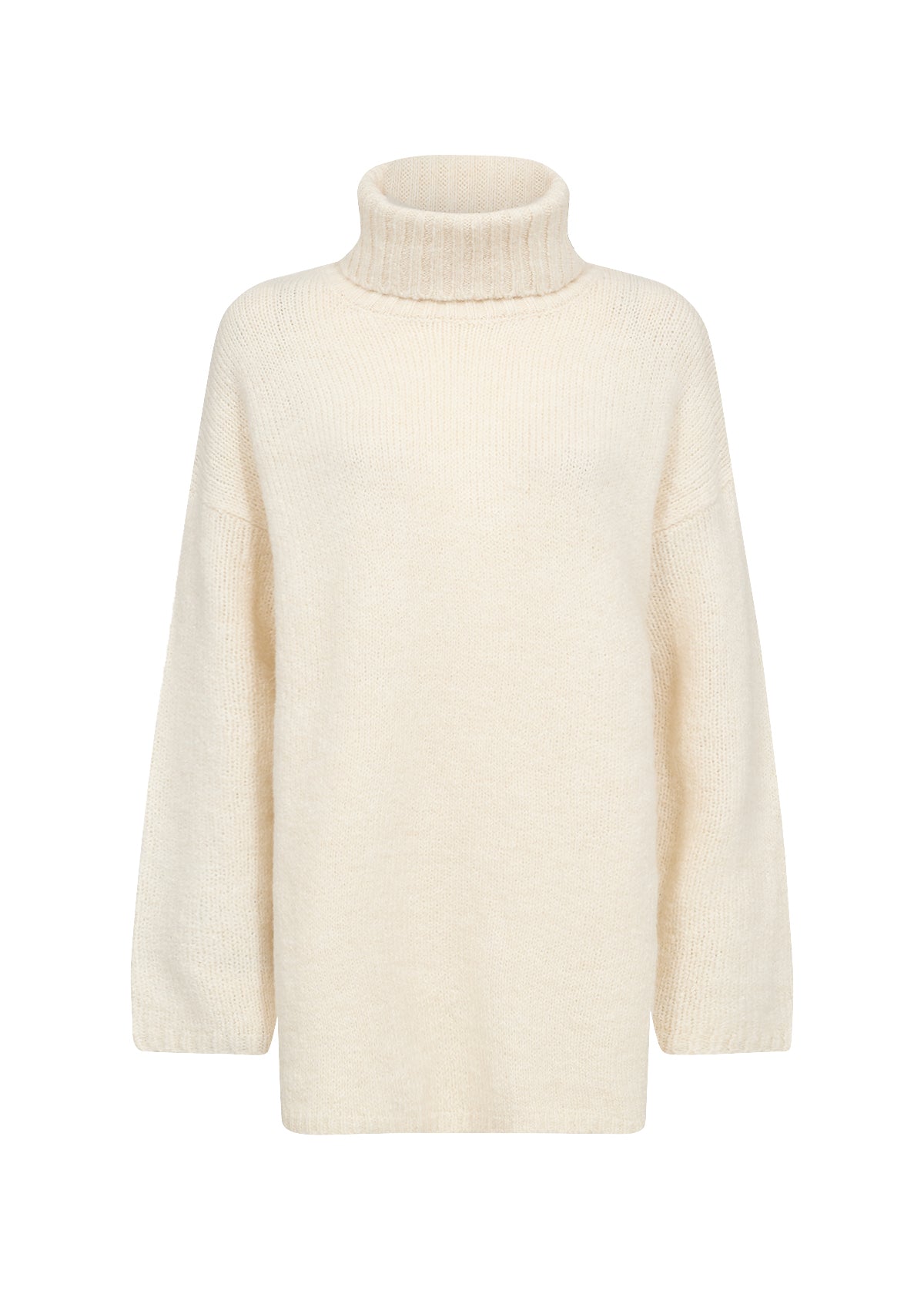 Pulloveren har en stor rullekrave, lange ærmer og en oversized pasform.