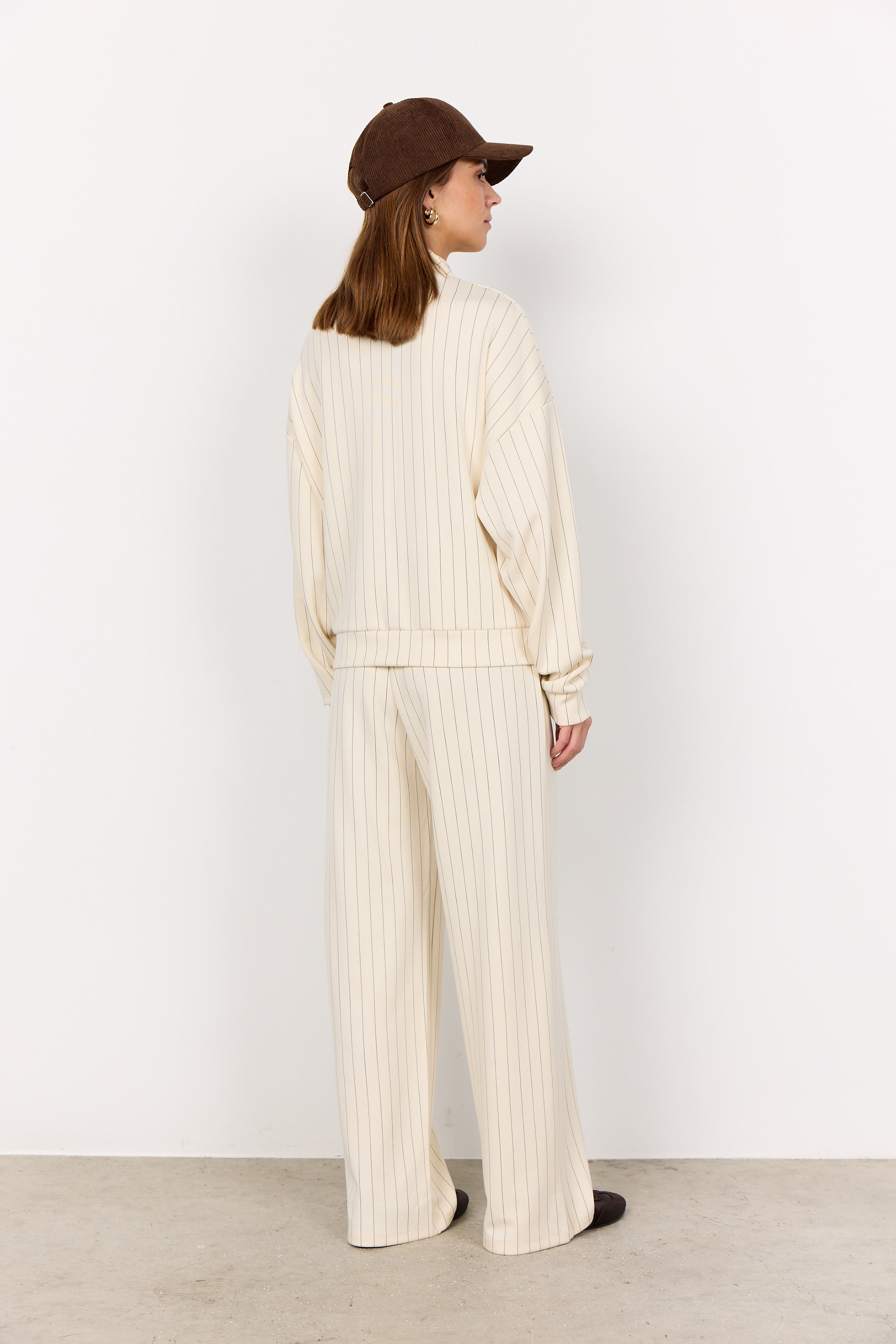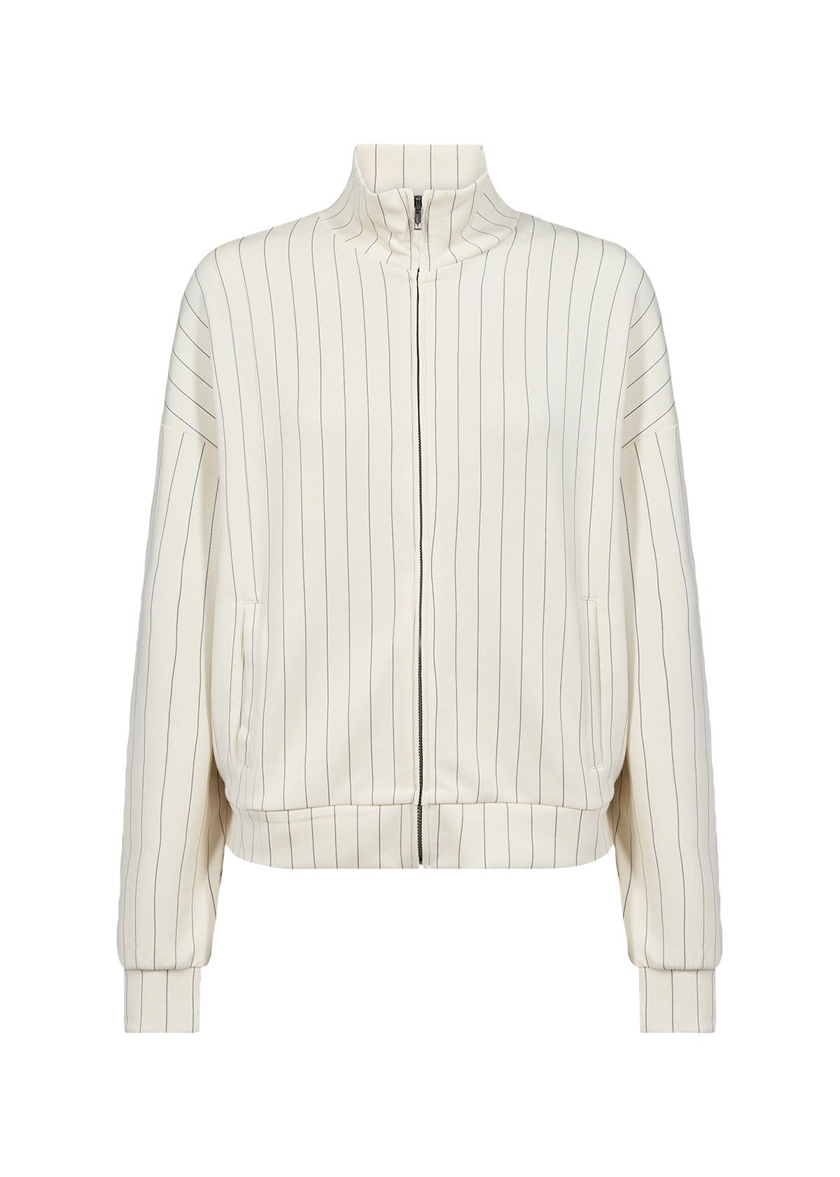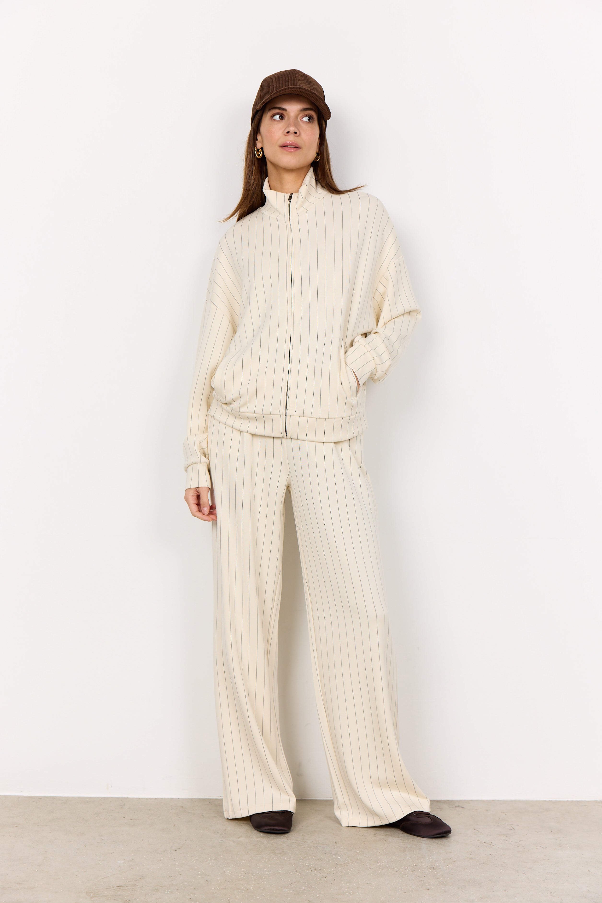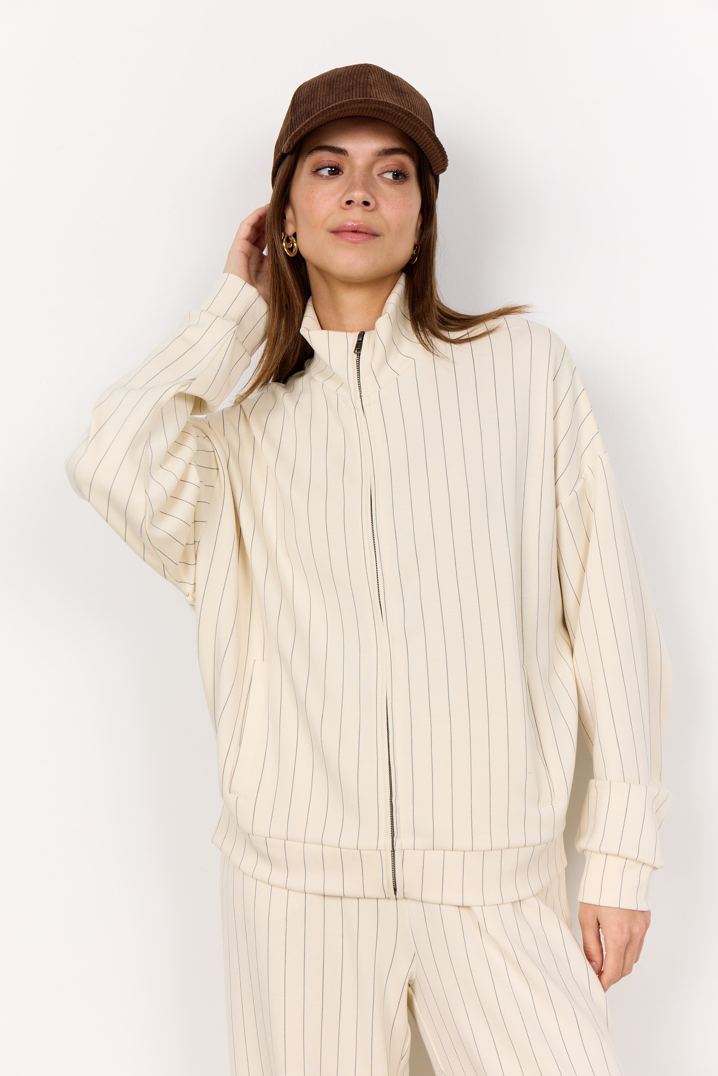 • SIRI 2  fra SOYACONCEPT er en jakke i en blanding af 48 % modal, 48 % polyester og 4 % elastan. Den har en høj krave, lynlåslukning og et klassisk nålestribet mønster.