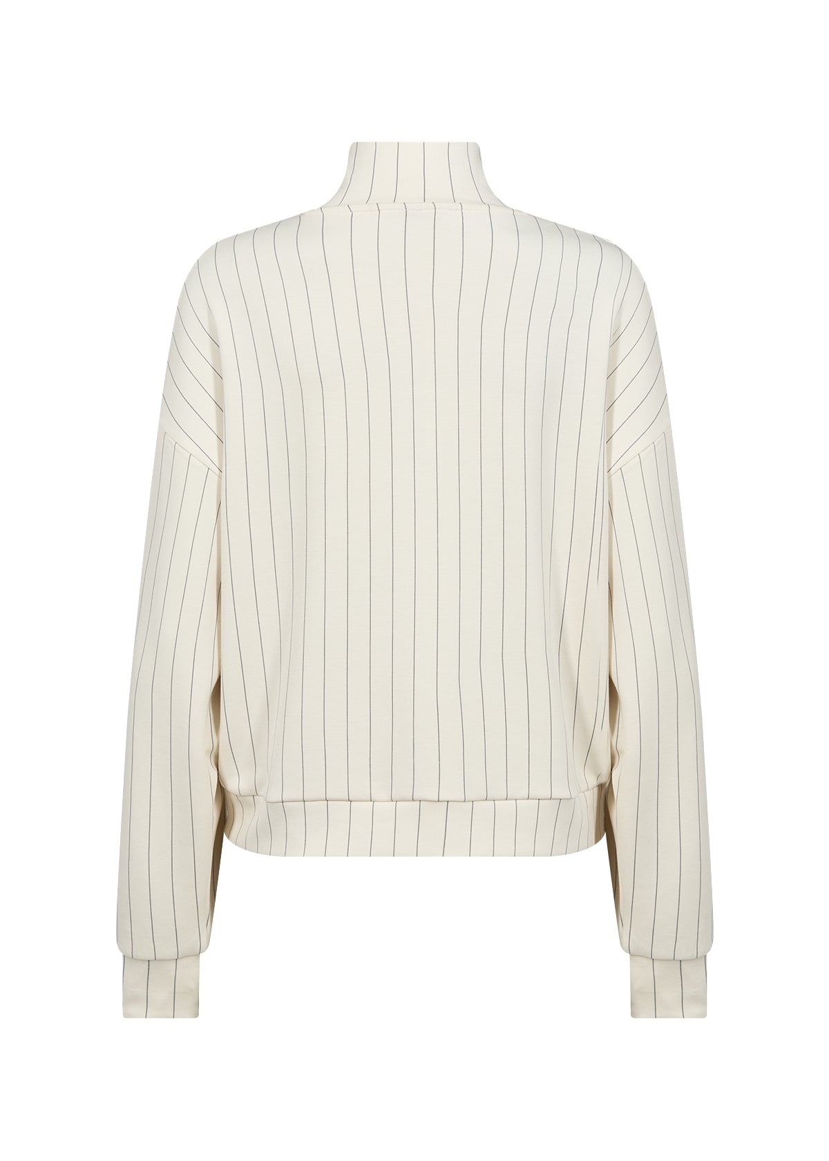 SIRI 2  fra SOYACONCEPT er en jakke i en blanding af 48 % modal, 48 % polyester og 4 % elastan. Den har en høj krave, lynlåslukning og et klassisk nålestribet mønster.