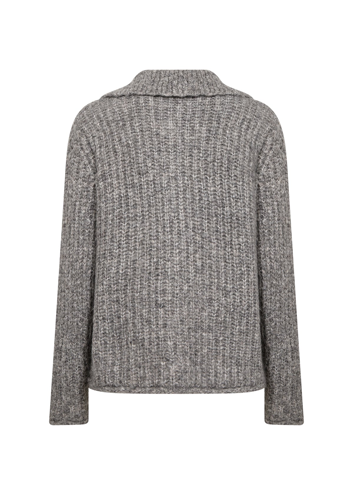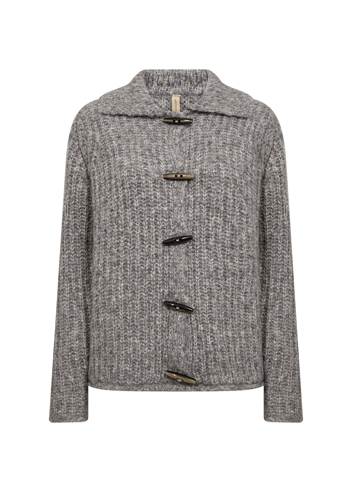 Cardiganen har et struktureret strikdesign med en stilfuld krave og unikke knapper.