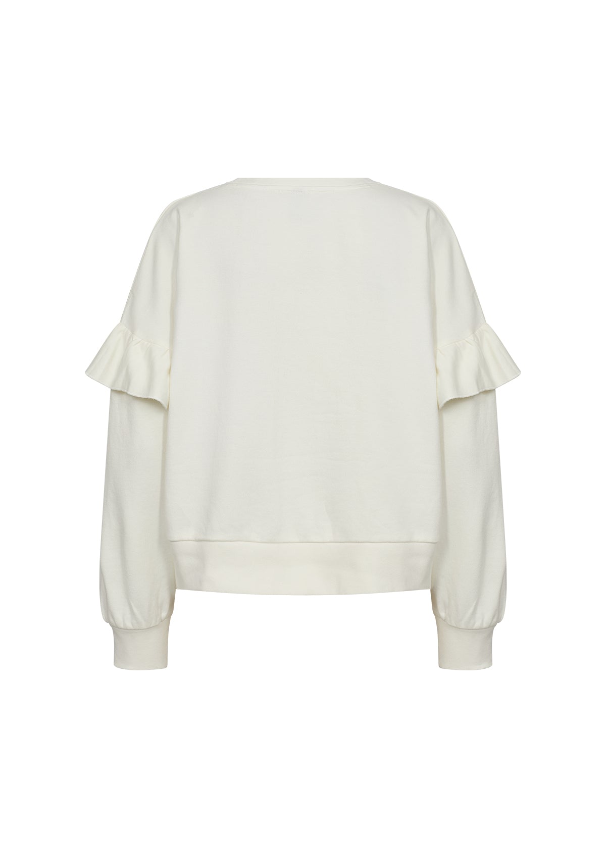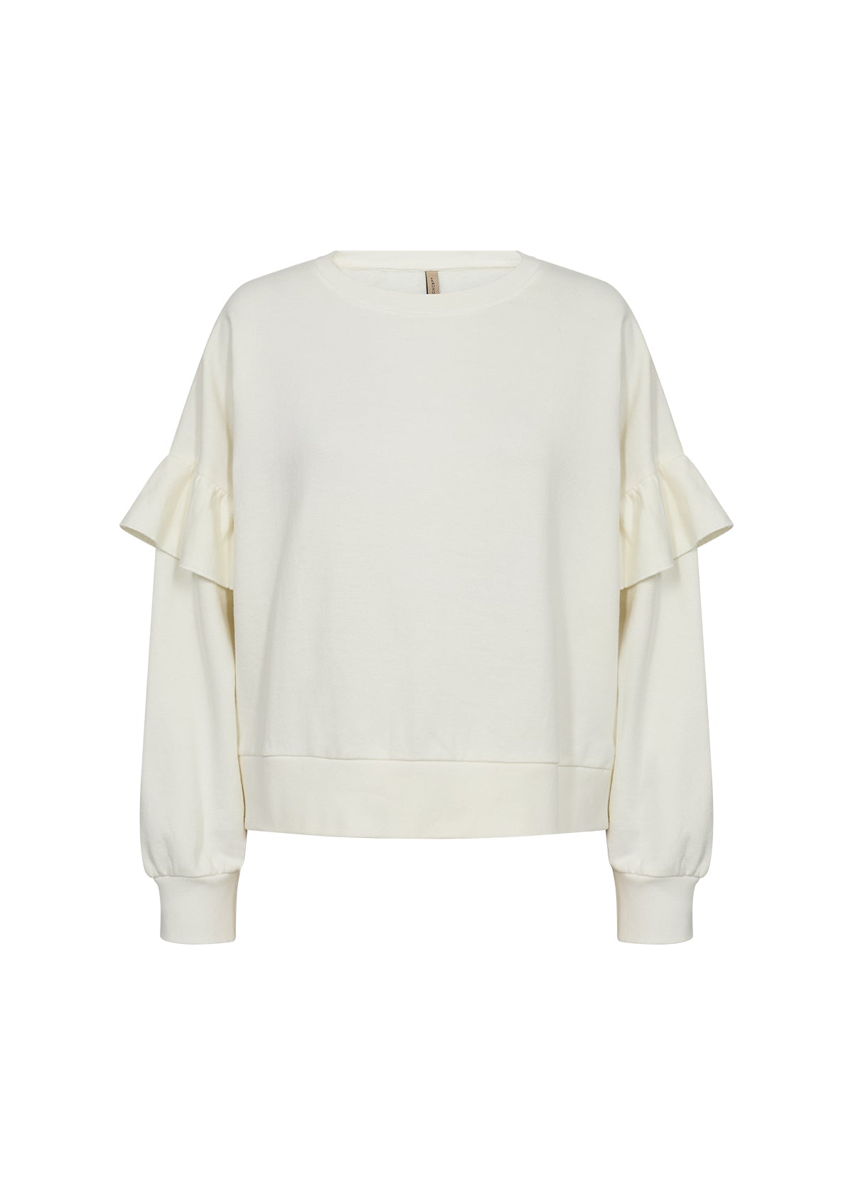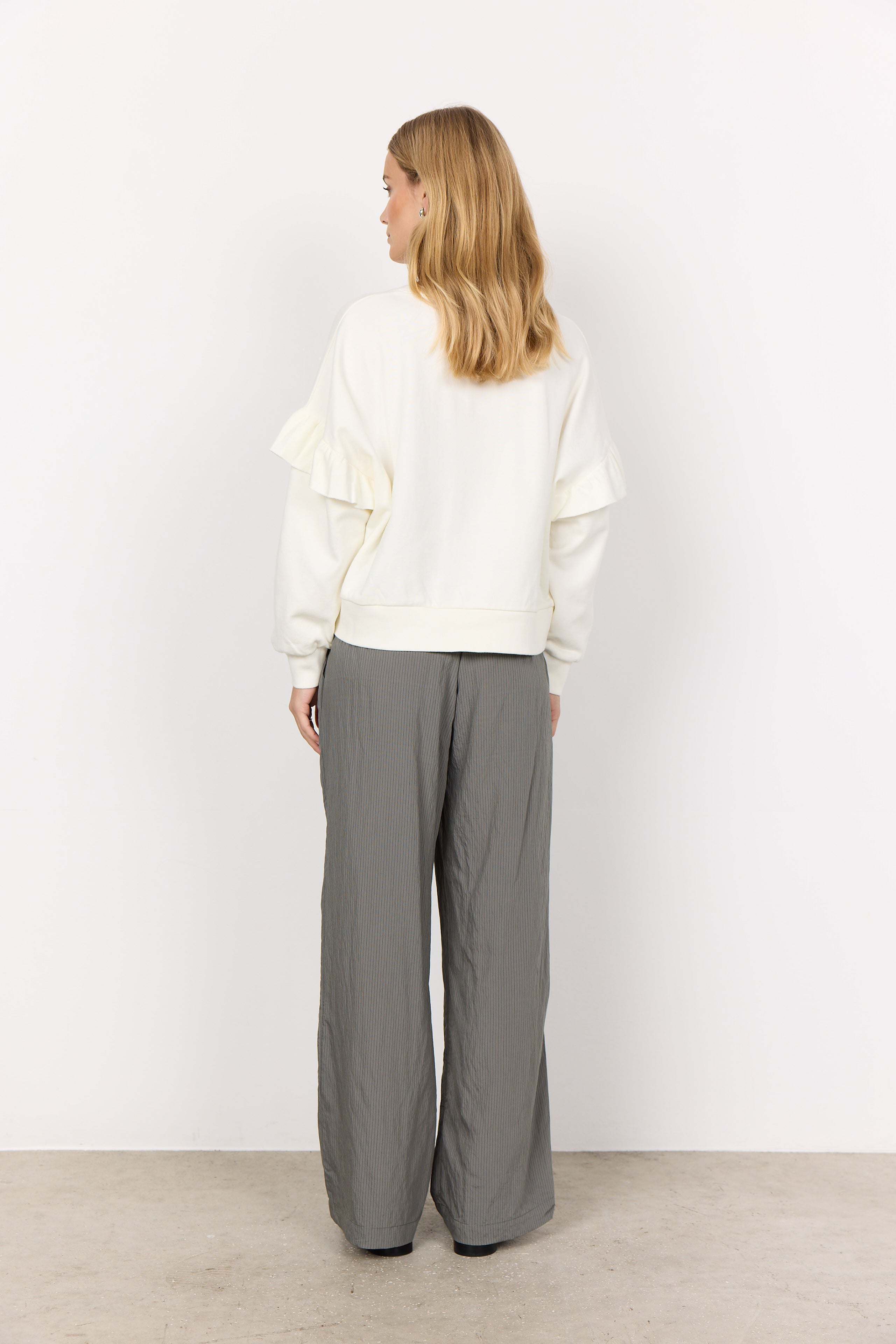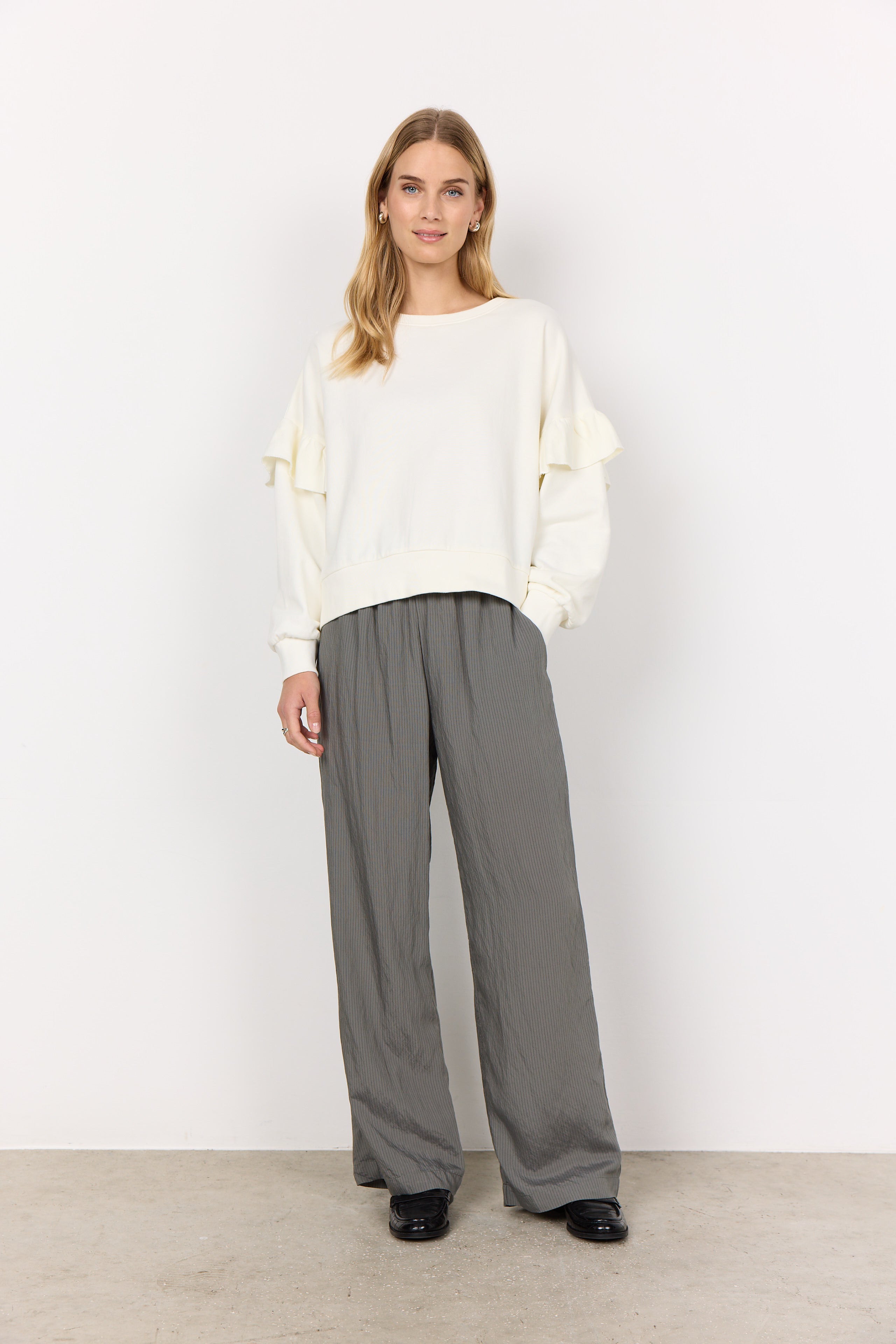 LORAINE fra SOYACONCEPT er en behagelig sweatshirt fremstillet af en blanding af 85 % økologisk bomuld og 15 % genanvendt polyester. Den har en afslappet pasform med flæsedetaljer på ærmerne samt manchetter og underkant i samme materiale.