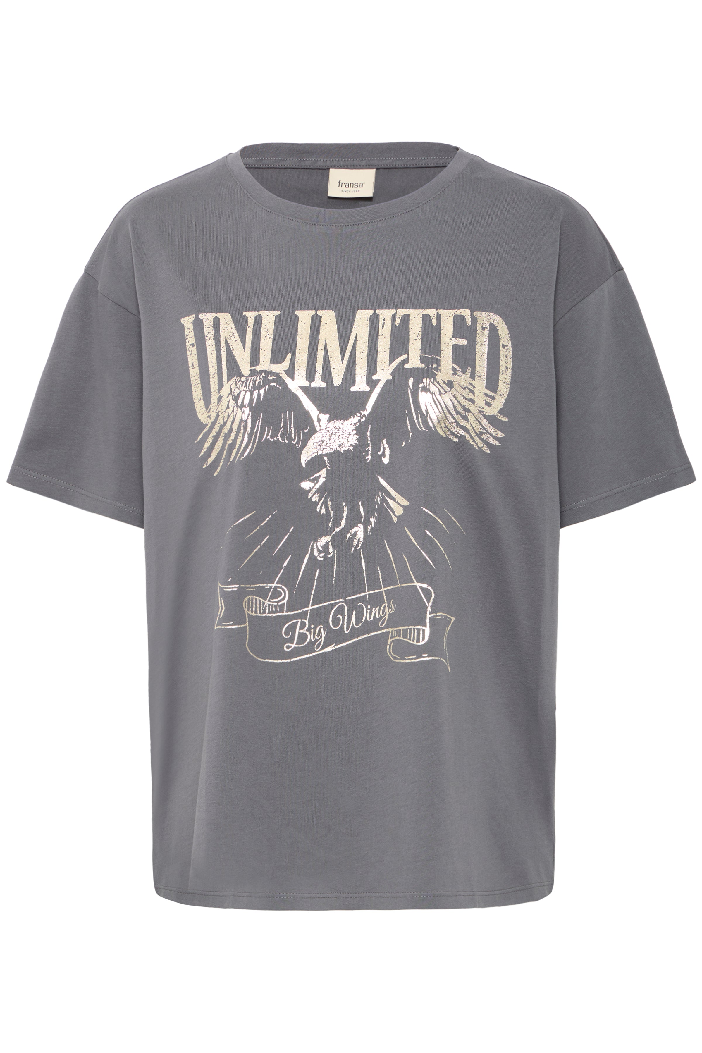 FRHAISLEY TEE 1 t-shirt fra FRANCA. Flot grå farve med guld-print foran. En klassisk T-shirt med super god pasform.