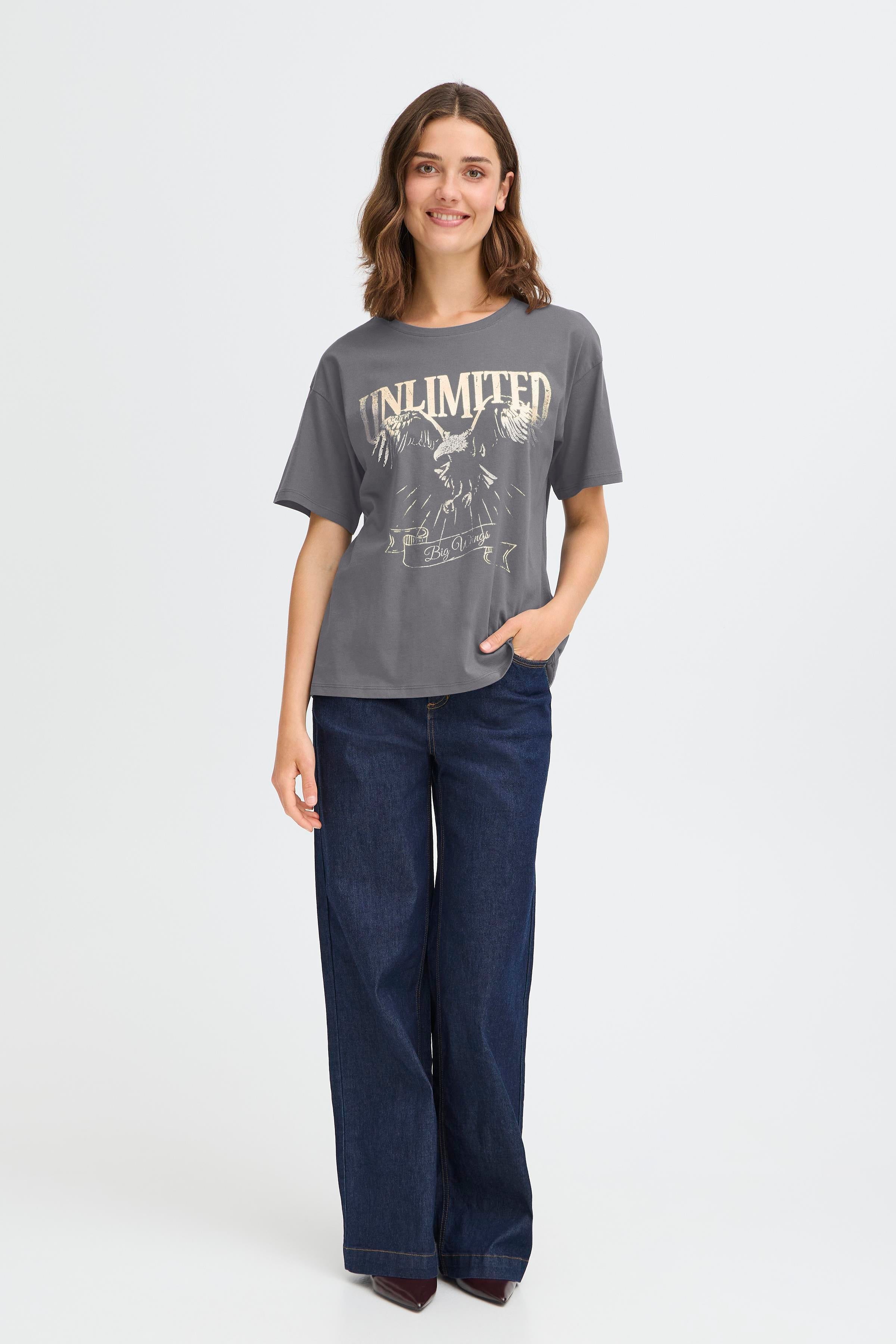 • FRHAISLEY TEE 1 t-shirt fra FRANCA. Flot grå farve med guld-print foran. En klassisk T-shirt med super god pasform.